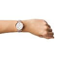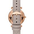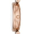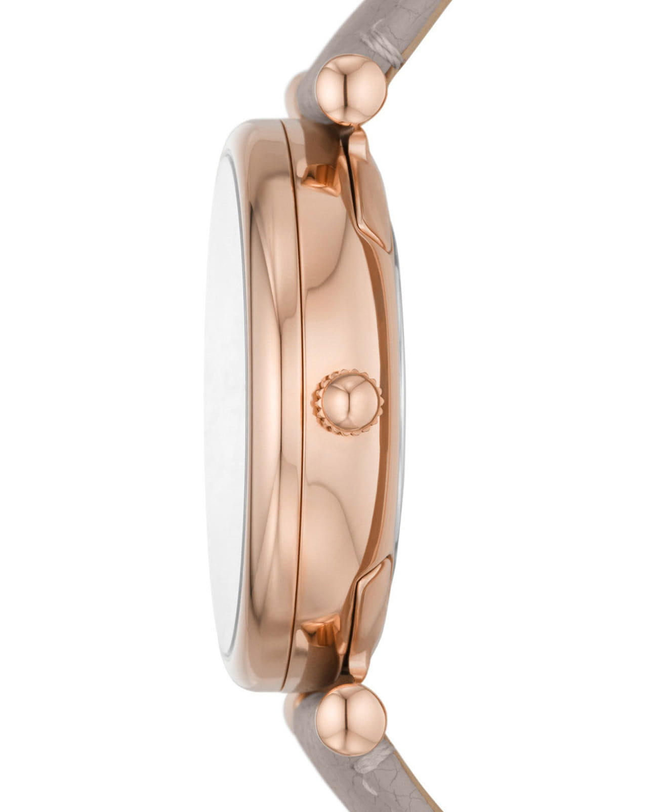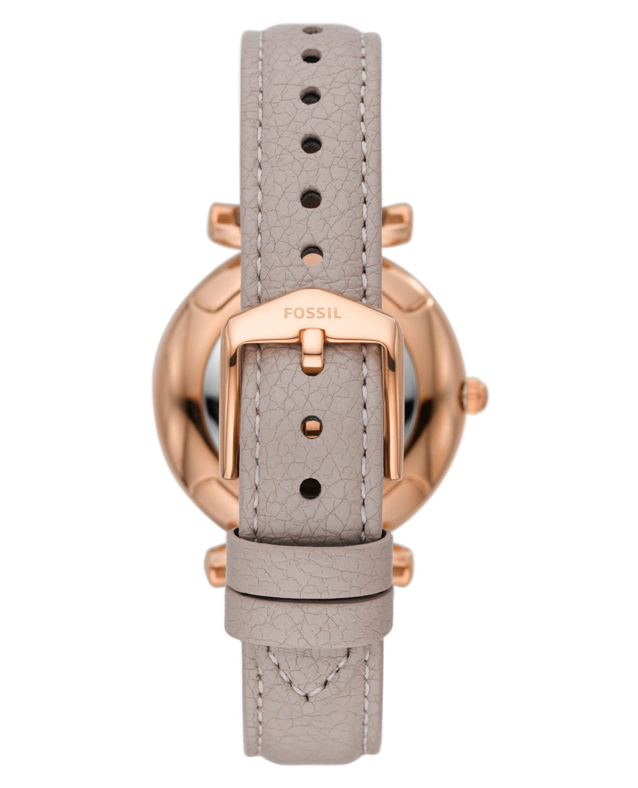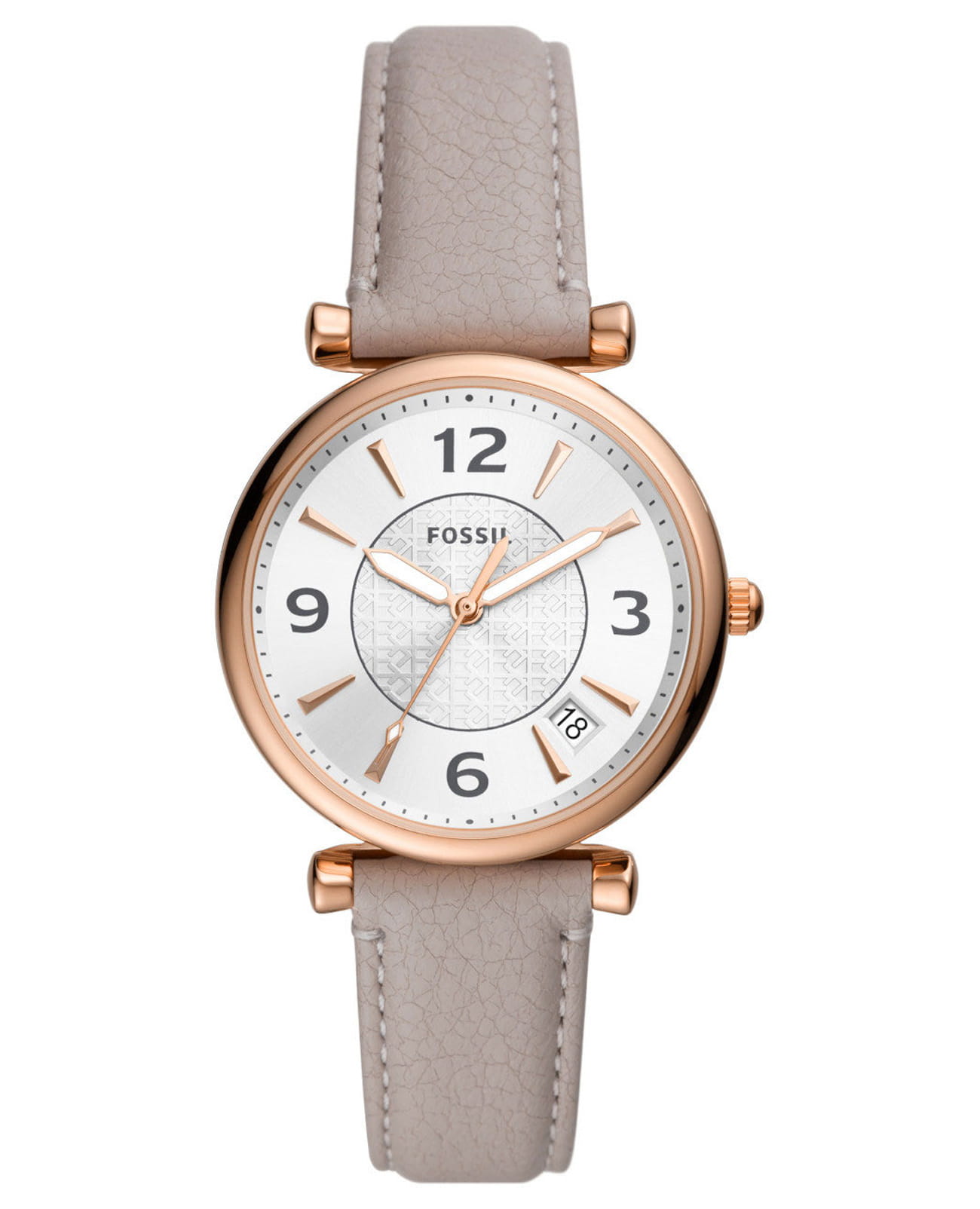 Женские американские часы  с минеральным стекломМинеральное стеклоМинеральное стекло представляет собой искусственно выращенный минерал кварца. Такое стекло отличается особой устойчивостью к повреждениям и царапинам. Уступает по некоторым качествам сапфировому стеклу. Fossil Carlie ES5161, кварцевый механизм с высокой точностью. Корпус часов изготовлен из нержавеющей стали  с IP-покрытиемIP-покрытиеМетод ионного напыления. Демонстрирует повышенную устойчивость к истиранию, окислению и химическим веществам. Под воздействием высокого давления и температуры около 1500°C молекулы металла надёжно соединяются с частицами корпуса часов.. Метки в виде арабских цифр и штрихов. Окошко даты на 4,5 часа. Стрелки с люминесцентным покрытиемЛюминесцентное покрытиеПозволяет считывать показания времени в темноте. Производители наносят на стрелки, часовые индексы, безель или поверхность циферблата светонакопительный состав, дающий холодное свечение.. Рифленая заводная головка с защитой. Класс водозащиты: 50 метров, позволит защитить корпус от случайных брызг или капель дождя. Кожаный ремешок на стандартной застежке.