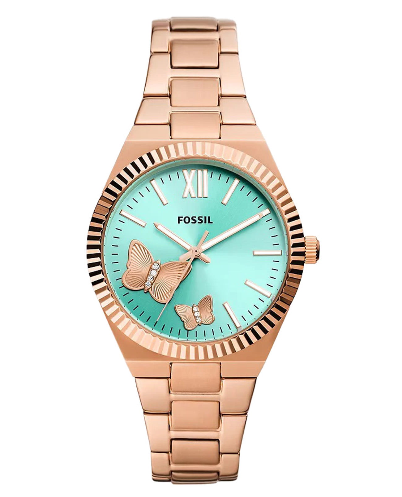 Женские американские часы с минеральным стекломМинеральное стеклоМинеральное стекло представляет собой искусственно выращенный минерал кварца. Такое стекло отличается особой устойчивостью к повреждениям и царапинам. Уступает по некоторым качествам сапфировому стеклу. Fossil Scarlette ES5277, кварцевый механизм с высокой точностью. Корпус и браслет часов изготовлены из нержавеющей стали с IP-покрытиемIP-покрытиеМетод ионного напыления. Демонстрирует повышенную устойчивость к истиранию, окислению и химическим веществам. Под воздействием высокого давления и температуры около 1500°C молекулы металла надёжно соединяются с частицами корпуса часов.. Циферблат украшен объемным изображением бабочек. Метки в виде штрихов и римской цифры. Рифленая заводная головка с защитой. Класс водозащиты: 50 метров, позволит защитить корпус от случайных брызг или капель дождя. Стальной браслет на раскладной застёжкеРаскладная застёжкаТакой тип застёжки используется только на браслетах из металла. Она никогда не раскрывается полностью, происходит разделение на 2 и более частей. Раскладывающая застёжка снизит вероятность потери часов к минимуму..