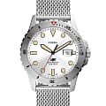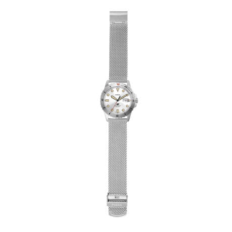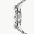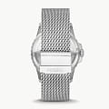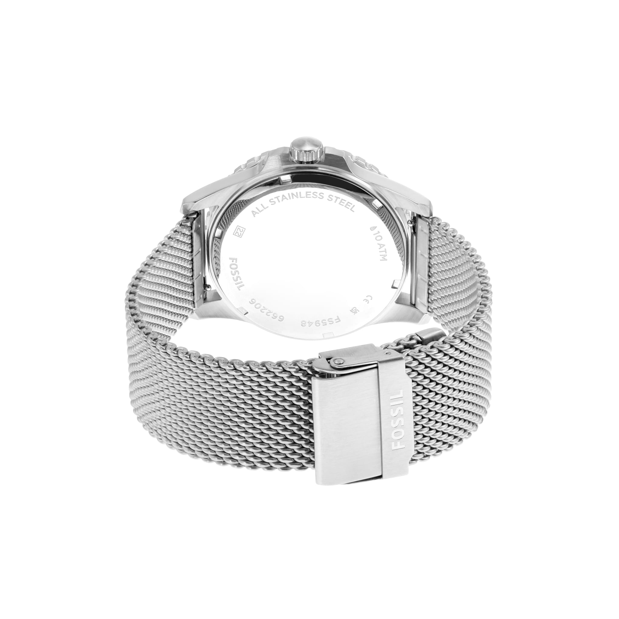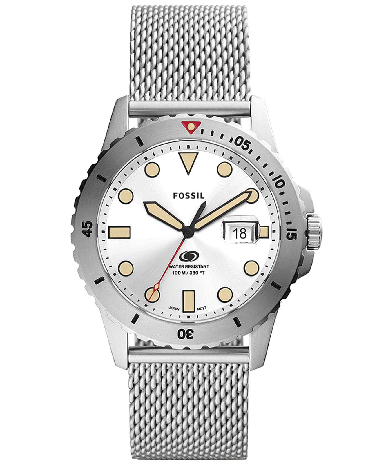 Мужские наручные часы с минеральным стекломМинеральное стеклоМинеральное стекло представляет собой искусственно выращенный минерал кварца. Такое стекло отличается особой устойчивостью к повреждениям и царапинам. Уступает по некоторым качествам сапфировому стеклу. Fossil Blue FS5948, кварцевый механизм с высокой точностью. Класс водозащиты: 100 метров, позволит плавать, нырять и заниматься другими водными видами спорта. Корпус часов изготовлен из стали. Метки в виде точек на циферблате и окошко даты находится в положении 3 часа. Ремешок из стали серебристого цвета на раскладывающейся застёжкеРаскладная застёжкаТакой тип застёжки используется только на браслетах из металла. Она никогда не раскрывается полностью, происходит разделение на 2 и более частей. Раскладывающая застёжка снизит вероятность потери часов к минимуму..Стрелки и метки с люминесцентным покрытиемЛюминесцентное покрытиеПозволяет считывать показания времени в темноте. Производители наносят на стрелки, часовые индексы, безель или поверхность циферблата светонакопительный состав, дающий холодное свечение.. Вращающийся стальной безельБезельВнешний ободок, закрепляющий стекло. В спортивных часах так называется поворотное кольцо с делениями на циферблате, выполняет роль таймера – замеряет отрезки времени на шкале. Неподвижный безель – элемент декора. Однонаправленно вращающийся безель на дайверских часах позволяет фиксировать моменты погружения и выныривания на поверхность..