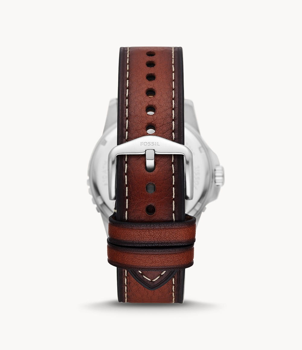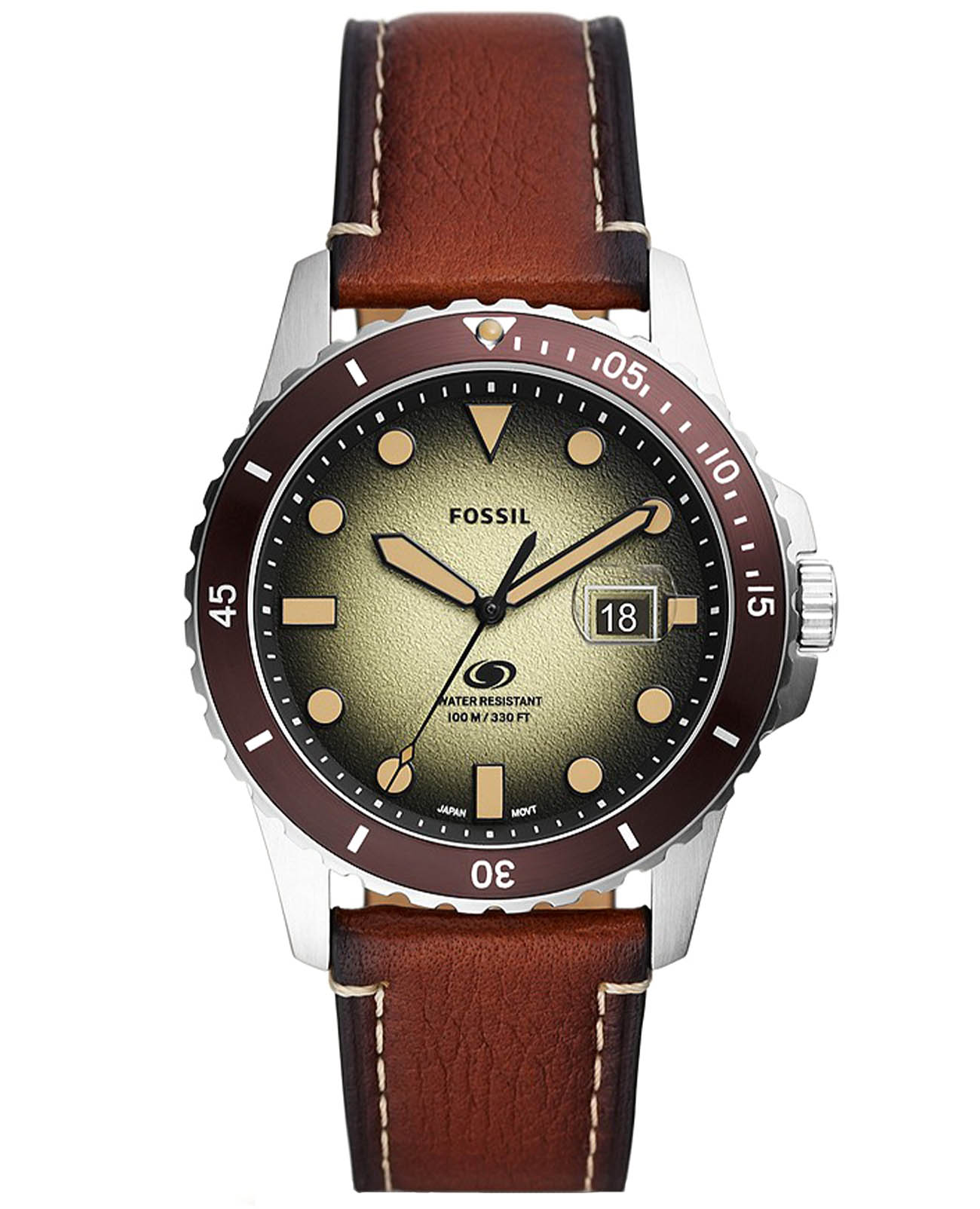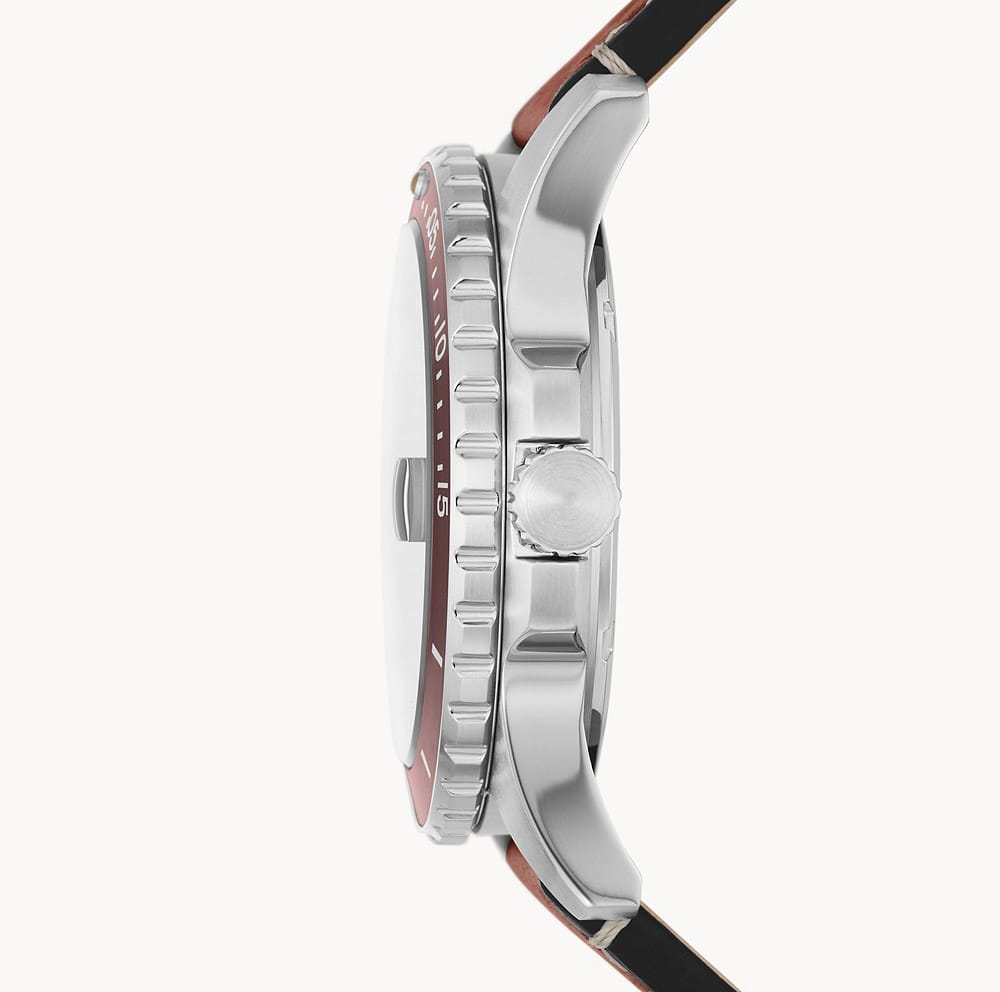 Мужские наручные часы на кожаном ремешке Fossil Blue FS5961, кварцевый механизм с высокой точностью. Класс водозащиты: 100 метров, позволит плавать, нырять и заниматься другими водными видами спорта. Корпус часов изготовлен из стали с IP-покрытиемIP-покрытиеМетод ионного напыления. Демонстрирует повышенную устойчивость к истиранию, окислению и химическим веществам. Под воздействием высокого давления и температуры около 1500°C молекулы металла надёжно соединяются с частицами корпуса часов. цвета. Метки в виде точек на циферблате и окошко даты находится в положении 3 часа. Ремешок из экокожи с классической застежкой. Рифленый безельБезельВнешний ободок, закрепляющий стекло. В спортивных часах так называется поворотное кольцо с делениями на циферблате, выполняет роль таймера – замеряет отрезки времени на шкале. Неподвижный безель – элемент декора. Однонаправленно вращающийся безель на дайверских часах позволяет фиксировать моменты погружения и выныривания на поверхность. с минутной шкалой. Градиентный циферблат.