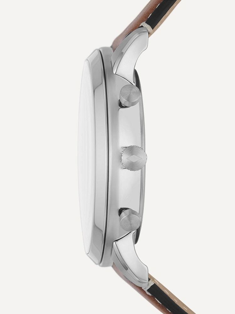 Мужские американские часы-хронографХронографФункция позволяет измерять отрезки времени с особой точностью: часы, минуты, секунды. Верным признаком хронографа является наличие на циферблате 3 дополнительных окошек-счётчиков. с секундомеромСекундомерСекундоме́р — прибор, способный измерять интервалы времени с точностью до долей секунды. Fossil Neutra FS5963, кварцевый механизм с высокой точностью. Класс водозащиты: 50 метров, позволит защитить корпус от случайных брызг или капель дождя. Корпус часов изготовлен из стали. Метки в виде штрихов, 6 и 12 часовые метки в виде римских цифр. Окошко даты находится между часовыми отметками 4 и 5. Рифленая заводная головка. Ремешок из эко-кожи с классической застежкой.