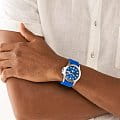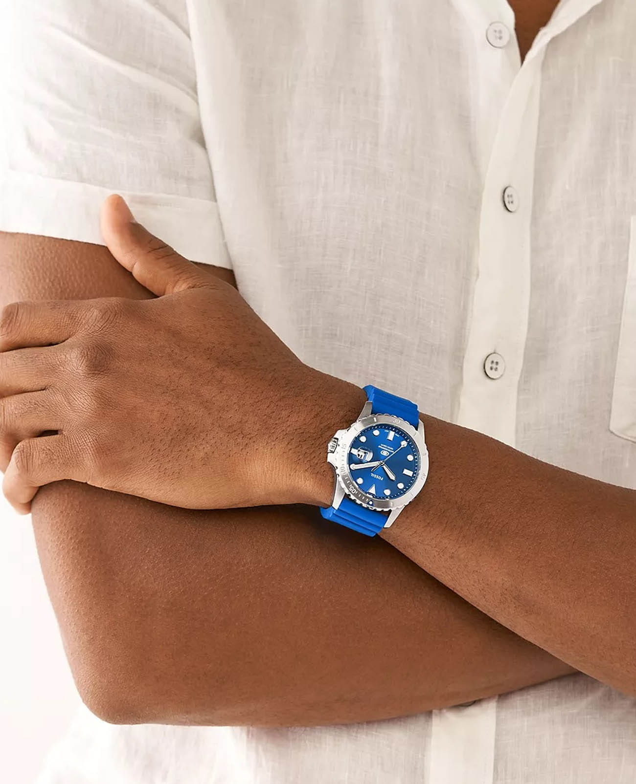 Мужские американские часы с минеральным стекломМинеральное стеклоМинеральное стекло представляет собой искусственно выращенный минерал кварца. Такое стекло отличается особой устойчивостью к повреждениям и царапинам. Уступает по некоторым качествам сапфировому стеклу. Fossil Blue FS5998, кварцевый механизм с высокой точностью. Корпус часов изготовлен из нержавеющей стали. Вращающийся безельБезельВнешний ободок, закрепляющий стекло. В спортивных часах так называется поворотное кольцо с делениями на циферблате, выполняет роль таймера – замеряет отрезки времени на шкале. Неподвижный безель – элемент декора. Однонаправленно вращающийся безель на дайверских часах позволяет фиксировать моменты погружения и выныривания на поверхность.. Метки и стрелки с люминесцентным покрытиемЛюминесцентное покрытиеПозволяет считывать показания времени в темноте. Производители наносят на стрелки, часовые индексы, безель или поверхность циферблата светонакопительный состав, дающий холодное свечение.. Окошко даты находится в положении 3 часа. Рифленая заводная головка с защитой. Класс водозащиты: 100 метров, позволит плавать, нырять и заниматься другими водными видами спорта. Силиконовый ремешок на стандартной застёжке.