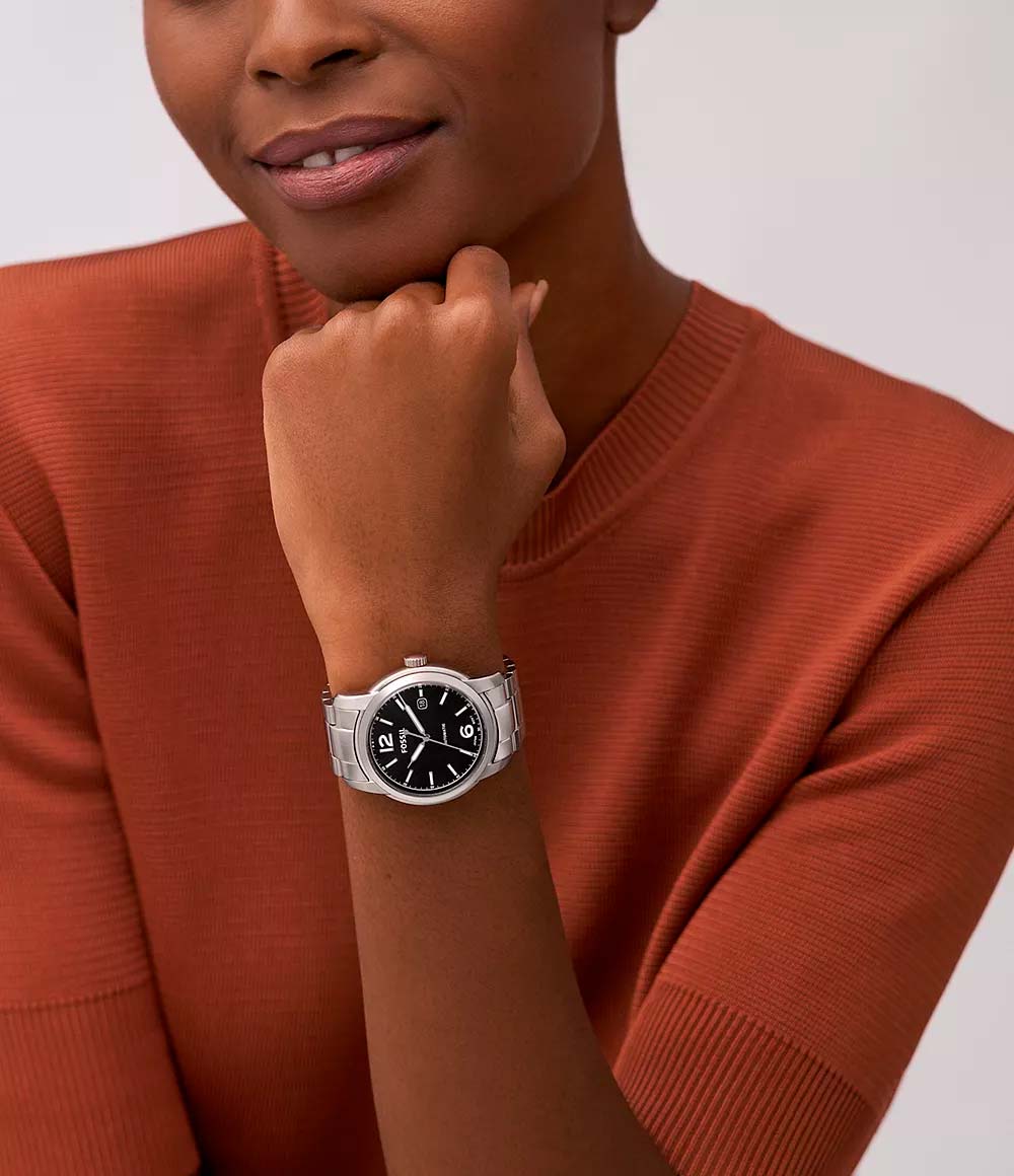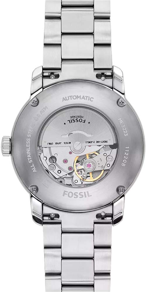 Наручные часы Fossil Heritage ME3223 с надёжным автоматическим механизмом. Корпус и браслет часов изготовлены из нержавеющей стали. Минеральное стеклоМинеральное стеклоМинеральное стекло представляет собой искусственно выращенный минерал кварца. Такое стекло отличается особой устойчивостью к повреждениям и царапинам. Уступает по некоторым качествам сапфировому стеклу. устойчивое к мелким механическим повреждениям. Стальной браслет на раскладной застёжкеРаскладная застёжкаТакой тип застёжки используется только на браслетах из металла. Она никогда не раскрывается полностью, происходит разделение на 2 и более частей. Раскладывающая застёжка снизит вероятность потери часов к минимуму.. Класс водозащиты: 50 метров, позволит защитить корпус от случайных брызг или капель дождя. Стрелки и метки с люминесцентным покрытиемЛюминесцентное покрытиеПозволяет считывать показания времени в темноте. Производители наносят на стрелки, часовые индексы, безель или поверхность циферблата светонакопительный состав, дающий холодное свечение.. Окошко даты находится в положении 3 часа.