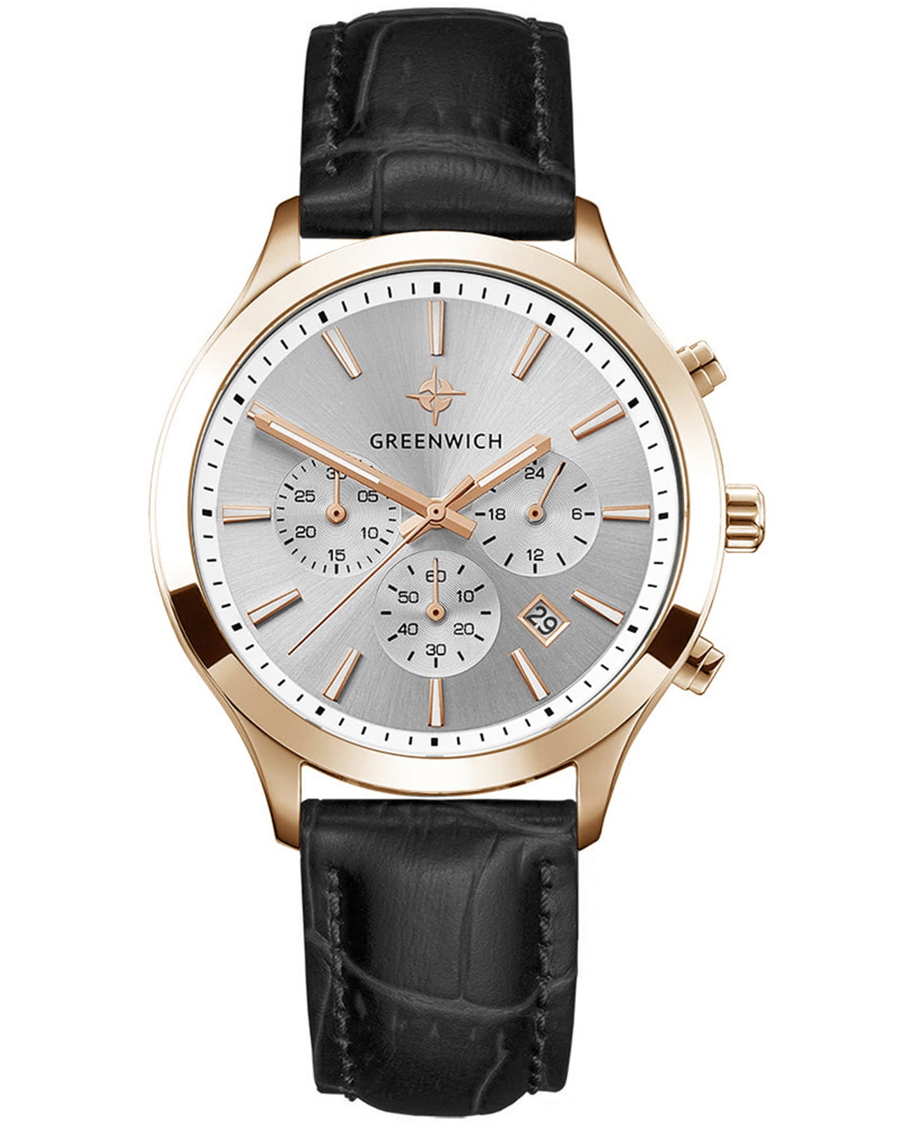Мужские наручные часы-хронографХронографФункция позволяет измерять отрезки времени с особой точностью: часы, минуты, секунды. Верным признаком хронографа является наличие на циферблате 3 дополнительных окошек-счётчиков. Greenwich Skipper GW 043.41.33 представляют собой классический вариант для повседневной носки. Циферблат украшается брендовым логотипом, изображающим Розу Ветров. Эмблема мореплавательского духа символизирует удачу, стремление достигнуть поставленной цели. Часы характеризуются традиционными формами, лаконичным исполнением, что делает модель элегантным дополнением к деловому костюму. Надёжный корпус из нержавеющей стали с PVD-покрытиемPVDУльтратонкое покрытие наносится в технике вакуумного напыления, сочетает в себе нитрид титана особой прочности со слоем золота или оксида хрома. Несёт в себе декоративную или защитную функцию. спасает японский механизм от повреждений и ударов. Минеральное стеклоМинеральное стеклоМинеральное стекло представляет собой искусственно выращенный минерал кварца. Такое стекло отличается особой устойчивостью к повреждениям и царапинам. Уступает по некоторым качествам сапфировому стеклу. отличается устойчивостью к образованию царапин на поверхности. СекундомерСекундомерСекундоме́р — прибор, способный измерять интервалы времени с точностью до долей секунды.. Стрелки и метки с люминесцентным покрытиемЛюминесцентное покрытиеПозволяет считывать показания времени в темноте. Производители наносят на стрелки, часовые индексы, безель или поверхность циферблата светонакопительный состав, дающий холодное свечение.. Кожаный ремешок на стандартной застёжке. Окошко даты находится в положении между 4 и 5 часов. Класс водозащиты: 100 метров, позволит плавать, нырять и заниматься другими водными видами спорта.