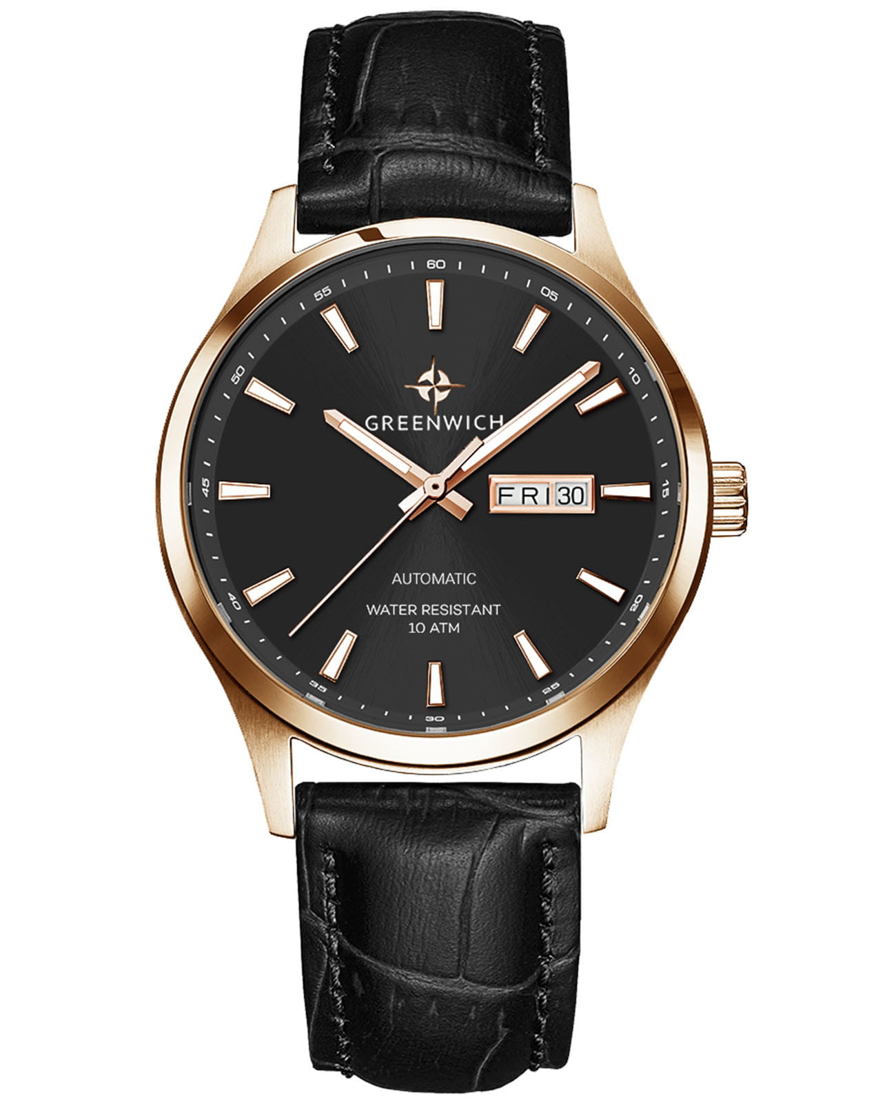 Мужские часы Greenwich Good Luck GW 054.41.31, механический механизм (автоматический калибр) с высокой точностью. Классический круглый стальной корпус с PVD-покрытиемPVDУльтратонкое покрытие наносится в технике вакуумного напыления, сочетает в себе нитрид титана особой прочности со слоем золота или оксида хрома. Несёт в себе декоративную или защитную функцию., защищенный минеральным стекломМинеральное стеклоМинеральное стекло представляет собой искусственно выращенный минерал кварца. Такое стекло отличается особой устойчивостью к повреждениям и царапинам. Уступает по некоторым качествам сапфировому стеклу.. Стрелки и метки с люминесцентным покрытиемЛюминесцентное покрытиеПозволяет считывать показания времени в темноте. Производители наносят на стрелки, часовые индексы, безель или поверхность циферблата светонакопительный состав, дающий холодное свечение.. Кожаный ремешок на стандартной застёжке. Класс водозащиты: 100 метров, позволит плавать, нырять и заниматься другими водными видами спорта. Окошко даты и дня недели находится в положении 3 часа.