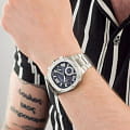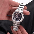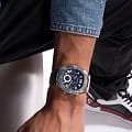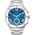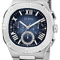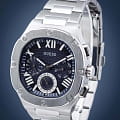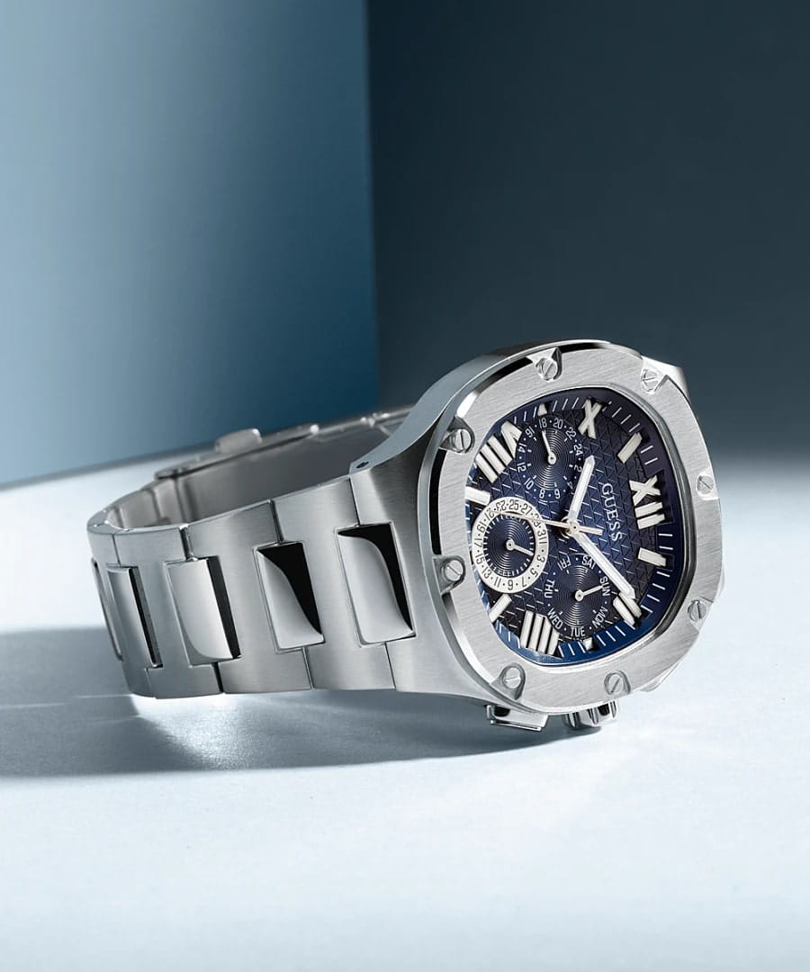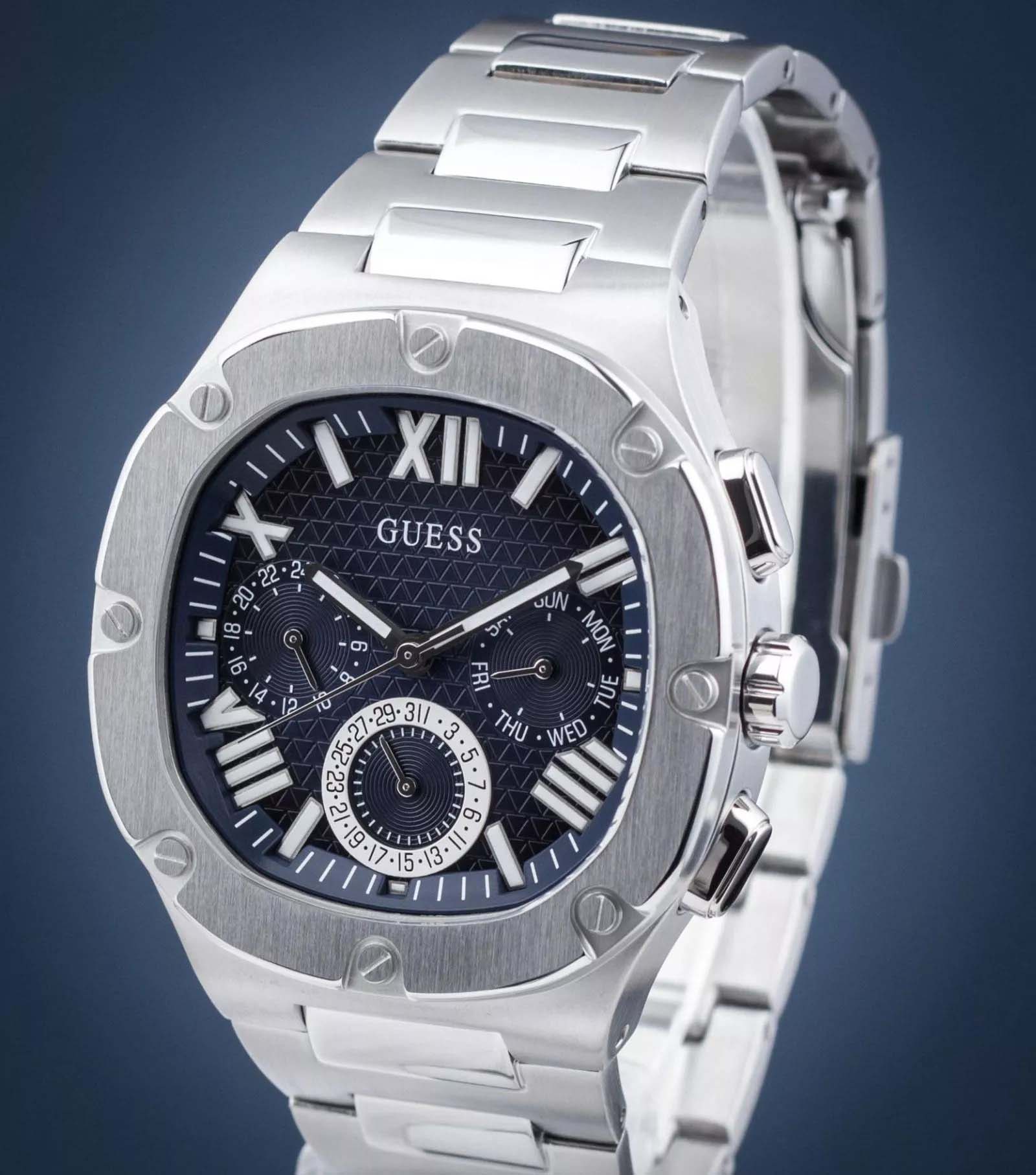 Мужские наручные часы Guess Headline GW0572G1 с минеральным стекломМинеральное стеклоМинеральное стекло представляет собой искусственно выращенный минерал кварца. Такое стекло отличается особой устойчивостью к повреждениям и царапинам. Уступает по некоторым качествам сапфировому стеклу., кварцевый механизм с высокой точностью. Класс водозащиты: 50 метров, позволит защитить корпус от случайных брызг или капель дождя. Стрелки с люминесцентным покрытиемЛюминесцентное покрытиеПозволяет считывать показания времени в темноте. Производители наносят на стрелки, часовые индексы, безель или поверхность циферблата светонакопительный состав, дающий холодное свечение.. Корпус часов и безельБезельВнешний ободок, закрепляющий стекло. В спортивных часах так называется поворотное кольцо с делениями на циферблате, выполняет роль таймера – замеряет отрезки времени на шкале. Неподвижный безель – элемент декора. Однонаправленно вращающийся безель на дайверских часах позволяет фиксировать моменты погружения и выныривания на поверхность. изготовлены из стали. Стальной браслет на раскладной застёжкеРаскладная застёжкаТакой тип застёжки используется только на браслетах из металла. Она никогда не раскрывается полностью, происходит разделение на 2 и более частей. Раскладывающая застёжка снизит вероятность потери часов к минимуму.. Рифленая заводная головка. Гильошированный циферблат. 24-х часовой формат времени, число и день недели отображаются на отдельных циферблатах. Метки в виде римских цифр и штрихов.