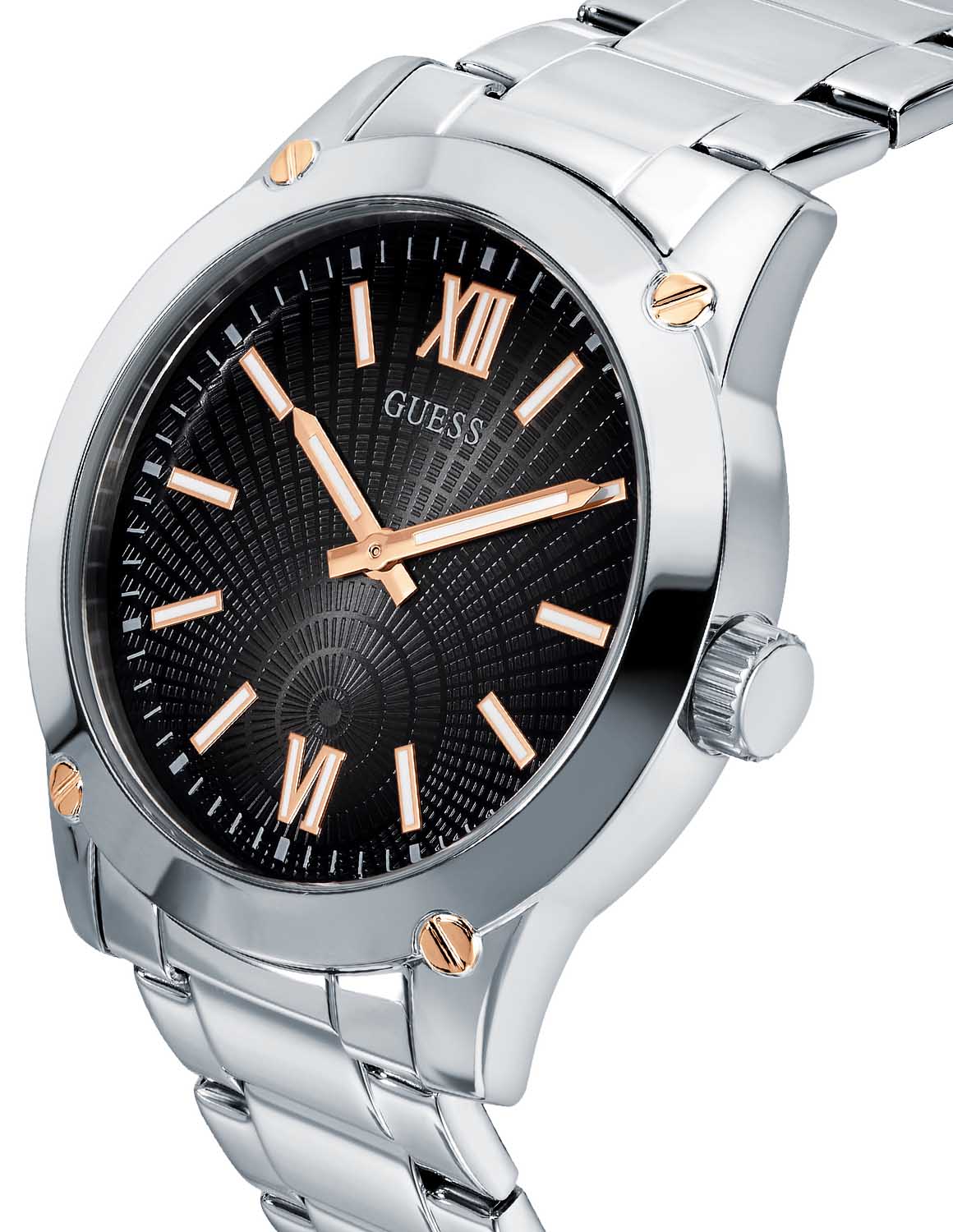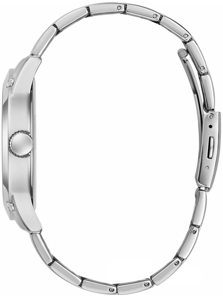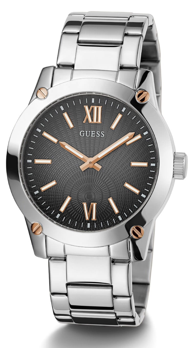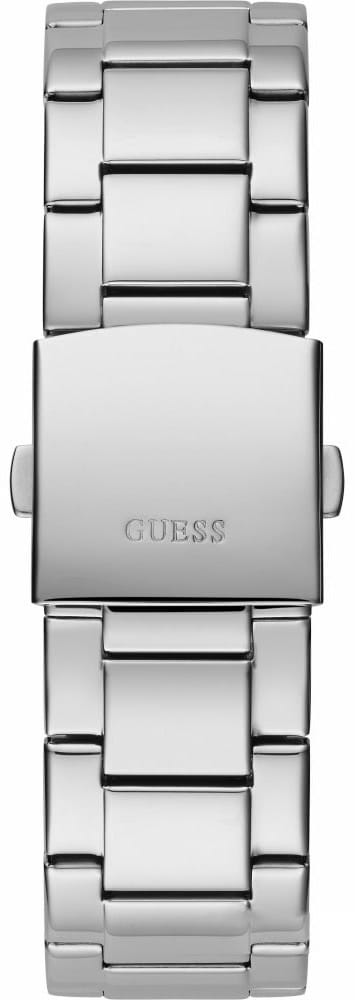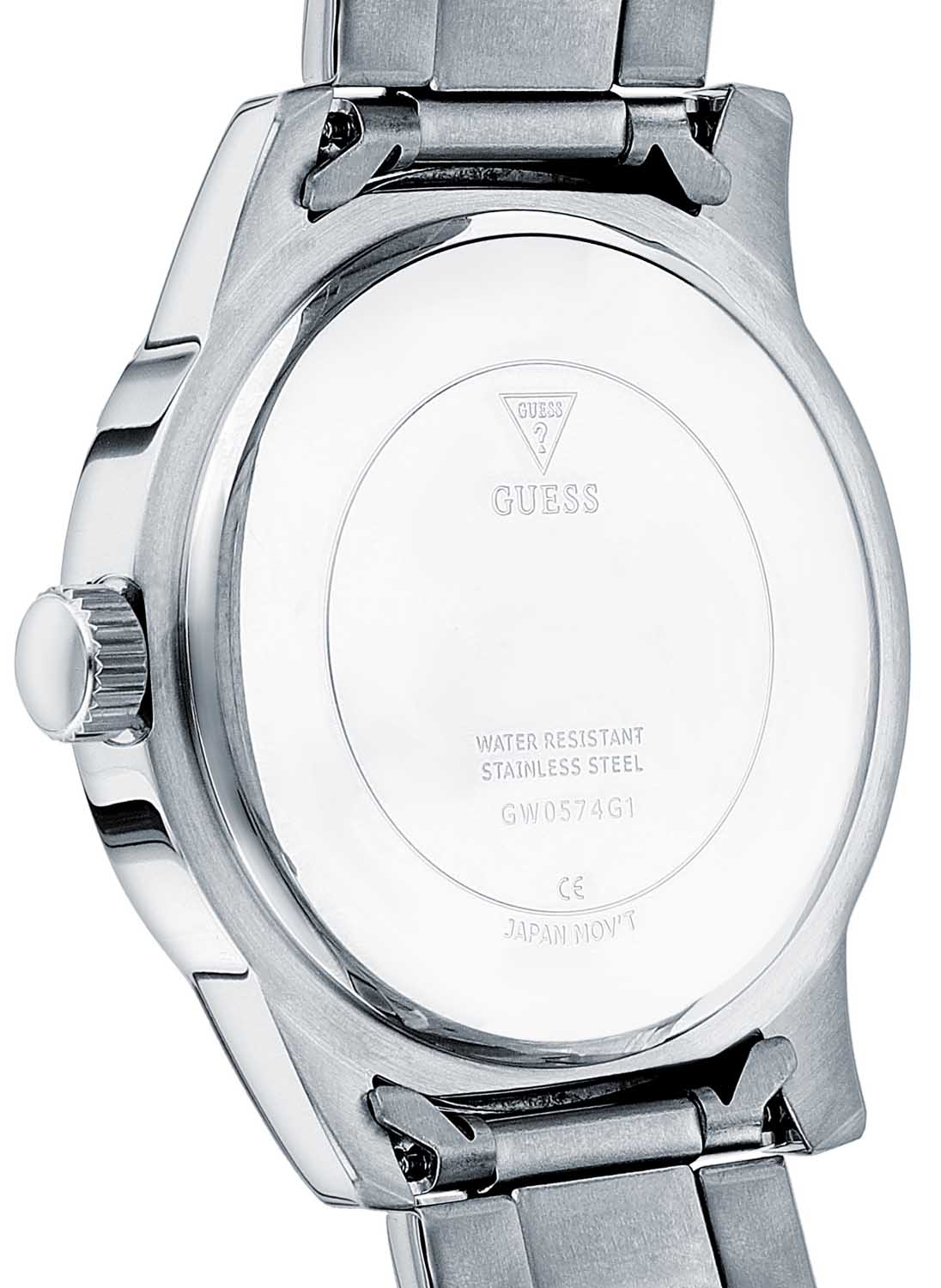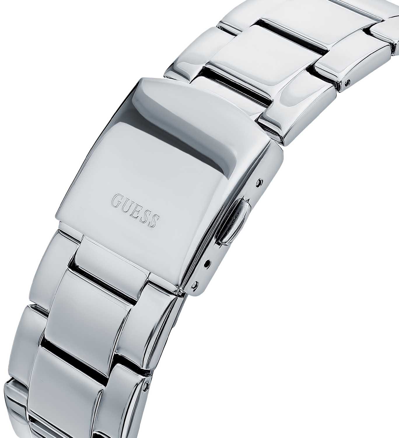Мужские наручные часы Guess Crescent GW0574G1 с минеральным стекломМинеральное стеклоМинеральное стекло представляет собой искусственно выращенный минерал кварца. Такое стекло отличается особой устойчивостью к повреждениям и царапинам. Уступает по некоторым качествам сапфировому стеклу., кварцевый механизм с высокой точностью. Класс водозащиты: 50 метров, позволит защитить корпус от случайных брызг или капель дождя. Корпус часов и безельБезельВнешний ободок, закрепляющий стекло. В спортивных часах так называется поворотное кольцо с делениями на циферблате, выполняет роль таймера – замеряет отрезки времени на шкале. Неподвижный безель – элемент декора. Однонаправленно вращающийся безель на дайверских часах позволяет фиксировать моменты погружения и выныривания на поверхность. изготовлены из стали. Стальной браслет на раскладной застёжкеРаскладная застёжкаТакой тип застёжки используется только на браслетах из металла. Она никогда не раскрывается полностью, происходит разделение на 2 и более частей. Раскладывающая застёжка снизит вероятность потери часов к минимуму.. Гильошированный циферблат. Метки в виде штрихов и римских цифр. Рифленая заводная головка. Стрелки с люминесцентным покрытиемЛюминесцентное покрытиеПозволяет считывать показания времени в темноте. Производители наносят на стрелки, часовые индексы, безель или поверхность циферблата светонакопительный состав, дающий холодное свечение..