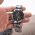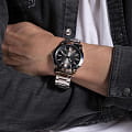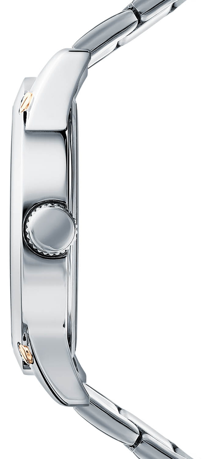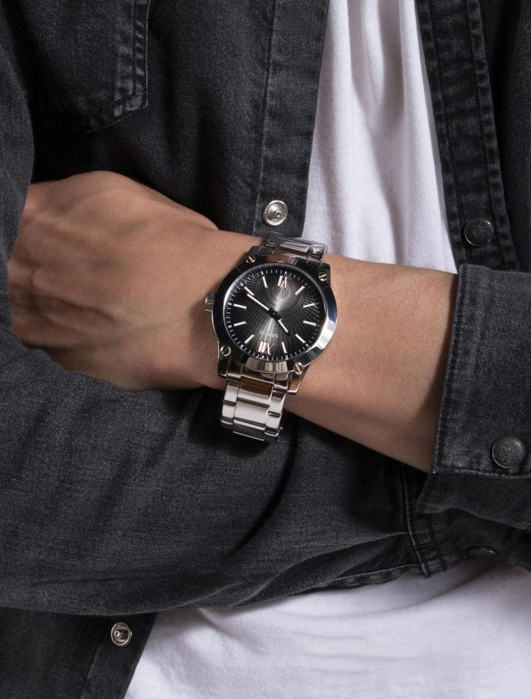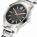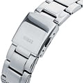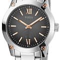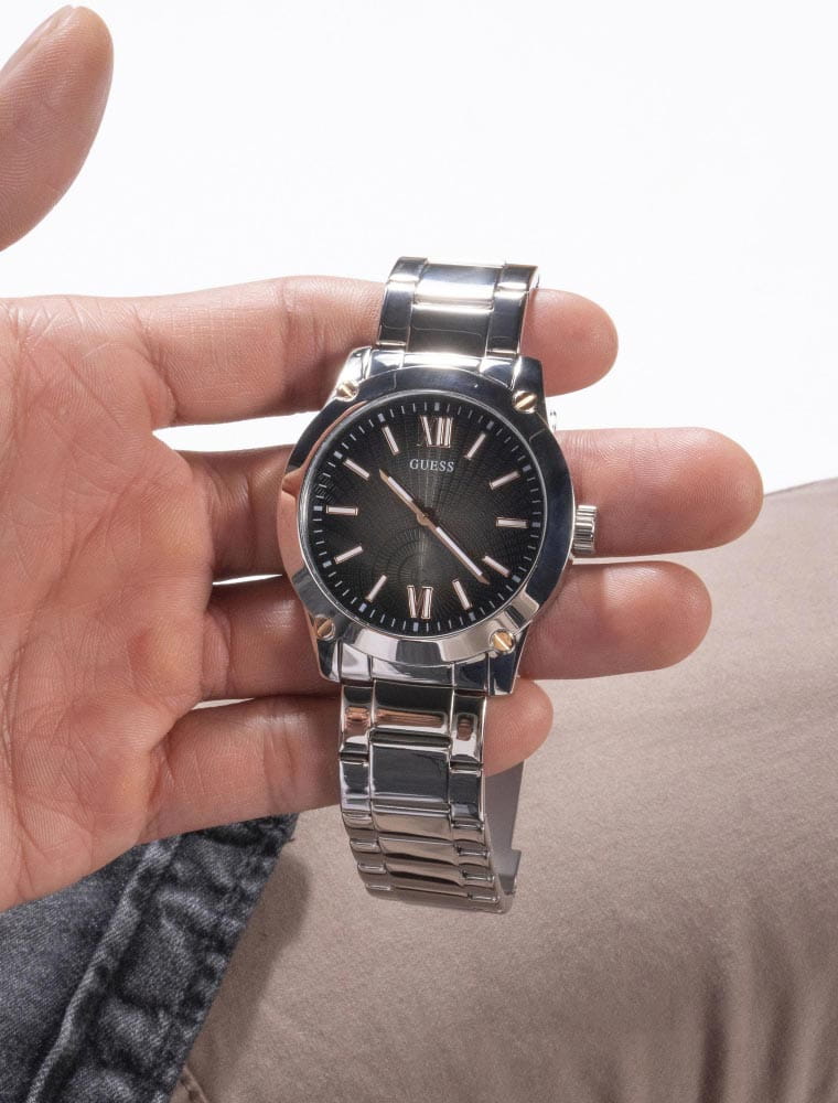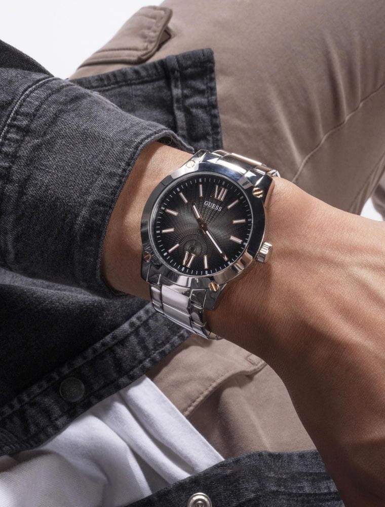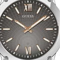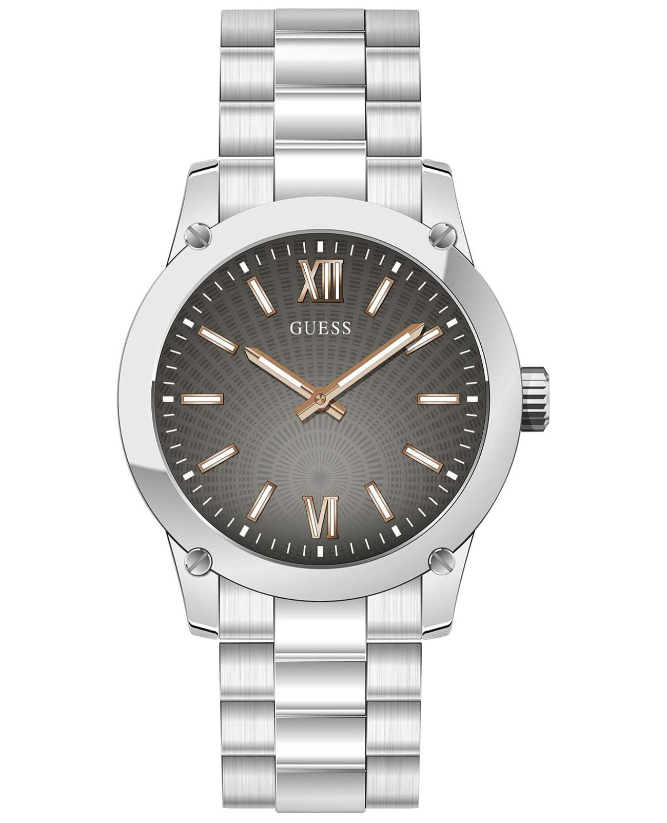 Мужские наручные часы Guess Crescent GW0574G1 с минеральным стекломМинеральное стеклоМинеральное стекло представляет собой искусственно выращенный минерал кварца. Такое стекло отличается особой устойчивостью к повреждениям и царапинам. Уступает по некоторым качествам сапфировому стеклу., кварцевый механизм с высокой точностью. Класс водозащиты: 50 метров, позволит защитить корпус от случайных брызг или капель дождя. Корпус часов и безельБезельВнешний ободок, закрепляющий стекло. В спортивных часах так называется поворотное кольцо с делениями на циферблате, выполняет роль таймера – замеряет отрезки времени на шкале. Неподвижный безель – элемент декора. Однонаправленно вращающийся безель на дайверских часах позволяет фиксировать моменты погружения и выныривания на поверхность. изготовлены из стали. Стальной браслет на раскладной застёжкеРаскладная застёжкаТакой тип застёжки используется только на браслетах из металла. Она никогда не раскрывается полностью, происходит разделение на 2 и более частей. Раскладывающая застёжка снизит вероятность потери часов к минимуму.. Гильошированный циферблат. Метки в виде штрихов и римских цифр. Рифленая заводная головка. Стрелки с люминесцентным покрытиемЛюминесцентное покрытиеПозволяет считывать показания времени в темноте. Производители наносят на стрелки, часовые индексы, безель или поверхность циферблата светонакопительный состав, дающий холодное свечение..