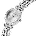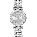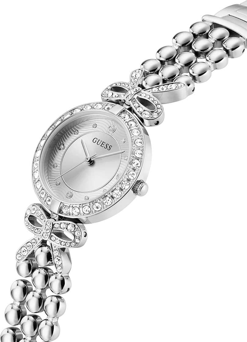 Часы Guess GW0838L1 — это уникальный аксессуар, который подчеркнет вашу индивидуальность и стиль, прекрасно дополняя как повседневный, так и вечерний образ. Эти женские часы оснащены надежным кварцевым механизмом, который гарантирует точность и долговечность. Круглый стальной корпус с полированной поверхностью, диаметром 30 мм и толщиной 8 мм, придает часам изысканный и современный вид. БезельБезельВнешний ободок, закрепляющий стекло. В спортивных часах так называется поворотное кольцо с делениями на циферблате, выполняет роль таймера – замеряет отрезки времени на шкале. Неподвижный безель – элемент декора. Однонаправленно вращающийся безель на дайверских часах позволяет фиксировать моменты погружения и выныривания на поверхность. инкрустирован кристаллами, что добавляет модели роскошь и блеск. Серебристый циферблат, выполненный по технологии Sunray, украшен гильошированием в зоне меток и инкрустирован кристаллами, что создает эффект солнечных лучей. Метки в виде точек с кристаллами подчеркивают утонченность дизайна. Часы оснащены рифленой заводной головкой для удобного управления. Оригинальный стальной браслет с ювелирной застежкой украшенный кристаллами, обеспечивает комфортное ношение и надежную фиксацию на запястье. Водозащита 30WR позволяет часам выдерживать случайные брызги, а минеральное стеклоМинеральное стеклоМинеральное стекло представляет собой искусственно выращенный минерал кварца. Такое стекло отличается особой устойчивостью к повреждениям и царапинам. Уступает по некоторым качествам сапфировому стеклу. защищает циферблат от царапин. Эти часы станут стильным и оригинальным дополнением для любого случая, подчеркивая вашу элегантность и современный стиль.