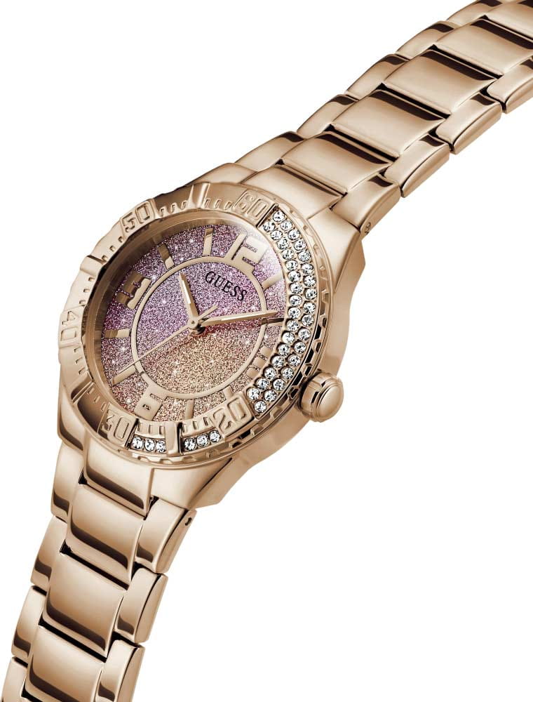 Элегантные женские наручные часы Guess GW0882L3 сочетают в себе стиль и функциональность. Эти часы оснащены точным кварцевым механизмом, что гарантирует надежность и долговечность. Корпус часов выполнен из прочной нержавеющей стали с IP-покрытиемIP-покрытиеМетод ионного напыления. Демонстрирует повышенную устойчивость к истиранию, окислению и химическим веществам. Под воздействием высокого давления и температуры около 1500°C молекулы металла надёжно соединяются с частицами корпуса часов. цвета розового золота, диаметром 36 мм, а безельБезельВнешний ободок, закрепляющий стекло. В спортивных часах так называется поворотное кольцо с делениями на циферблате, выполняет роль таймера – замеряет отрезки времени на шкале. Неподвижный безель – элемент декора. Однонаправленно вращающийся безель на дайверских часах позволяет фиксировать моменты погружения и выныривания на поверхность. украшен изысканными кристаллами, придающими им роскошный вид. Циферблат добавляет изделию утонченности и особого шарма. Часы оснащены стальным браслетом с IP-покрытиемIP-покрытиеМетод ионного напыления. Демонстрирует повышенную устойчивость к истиранию, окислению и химическим веществам. Под воздействием высокого давления и температуры около 1500°C молекулы металла надёжно соединяются с частицами корпуса часов. на раскладной застежкеРаскладная застёжкаТакой тип застёжки используется только на браслетах из металла. Она никогда не раскрывается полностью, происходит разделение на 2 и более частей. Раскладывающая застёжка снизит вероятность потери часов к минимуму., которая обеспечивает комфортное прилегание к запястью и надежную фиксацию. Люминесцентное покрытиеЛюминесцентное покрытиеПозволяет считывать показания времени в темноте. Производители наносят на стрелки, часовые индексы, безель или поверхность циферблата светонакопительный состав, дающий холодное свечение. на стрелках обеспечивает отличную видимость в темноте. Минеральное стеклоМинеральное стеклоМинеральное стекло представляет собой искусственно выращенный минерал кварца. Такое стекло отличается особой устойчивостью к повреждениям и царапинам. Уступает по некоторым качествам сапфировому стеклу. защищает циферблат от царапин и повреждений, сохраняя его безупречный вид. Водозащита 30WR гарантирует защиту от случайных брызг и дождя, что делает эти часы практичным аксессуаром для повседневной жизни. Рифленая заводная головка с защитой. Guess – это не просто аксессуар, это заявление о вашем безупречном вкусе и стремлении к совершенству.