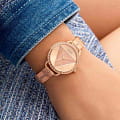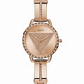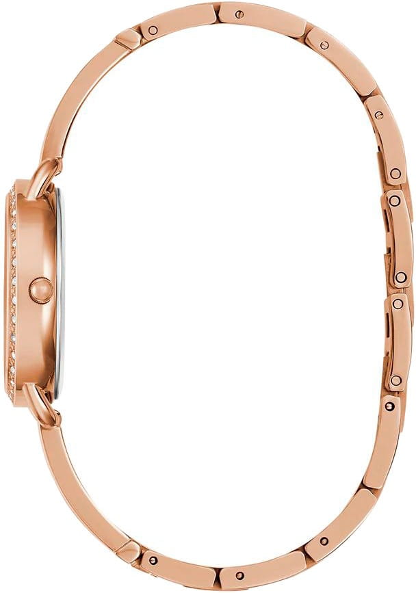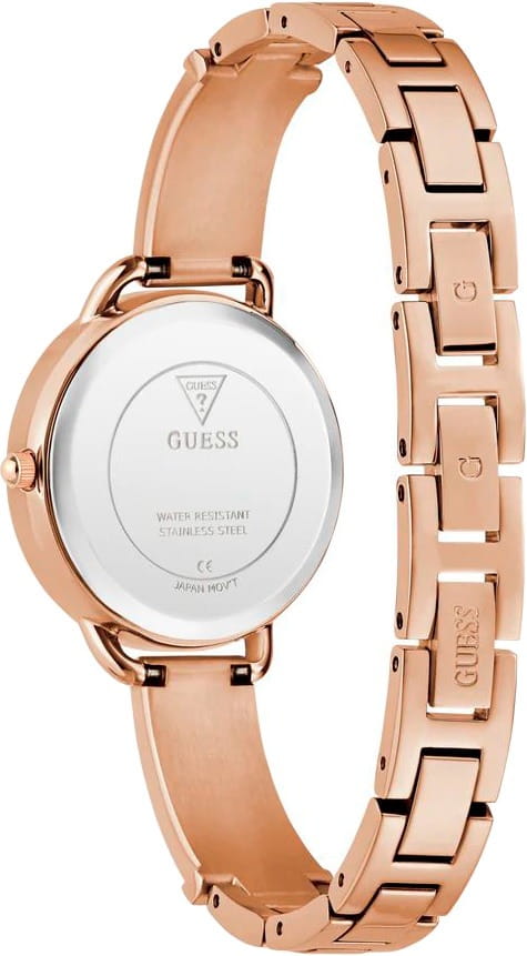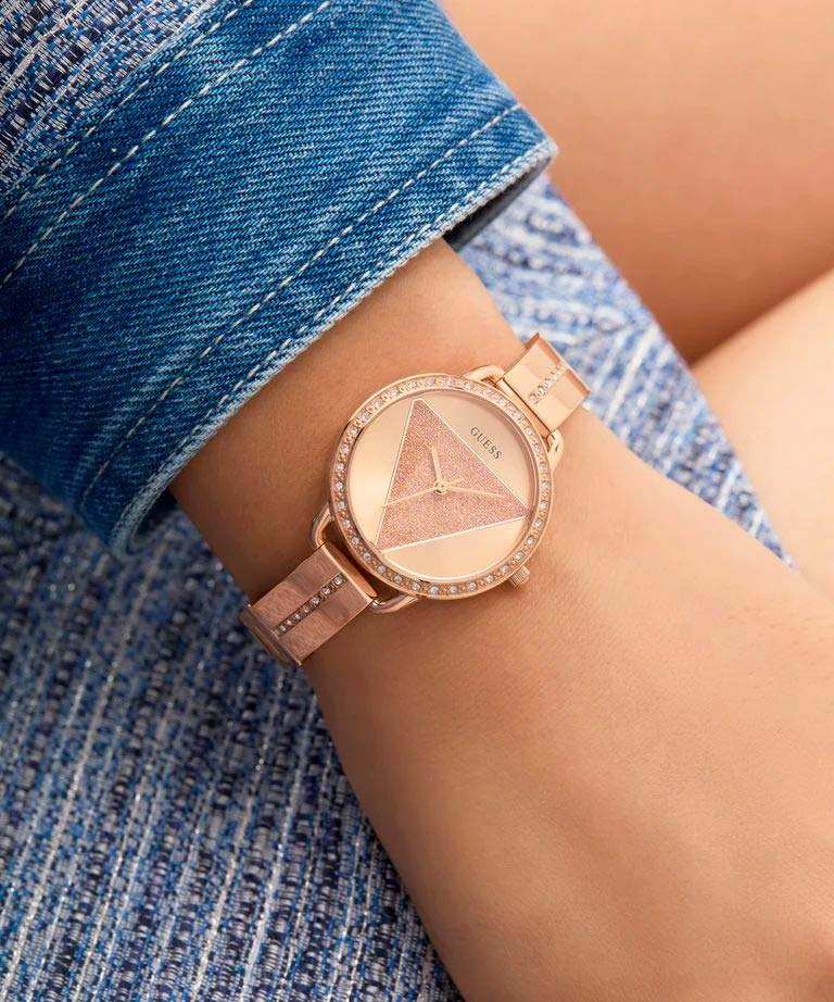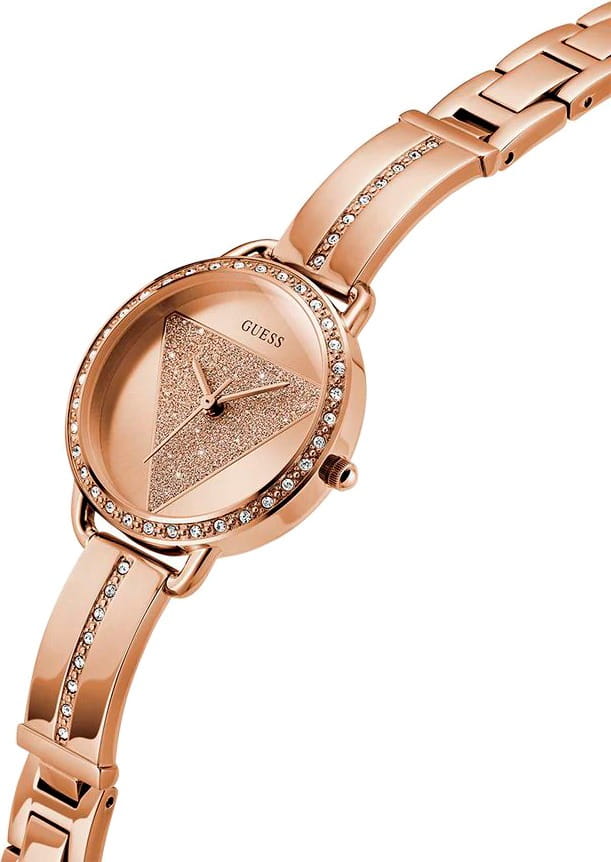 Часы Guess GW0914L3 — это стильный аксессуар, который подчеркивает современность и элегантность. Эти часы оснащены надежным кварцевым механизмом. Они имеют круглый корпус из нержавеющей стали с розово-золотистым IP-покрытиемIP-покрытиеМетод ионного напыления. Демонстрирует повышенную устойчивость к истиранию, окислению и химическим веществам. Под воздействием высокого давления и температуры около 1500°C молекулы металла надёжно соединяются с частицами корпуса часов., что придает им прочность и долговечность. Основное внимание привлекает безельБезельВнешний ободок, закрепляющий стекло. В спортивных часах так называется поворотное кольцо с делениями на циферблате, выполняет роль таймера – замеряет отрезки времени на шкале. Неподвижный безель – элемент декора. Однонаправленно вращающийся безель на дайверских часах позволяет фиксировать моменты погружения и выныривания на поверхность., украшенный кристальным паве, создающим эффектный блеск. Золотистый циферблат выполнен по технологии Sunray, что придает ему эффект солнечных лучей. Центр циферблата украшен глиттерным треугольником и логотипом GUESS, что добавляет уникальности и изысканности дизайну. Минеральное стеклоМинеральное стеклоМинеральное стекло представляет собой искусственно выращенный минерал кварца. Такое стекло отличается особой устойчивостью к повреждениям и царапинам. Уступает по некоторым качествам сапфировому стеклу. защищает циферблат от внешних воздействий. Стальной браслет с розово-золотистым IP-покрытиемIP-покрытиеМетод ионного напыления. Демонстрирует повышенную устойчивость к истиранию, окислению и химическим веществам. Под воздействием высокого давления и температуры около 1500°C молекулы металла надёжно соединяются с частицами корпуса часов. также с ювелирной застежкой украшен кристаллами, что создает гармоничный и завершенный образ. Часы имеют водозащиту уровня 30WR, что позволяет им выдерживать случайные брызги воды. Этот аксессуар идеально подходит для тех, кто ценит стиль и качество в каждой детали.