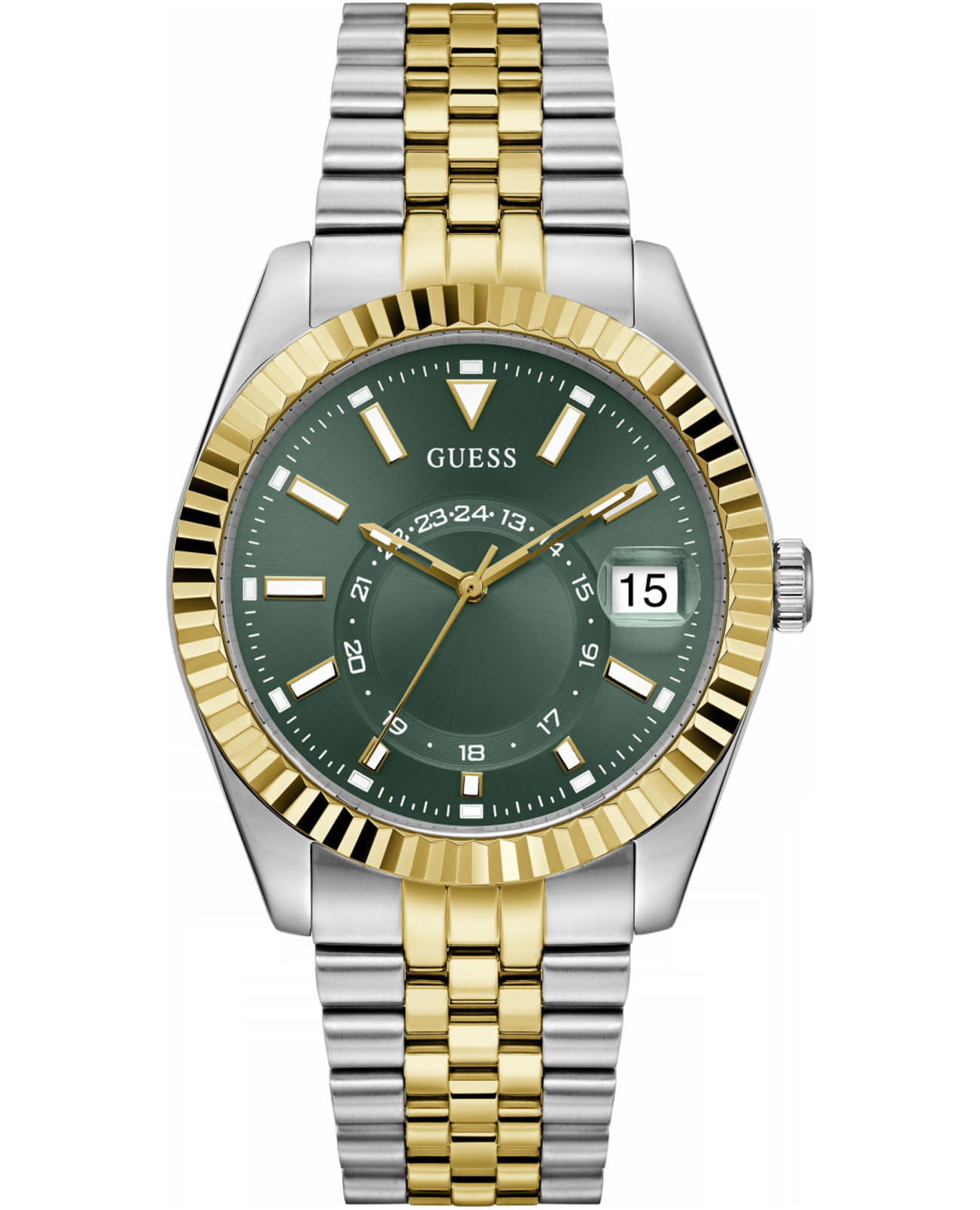 Мужские наручные часы Guess Dress Jaden GW0977G4 – это сочетание элегантности и современного стиля. Изысканные часы оснащены надежным кварцевым механизмом, который обеспечивает точность хода. Корпус часов выполнен из нержавеющей стали с безелемБезельВнешний ободок, закрепляющий стекло. В спортивных часах так называется поворотное кольцо с делениями на циферблате, выполняет роль таймера – замеряет отрезки времени на шкале. Неподвижный безель – элемент декора. Однонаправленно вращающийся безель на дайверских часах позволяет фиксировать моменты погружения и выныривания на поверхность. с IP-покрытиемIP-покрытиеМетод ионного напыления. Демонстрирует повышенную устойчивость к истиранию, окислению и химическим веществам. Под воздействием высокого давления и температуры около 1500°C молекулы металла надёжно соединяются с частицами корпуса часов. диаметром 42 мм и толщиной 11 мм, придающий модели особый характер. Циферблат оснащен метками в виде штрихов. Вынесенный циферблат с 24-х часовым указателем времени. Окошко даты в позиции 3 часов. Люминесцентное покрытиеЛюминесцентное покрытиеПозволяет считывать показания времени в темноте. Производители наносят на стрелки, часовые индексы, безель или поверхность циферблата светонакопительный состав, дающий холодное свечение. на стрелках и метках обеспечивает отличную видимость в темноте. Стильный стальной браслет с IP-покрытиемIP-покрытиеМетод ионного напыления. Демонстрирует повышенную устойчивость к истиранию, окислению и химическим веществам. Под воздействием высокого давления и температуры около 1500°C молекулы металла надёжно соединяются с частицами корпуса часов. с раскладной застежкойРаскладная застёжкаТакой тип застёжки используется только на браслетах из металла. Она никогда не раскрывается полностью, происходит разделение на 2 и более частей. Раскладывающая застёжка снизит вероятность потери часов к минимуму. гарантирует комфортное ношение и надежную фиксацию. Минеральное стеклоМинеральное стеклоМинеральное стекло представляет собой искусственно выращенный минерал кварца. Такое стекло отличается особой устойчивостью к повреждениям и царапинам. Уступает по некоторым качествам сапфировому стеклу. защищает циферблат от царапин, а водозащита 50WR предохраняет часы от случайных брызг и дождя. Эта модель станет отличным выбором для тех, кто ценит стиль и функциональность в одном аксессуаре.