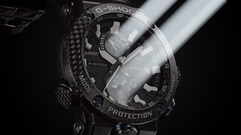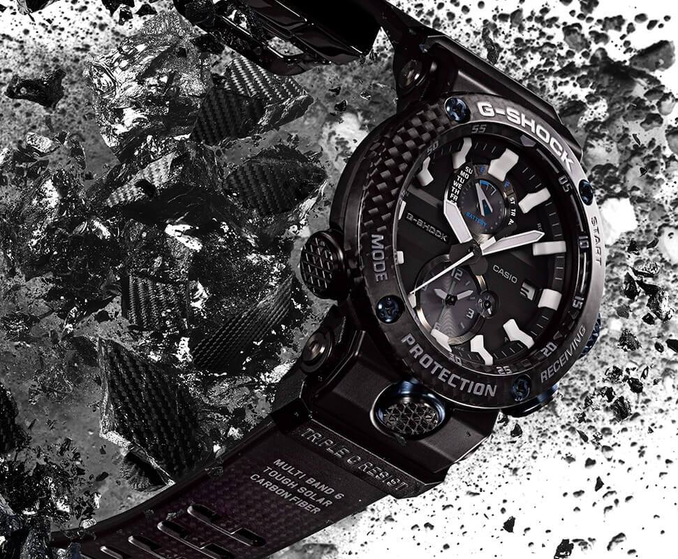 Внушительный аксессуар стильно смотрится на широком запястье, гармонично смотрятся крупные детали в голубом цвете. Задняя крышка здесь отсутствует, ударопрочный корпусУдаропрочный корпусМеханизм заключён в корпус, выполненный из современных материалов, устойчивых к ударам, механическим повреждениям и падению с высоты: инновационный пластик, карбон, нержавеющая сталь, титан. сделан из монолитного углеродного монокока, вдохновлённого конструкцией ранних самолётов. Он состоит из 52 карбоновых слоёв, уникальная текстура просматривается на боковых частях безеляБезельВнешний ободок, закрепляющий стекло. В спортивных часах так называется поворотное кольцо с делениями на циферблате, выполняет роль таймера – замеряет отрезки времени на шкале. Неподвижный безель – элемент декора. Однонаправленно вращающийся безель на дайверских часах позволяет фиксировать моменты погружения и выныривания на поверхность. – с успехом реализована технология Carbon Core GuardCarbon Core Guard Новейшая структура корпуса, разработанная Casio. Полиуретановая пластина дополнительно усилена карбоновыми вставками, что придаёт специальную защиту от механических повреждений. Карбон отличается лёгкостью и прочностью.. Полимерный ремешок тоже имеет усиление карбоновыми волокнами. Наручные часы обладают полезным функционалом: BluetoothBluetoothСовременная технология, позволяющая синхронизировать часы с телефоном и переносить данные. Часы с Bluetooth расширяют возможности вашего смартфона и делают его использование ещё более удобным., будильник, мировое времяМировое время Полезное часовое усложнение, отображающее время в основных городах и известных областях по всему миру, оно связано с часовыми поясами, удобно для путешественников и бизнесменов. , таймер, приём радиосигнала, питание от солнечной батареи . Сапфировое стекло с антибликовой обработкой. Яркая люминесцентная подсветкаЛюминесцентное покрытиеПозволяет считывать показания времени в темноте. Производители наносят на стрелки, часовые индексы, безель или поверхность циферблата светонакопительный состав, дающий холодное свечение.. Габариты: 50,1 x 46,4 x 16,9 мм.