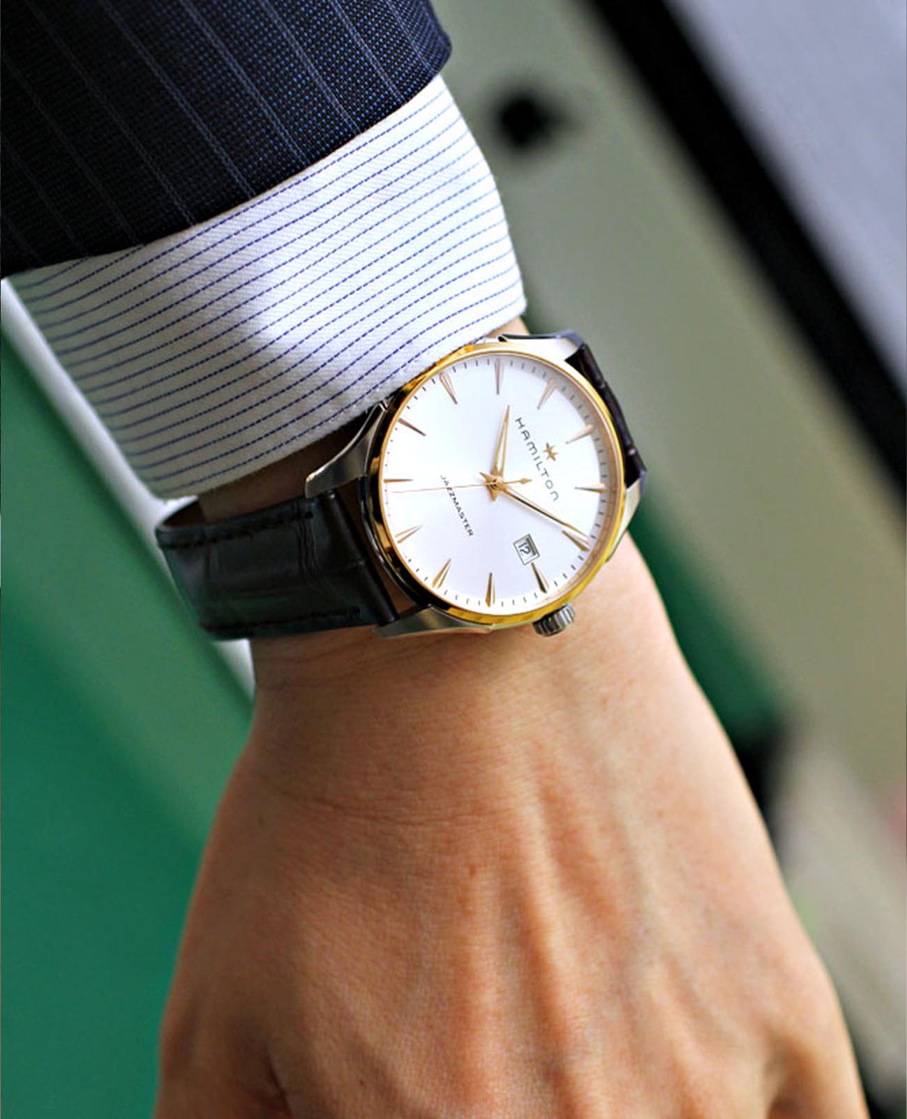 Мужские наручные часы Hamilton Jazzmaster Gent Quartz H32441551 с надёжным кварцевым механизмом. Корпус часов изготовлен из нержавеющей стали. Кожаный ремешок на стандартной застёжке. Окошко даты находится в положении 3 часа. Стрелки и метки с люминесцентным покрытиемЛюминесцентное покрытиеПозволяет считывать показания времени в темноте. Производители наносят на стрелки, часовые индексы, безель или поверхность циферблата светонакопительный состав, дающий холодное свечение.. Сапфировое стеклоСапфировое стеклоПрочный и надёжный материал из кристалла сапфира синтетического происхождения, характеризующийся особой твёрдостью и устойчивостью к царапинам и повреждениям. с антибликовым покрытием, устойчивое к мелким механическим повреждениям. Класс водозащиты: 50 метров, позволит защитить корпус от случайных брызг или капель дождя. БезельБезельВнешний ободок, закрепляющий стекло. В спортивных часах так называется поворотное кольцо с делениями на циферблате, выполняет роль таймера – замеряет отрезки времени на шкале. Неподвижный безель – элемент декора. Однонаправленно вращающийся безель на дайверских часах позволяет фиксировать моменты погружения и выныривания на поверхность. с PVD-покрытиемPVDУльтратонкое покрытие наносится в технике вакуумного напыления, сочетает в себе нитрид титана особой прочности со слоем золота или оксида хрома. Несёт в себе декоративную или защитную функцию..