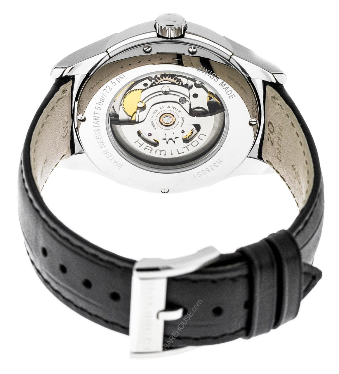 Мужские швейцарские механические часы с автоподзаводом Hamilton Jazzmaster Day Date Auto H32505751. Сапфировое стеклоСапфировое стеклоПрочный и надёжный материал из кристалла сапфира синтетического происхождения, характеризующийся особой твёрдостью и устойчивостью к царапинам и повреждениям. устойчивое к мелким механическим повреждениям. Корпус часов изготовлен из нержавеющей стали. Кожаный ремешок на стандартной застёжке. Класс водозащиты: 50 метров, позволит защитить корпус от случайных брызг или капель дождя. Стрелки и метки с люминесцентным покрытиемЛюминесцентное покрытиеПозволяет считывать показания времени в темноте. Производители наносят на стрелки, часовые индексы, безель или поверхность циферблата светонакопительный состав, дающий холодное свечение.. Окошко даты находится в положении 6 часов. Индикация дня недели в области 12 часов.