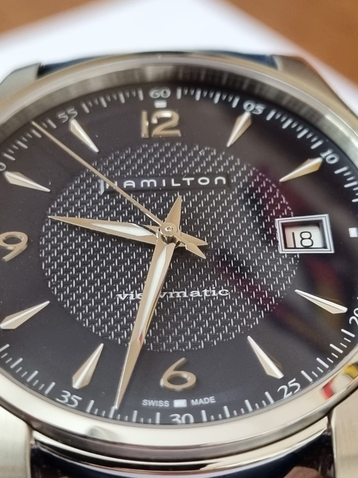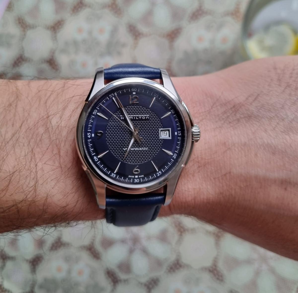 Очень красивые классические часы с индивидуальным дизайном. Привлекает глаз синий гильошированный циферблат с арабскими цифрами интересным шрифтом и метками, с зеркальной полировкой, которые переливаются блеском на солнце и без солнца). Стрелки и метки покрыты в середине суперлюминовой, вроде бы как напыления и не должно быть, а оно есть и работает, даже в таком утонченном виде! Окошко даты трапецевидной формы- тоже интересное решение.