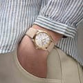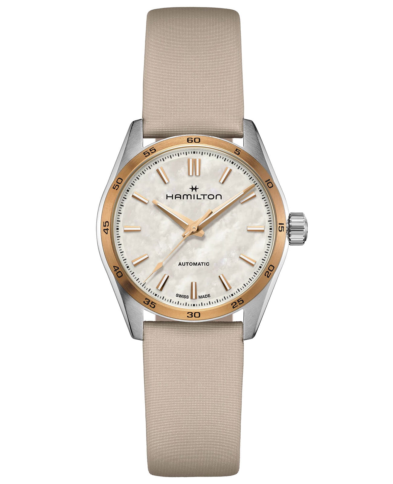 Модели из линии Jazzmaster Performer, привлекающие внимание ярким дизайном в стиле спортивный шик, сочетают в себе функциональность и эстетичность. Часы Jazzmaster Performer Automatic оснащены автоматическим механизмом H-10 с 80-часовым запасом хода. Модель в корпусе из нержавеющей стали диаметром 34 мм имеет безельБезельВнешний ободок, закрепляющий стекло. В спортивных часах так называется поворотное кольцо с делениями на циферблате, выполняет роль таймера – замеряет отрезки времени на шкале. Неподвижный безель – элемент декора. Однонаправленно вращающийся безель на дайверских часах позволяет фиксировать моменты погружения и выныривания на поверхность. с PVD-покрытиемPVDУльтратонкое покрытие наносится в технике вакуумного напыления, сочетает в себе нитрид титана особой прочности со слоем золота или оксида хрома. Несёт в себе декоративную или защитную функцию. цвета розового золота, переливающийся перламутровый циферблат и бежевый атласный ремешок.