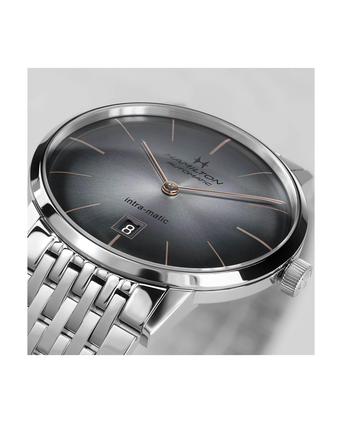 Мужские механические швейцарские часы Hamilton American Classic Intra-Matic Auto H38755181, автоматический механизм с высокой точностью. Сапфировое стеклоСапфировое стеклоПрочный и надёжный материал из кристалла сапфира синтетического происхождения, характеризующийся особой твёрдостью и устойчивостью к царапинам и повреждениям. устойчивое к появлению царапин, обладающее высокой прозрачностью. Класс водозащиты: 50 метров, позволит защитить корпус от случайных брызг или капель дождя. Корпус часов изготовлен из стали. Стальной браслет на застёжке-бабочке с кнопкамиЗастёжка "бабочка"Такой вид застёжки дополняется предохранителями, помогающими избежать случайного раскрытия браслета. Обладают изящным исполнением. .