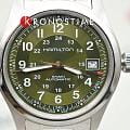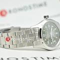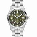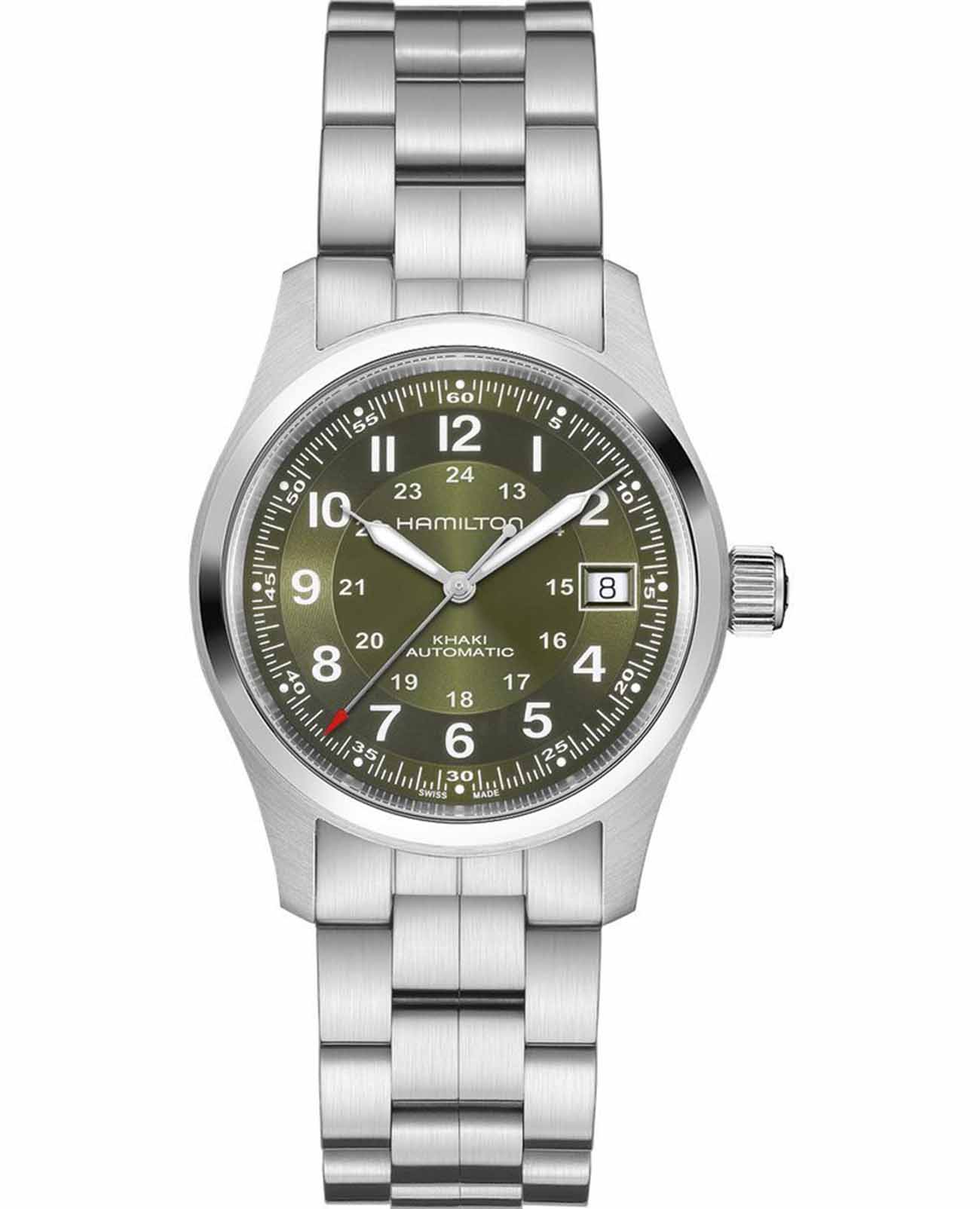 Hamilton Khaki Field Auto H70455160 — надёжные полевые часы с военным характером и швейцарской точностью, созданные для активного образа жизни. Корпус диаметром 38 мм выполнен из нержавеющей стали с сатинированной отделкой. Прозрачная задняя крышка позволяет наблюдать за работой механизма. Циферблат защищён выпуклым сапфировым стекломСапфировое стеклоПрочный и надёжный материал из кристалла сапфира синтетического происхождения, характеризующийся особой твёрдостью и устойчивостью к царапинам и повреждениям. с антибликовым покрытиемАнтибликовое покрытиеСлой оксида металла в 0,13-0,3 микрон, благодаря которому стекло часов не бликует и не отражает свет. Антибликовое покрытие уменьшает отражение света в 10 раз, обеспечивая отличную читаемость показателей циферблата.. Зелёный циферблат оформлен в классическом военном стиле: крупные арабские цифры, 24-часовая шкала по внутреннему кольцу и дата на позиции «3 часа». Стрелки и метки покрыты люминесцентным покрытиемЛюминесцентное покрытиеПозволяет считывать показания времени в темноте. Производители наносят на стрелки, часовые индексы, безель или поверхность циферблата светонакопительный состав, дающий холодное свечение., обеспечивая читаемость в любых условиях. Внутри установлен автоматический механизм H-10 с увеличенным запасом хода до 80 часов. Модель комплектуется браслетом из нержавеющей стали с раскладной застёжкойРаскладная застёжкаТакой тип застёжки используется только на браслетах из металла. Она никогда не раскрывается полностью, происходит разделение на 2 и более частей. Раскладывающая застёжка снизит вероятность потери часов к минимуму., обеспечивающей удобную и надёжную посадку. Водонепроницаемость 100 метров делает эту модель отличным выбором как для города, так и для активного отдыха. Hamilton Khaki Field Auto — идеальный баланс практичности, стиля и швейцарского качества.