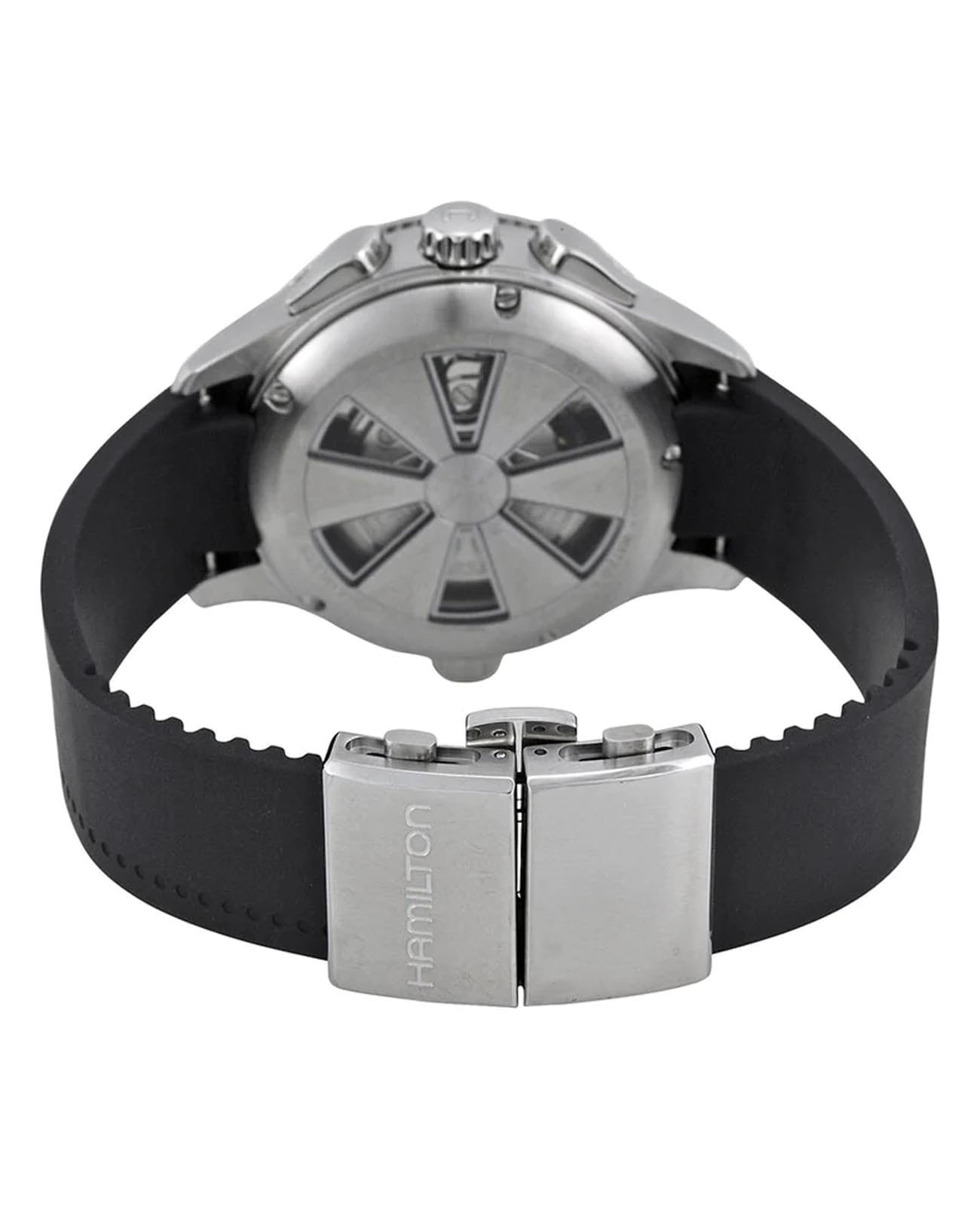 Мужские механические швейцарские часы-хронографХронографФункция позволяет измерять отрезки времени с особой точностью: часы, минуты, секунды. Верным признаком хронографа является наличие на циферблате 3 дополнительных окошек-счётчиков. с автоподзаводом Hamilton Khaki Aviation X-Patrol Auto Chrono H76566351. Корпус часов изготовлен из нержавеющей стали. Сапфировое стеклоСапфировое стеклоПрочный и надёжный материал из кристалла сапфира синтетического происхождения, характеризующийся особой твёрдостью и устойчивостью к царапинам и повреждениям. устойчивое к мелким механическим повреждениям. Стрелки и метки с люминесцентным покрытиемЛюминесцентное покрытиеПозволяет считывать показания времени в темноте. Производители наносят на стрелки, часовые индексы, безель или поверхность циферблата светонакопительный состав, дающий холодное свечение.. Класс водозащиты: 100 метров, позволит плавать, нырять и заниматься другими водными видами спорта. Каучуковый ремешок на застёжке-бабочке с кнопкамиЗастёжка "бабочка"Такой вид застёжки дополняется предохранителями, помогающими избежать случайного раскрытия браслета. Обладают изящным исполнением. . Окошки дня недели и даты находятся в положении 3 часа.