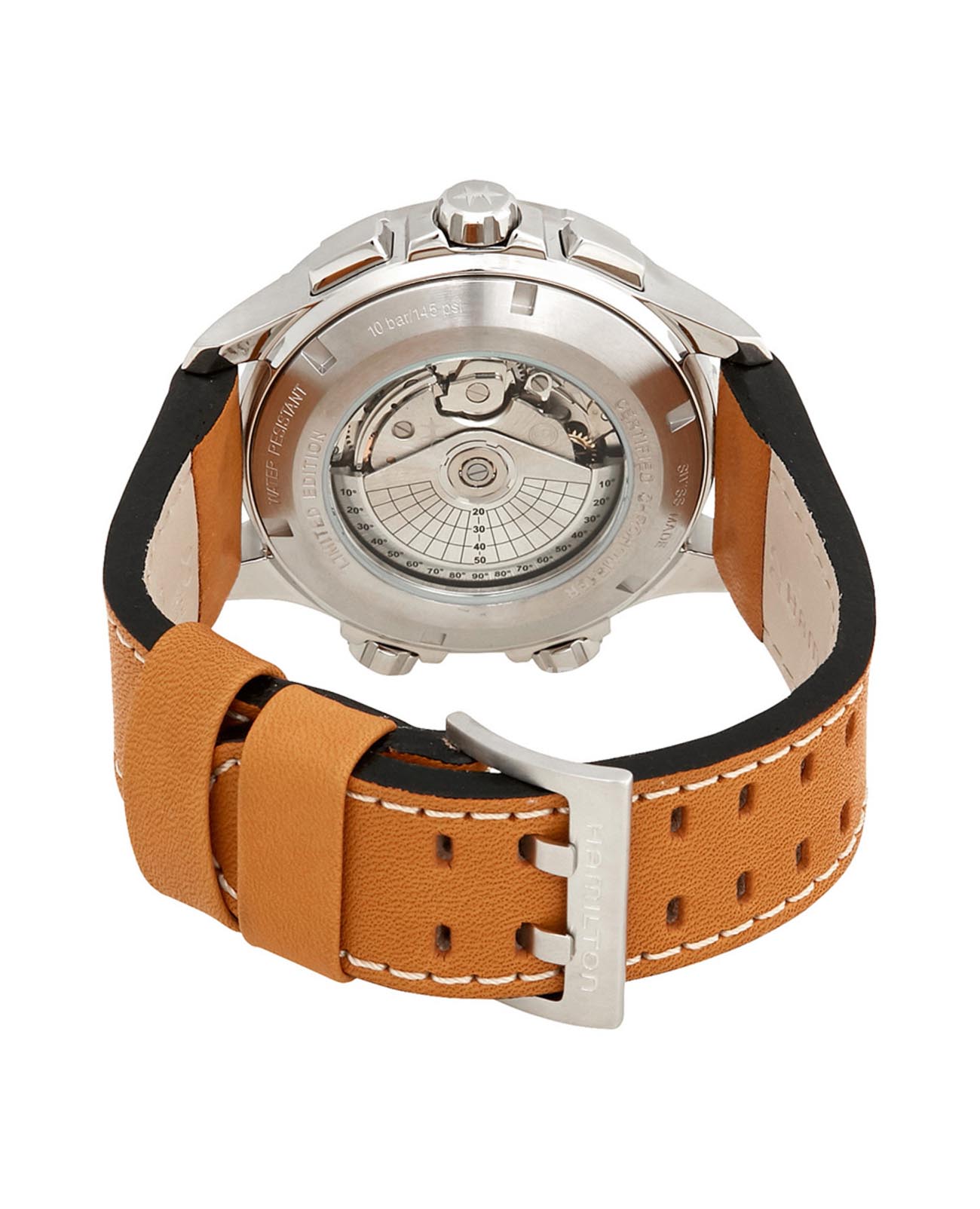 Мужские механические швейцарские часы-хронографХронографФункция позволяет измерять отрезки времени с особой точностью: часы, минуты, секунды. Верным признаком хронографа является наличие на циферблате 3 дополнительных окошек-счётчиков. Hamilton Khaki Aviation X-Wind Day Date Auto Chrono H77796535. Корпус часов изготовлен из нержавеющей стали. Кожаный ремешок на стандартной застёжке. Сапфировое стеклоСапфировое стеклоПрочный и надёжный материал из кристалла сапфира синтетического происхождения, характеризующийся особой твёрдостью и устойчивостью к царапинам и повреждениям. устойчивое к мелким механическим повреждениям. Класс водозащиты: 100 метров, позволит плавать, нырять и заниматься другими водными видами спорта. Стрелки и метки с люминесцентным покрытиемЛюминесцентное покрытиеПозволяет считывать показания времени в темноте. Производители наносят на стрелки, часовые индексы, безель или поверхность циферблата светонакопительный состав, дающий холодное свечение.. Окошки дня недели и даты находятся в положении 9 часов. Модель оснащена большим количеством авиационных функций.