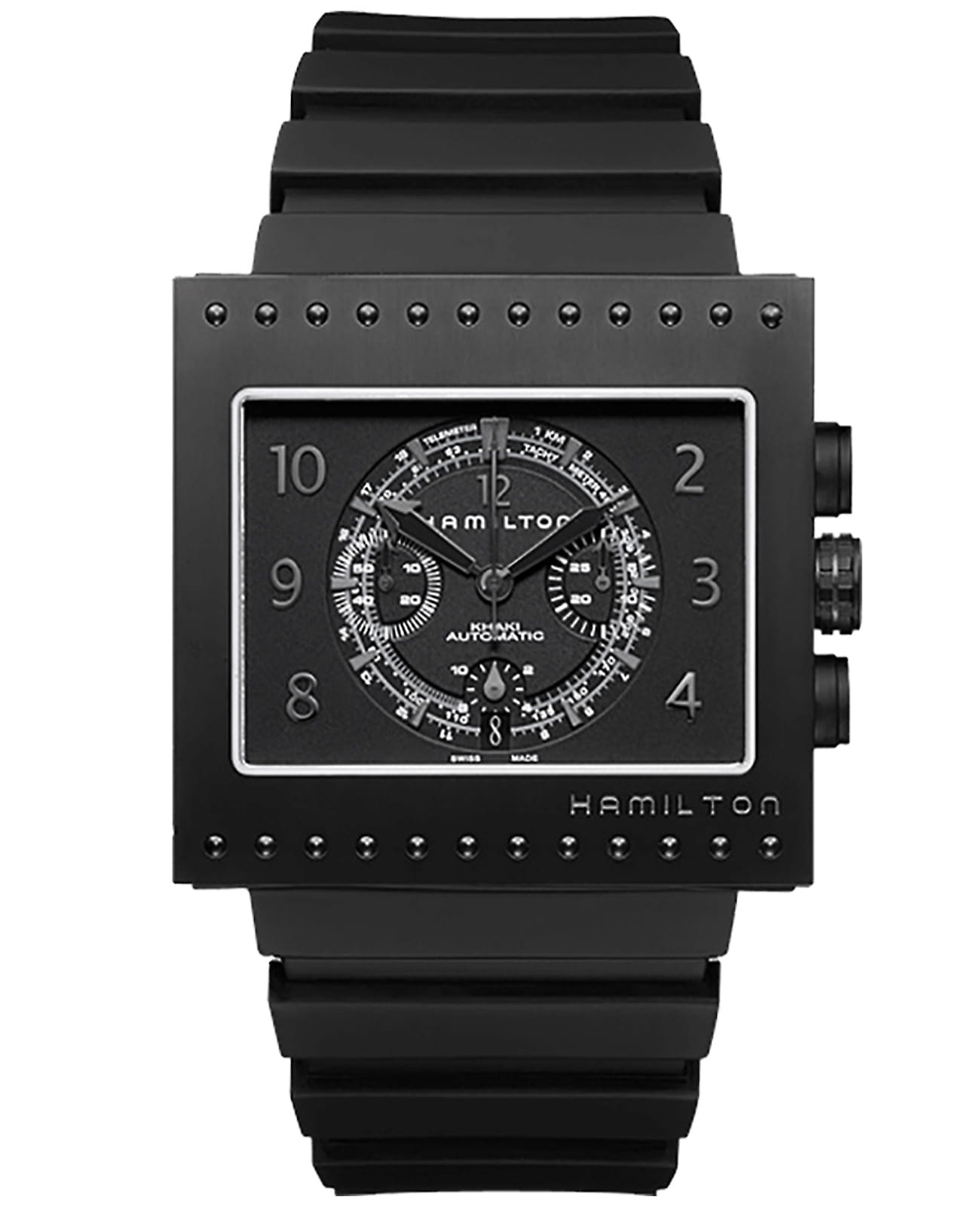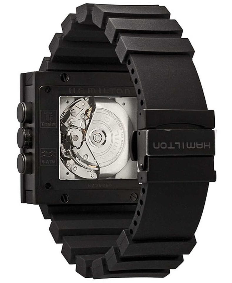 Мужские механические швейцарские часы-хронографХронографФункция позволяет измерять отрезки времени с особой точностью: часы, минуты, секунды. Верным признаком хронографа является наличие на циферблате 3 дополнительных окошек-счётчиков. с секундомеромСекундомерСекундоме́р — прибор, способный измерять интервалы времени с точностью до долей секунды. и автоматическим подзаводом Hamilton Khaki Action H79686333, механический механизм (автоматический калибр) с высокой точностью. Сапфировое стеклоСапфировое стеклоПрочный и надёжный материал из кристалла сапфира синтетического происхождения, характеризующийся особой твёрдостью и устойчивостью к царапинам и повреждениям. устойчивое к появлению царапин, обладающее высокой прозрачностью. Класс водозащиты: 50 метров, позволит защитить корпус от случайных брызг или капель дождя. Корпус часов изготовлен из титана с PVD-покрытиемPVDУльтратонкое покрытие наносится в технике вакуумного напыления, сочетает в себе нитрид титана особой прочности со слоем золота или оксида хрома. Несёт в себе декоративную или защитную функцию.. Силиконовый ремешок на стандартной застёжке.