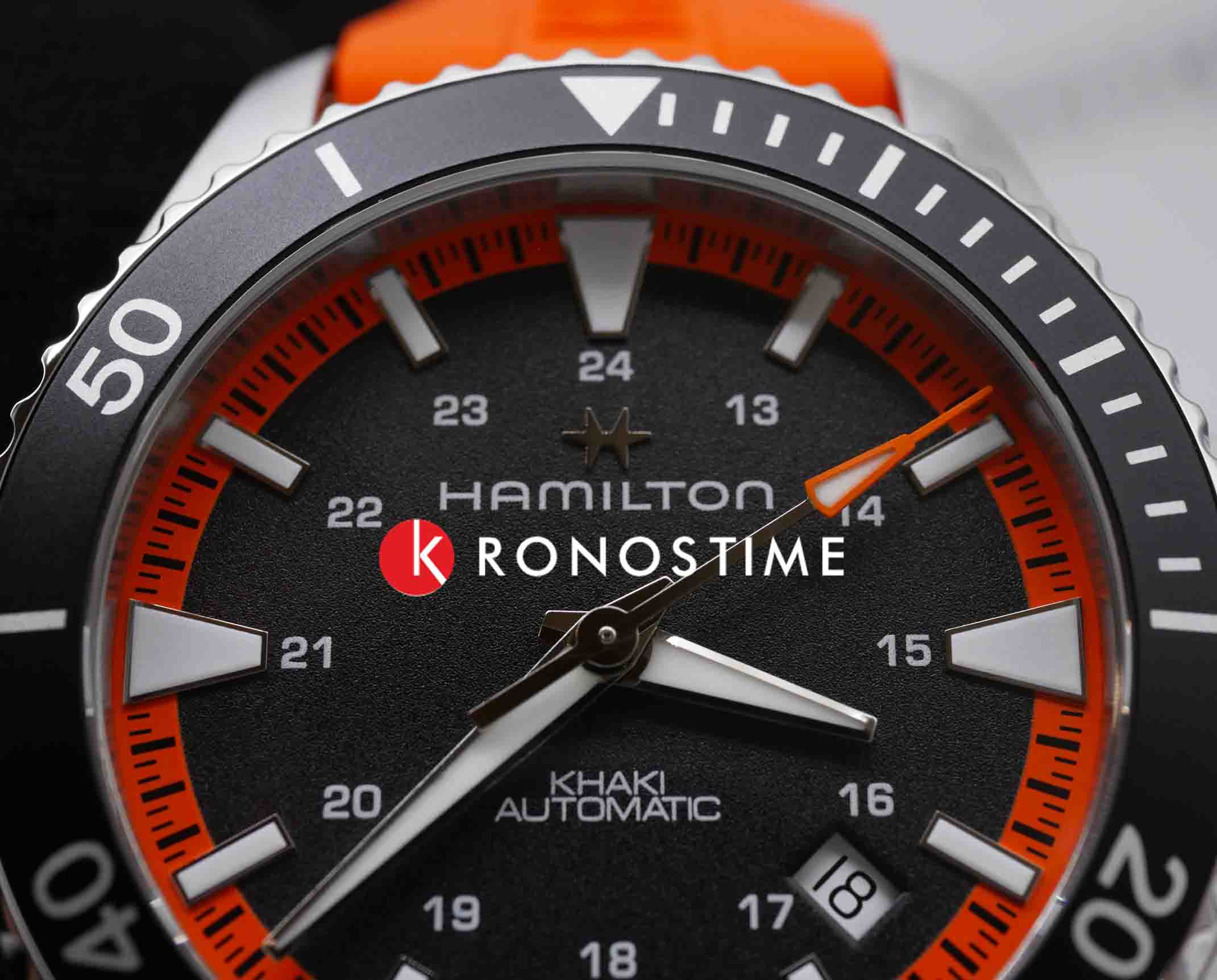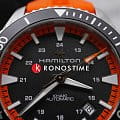На пляже, у бассейна или в океанских глубинах: новая модель Khaki Navy Scuba гарантированно произведет фурор. Часы для современных мореплавателей, любителей подводного плавания, серфинга и пляжного отдыха с оранжевым каучуковым ремешком и контрастным черным циферблатом сочетают в себе эффектный дизайн и функциональность. Независимо от того, хронометрируете ли вы время плавания, бега или пребывания на солнце, они позаботятся о том, чтобы вы сохраняли спокойствие даже при высоких температурах. Сапфировое стеклоСапфировое стеклоПрочный и надёжный материал из кристалла сапфира синтетического происхождения, характеризующийся особой твёрдостью и устойчивостью к царапинам и повреждениям. устойчивое к появлению царапин, обладающее высокой прозрачностью. Водозащита: 100 метров, позволит плавать, нырять и заниматься другими водными видами спорта.