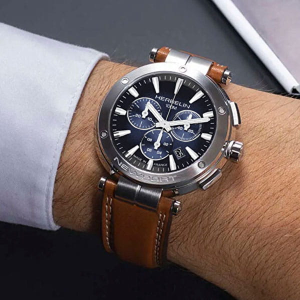 Мужские кварцевые часы-хронографХронографФункция позволяет измерять отрезки времени с особой точностью: часы, минуты, секунды. Верным признаком хронографа является наличие на циферблате 3 дополнительных окошек-счётчиков. Herbelin Newport Heritage 37688A35GD – отражающий идеальное сочетание современного дизайна, надёжности и функциональности. Элегантный облик станет превосходным завершением образа, наделив его индивидуальным характером. Корпус из нержавеющей стали серебристого цвета, диаметром 43 мм, идеально сбалансирован и элегантен. Сапфировое стеклоСапфировое стеклоПрочный и надёжный материал из кристалла сапфира синтетического происхождения, характеризующийся особой твёрдостью и устойчивостью к царапинам и повреждениям. защищает циферблат от царапин и устойчивое к механическим повреждениям. Стальной безельБезельВнешний ободок, закрепляющий стекло. В спортивных часах так называется поворотное кольцо с делениями на циферблате, выполняет роль таймера – замеряет отрезки времени на шкале. Неподвижный безель – элемент декора. Однонаправленно вращающийся безель на дайверских часах позволяет фиксировать моменты погружения и выныривания на поверхность. украшен винтами. Окошко даты находится в положении между 4 и 5 часов. Стрелки и метки с люминесцентным покрытиемЛюминесцентное покрытиеПозволяет считывать показания времени в темноте. Производители наносят на стрелки, часовые индексы, безель или поверхность циферблата светонакопительный состав, дающий холодное свечение.. Кожаный ремешок на стандартной застежке обеспечивает комфортное ношение. Водозащита 100 метров позволит плавать, нырять и заниматься другими водными видами спорта. Эта модель – отличный выбор для тех, кто ищет сочетание стиля, качества и функциональности. Часы станут не только полезным аксессуаром, но и выразительным элементом вашего имиджа.
