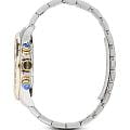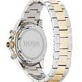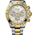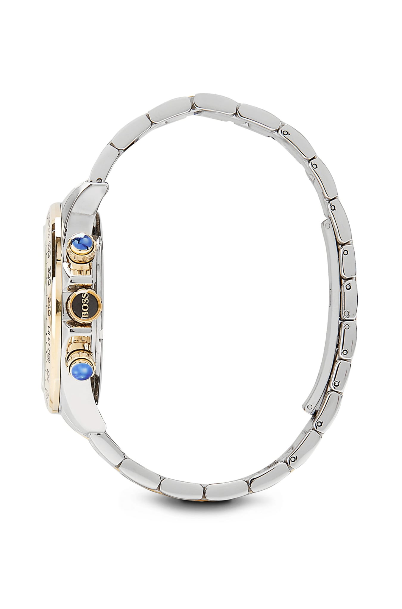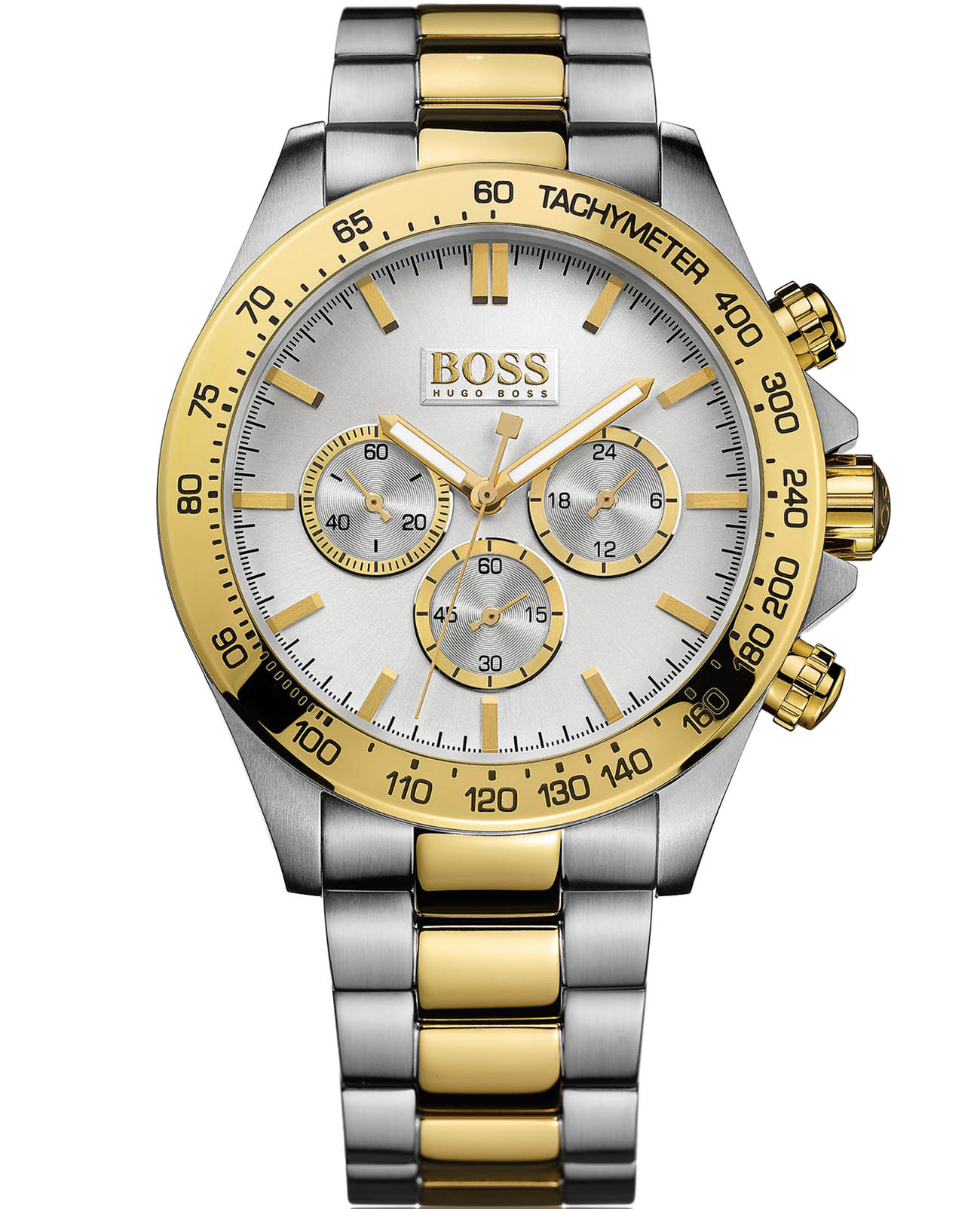 Мужские кварцевые часы Hugo Boss Ikon HB1512960 представлены в двухцветном корпусе из нержавеющей стали с IP-покрытиемIP-покрытиеМетод ионного напыления. Демонстрирует повышенную устойчивость к истиранию, окислению и химическим веществам. Под воздействием высокого давления и температуры около 1500°C молекулы металла надёжно соединяются с частицами корпуса часов. диаметром 46 мм, сочетая стильный дизайн с функциональностью хронографа. Модель оснащена кварцевым механизмом с тремя субдиалами (60-секундный, 30-минутный и 24-часовой счетчики), дополненными тахиметрической шкалойТахиметрРазмеченная шкала, располагается на ободке или безеле часов. Тахиметр позволяет рассчитать скорость на определённом участке пути, расстояние измеряется в километрах или милях. на золотистом безелеБезельВнешний ободок, закрепляющий стекло. В спортивных часах так называется поворотное кольцо с делениями на циферблате, выполняет роль таймера – замеряет отрезки времени на шкале. Неподвижный безель – элемент декора. Однонаправленно вращающийся безель на дайверских часах позволяет фиксировать моменты погружения и выныривания на поверхность.. Серебристый циферблат с позолоченными метками и стрелками защищен прочным минеральным стекломМинеральное стеклоМинеральное стекло представляет собой искусственно выращенный минерал кварца. Такое стекло отличается особой устойчивостью к повреждениям и царапинам. Уступает по некоторым качествам сапфировому стеклу., обеспечивающим отличную читаемость. Двухцветный браслет из нержавеющей стали шириной 20-22 мм обеспечивает комфортную посадку на запястье. Ударопрочный корпусУдаропрочный корпусМеханизм заключён в корпус, выполненный из современных материалов, устойчивых к ударам, механическим повреждениям и падению с высоты: инновационный пластик, карбон, нержавеющая сталь, титан. с делает часы устойчивыми к повседневным нагрузкам.