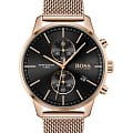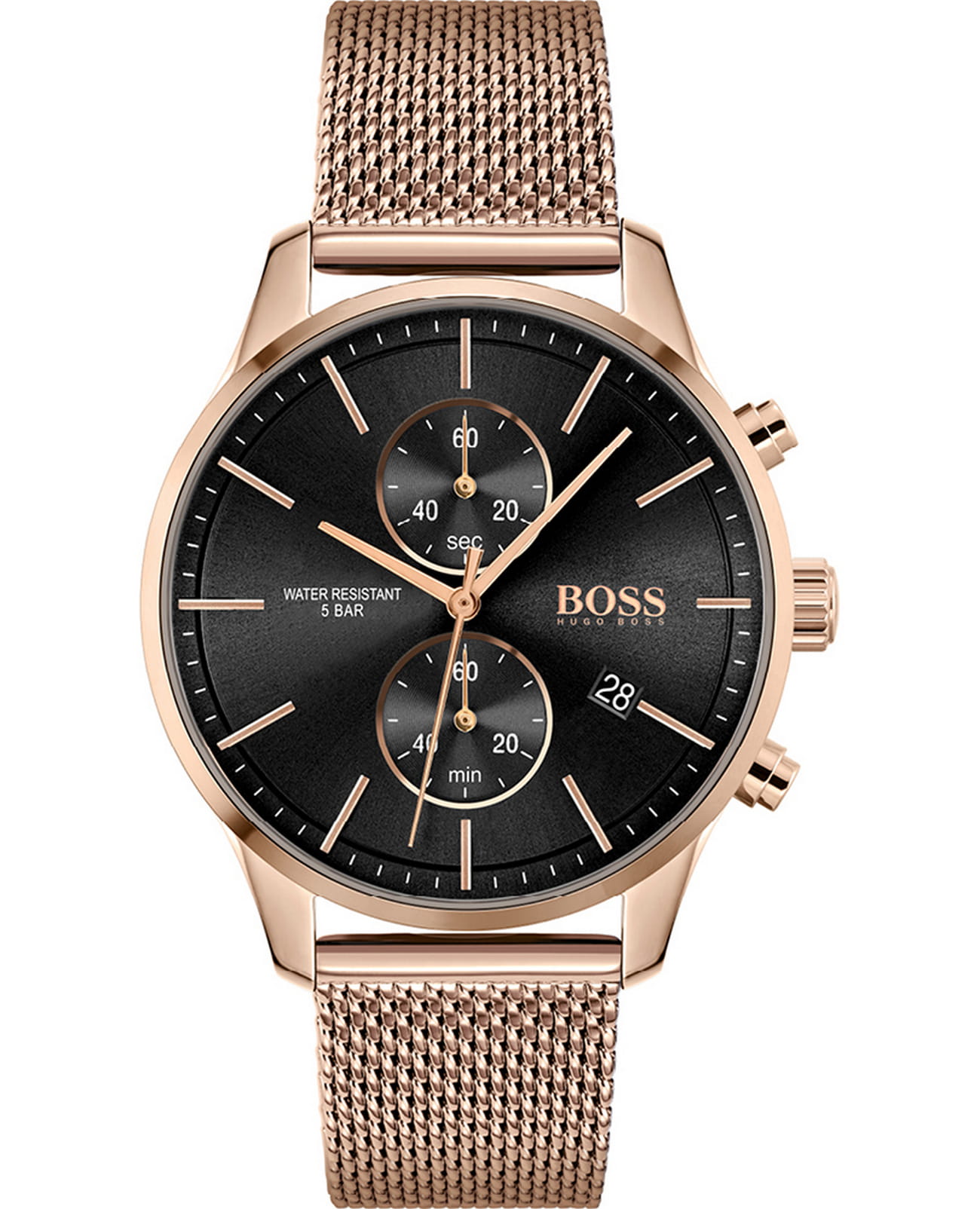 Мужские часы Hugo Boss Associate HB1513806 представлены в круглом 42-мм корпусе из нержавеющей стали 316L с золотистым PVD-покрытиемPVDУльтратонкое покрытие наносится в технике вакуумного напыления, сочетает в себе нитрид титана особой прочности со слоем золота или оксида хрома. Несёт в себе декоративную или защитную функцию.. Оснащены кварцевым механизмом с функциями хронографаХронографФункция позволяет измерять отрезки времени с особой точностью: часы, минуты, секунды. Верным признаком хронографа является наличие на циферблате 3 дополнительных окошек-счётчиков., секундомеромСекундомерСекундоме́р — прибор, способный измерять интервалы времени с точностью до долей секунды. и индикацией даты на позиции 4 часа. Циферблат с подсветкой стрелок защищен устойчивым к царапинам минеральным стекломМинеральное стеклоМинеральное стекло представляет собой искусственно выращенный минерал кварца. Такое стекло отличается особой устойчивостью к повреждениям и царапинам. Уступает по некоторым качествам сапфировому стеклу.. Стальной браслет дополнен раскладной застёжкойРаскладная застёжкаТакой тип застёжки используется только на браслетах из металла. Она никогда не раскрывается полностью, происходит разделение на 2 и более частей. Раскладывающая застёжка снизит вероятность потери часов к минимуму. с фиксатором для надежной посадки. Водонепроницаемость 50 метров (5 ATM) обеспечивает защиту от брызг и дождя.