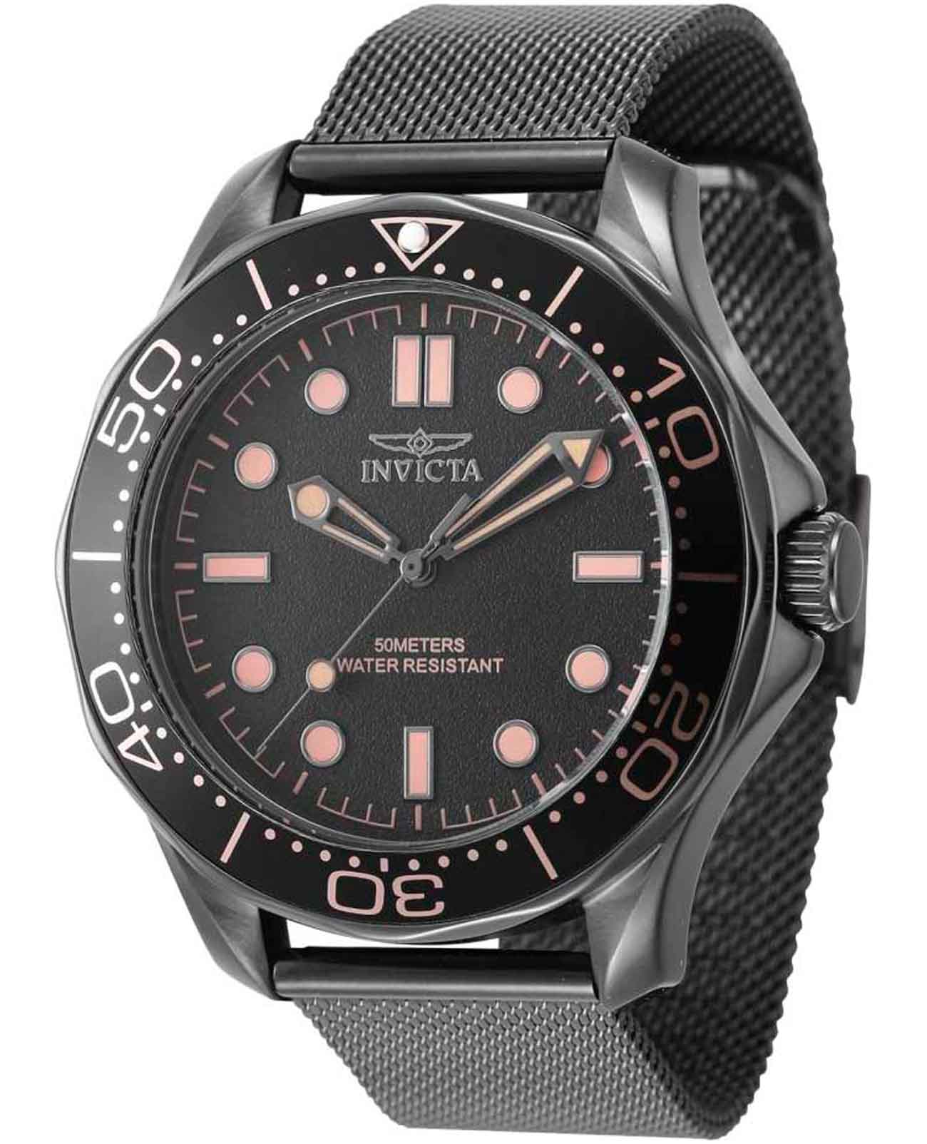 Мужские наручные часы Invicta Specialty IN45979 сочетают в себе классический дизайн и надежность современных технологий. Модель обладает круглым корпусом диаметром 44 мм, изготовленным из нержавеющей стали с IP-покрытиемIP-покрытиеМетод ионного напыления. Демонстрирует повышенную устойчивость к истиранию, окислению и химическим веществам. Под воздействием высокого давления и температуры около 1500°C молекулы металла надёжно соединяются с частицами корпуса часов., что обеспечивает высокую устойчивость к внешним воздействиям . БезельБезельВнешний ободок, закрепляющий стекло. В спортивных часах так называется поворотное кольцо с делениями на циферблате, выполняет роль таймера – замеряет отрезки времени на шкале. Неподвижный безель – элемент декора. Однонаправленно вращающийся безель на дайверских часах позволяет фиксировать моменты погружения и выныривания на поверхность. с IP-покрытиемIP-покрытиеМетод ионного напыления. Демонстрирует повышенную устойчивость к истиранию, окислению и химическим веществам. Под воздействием высокого давления и температуры около 1500°C молекулы металла надёжно соединяются с частицами корпуса часов.. Браслет миланского плетения из того же материала на раскладном замкеРаскладной замокДанный вариант застежки используется только на часах с металлическим браслетом. Отличительная особенность такого крепления в том, что длина браслета становится универсальной и вы можете самостоятельно отрегулировать нужный вам размер – застежка просто двигается по браслету часов.. Черный циферблат дополнен светящимися стрелками с люминесцентным покрытиемЛюминесцентное покрытиеПозволяет считывать показания времени в темноте. Производители наносят на стрелки, часовые индексы, безель или поверхность циферблата светонакопительный состав, дающий холодное свечение. Tritnite, которые обеспечивают отличную видимость в темноте . Для защиты используется минеральное стеклоМинеральное стеклоМинеральное стекло представляет собой искусственно выращенный минерал кварца. Такое стекло отличается особой устойчивостью к повреждениям и царапинам. Уступает по некоторым качествам сапфировому стеклу. с антибликовым покрытием, обеспечивающее прочную защиту от царапин и бликов. Часы работают на кварцевом механизме, что гарантирует точное время без необходимости подзаводки. Водонепроницаемость часов достигает 50 метров (5 атмосфер), что позволяет использовать их во время плавания и других водных видов спорта, однако не рекомендуется для глубоководного дайвинга . Стильный дизайн модели, который делает ее универсальным аксессуаром как для повседневной носки, так и для особых случаев.
