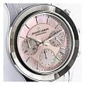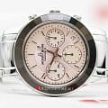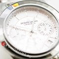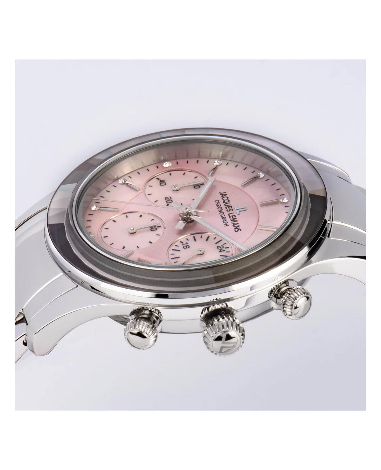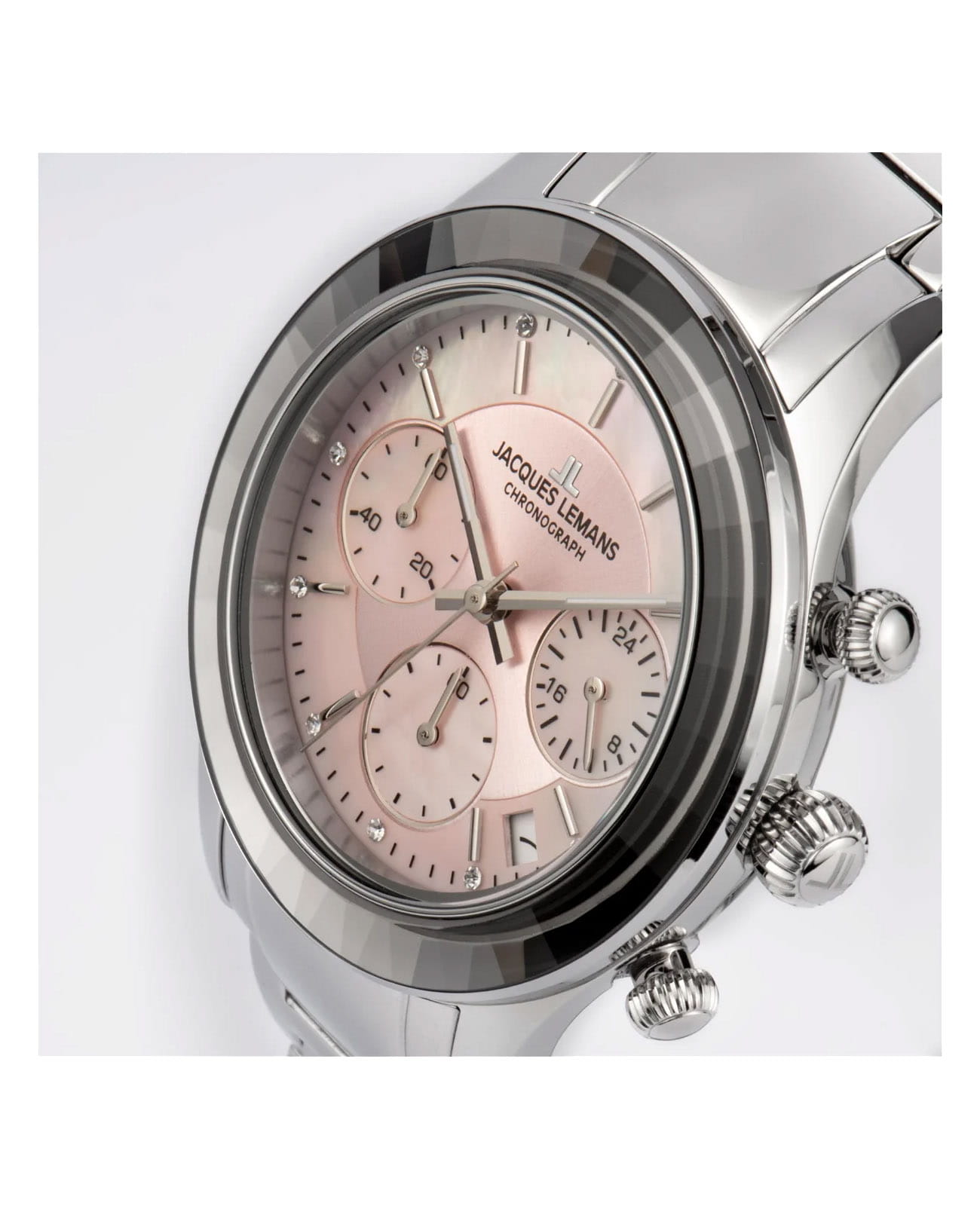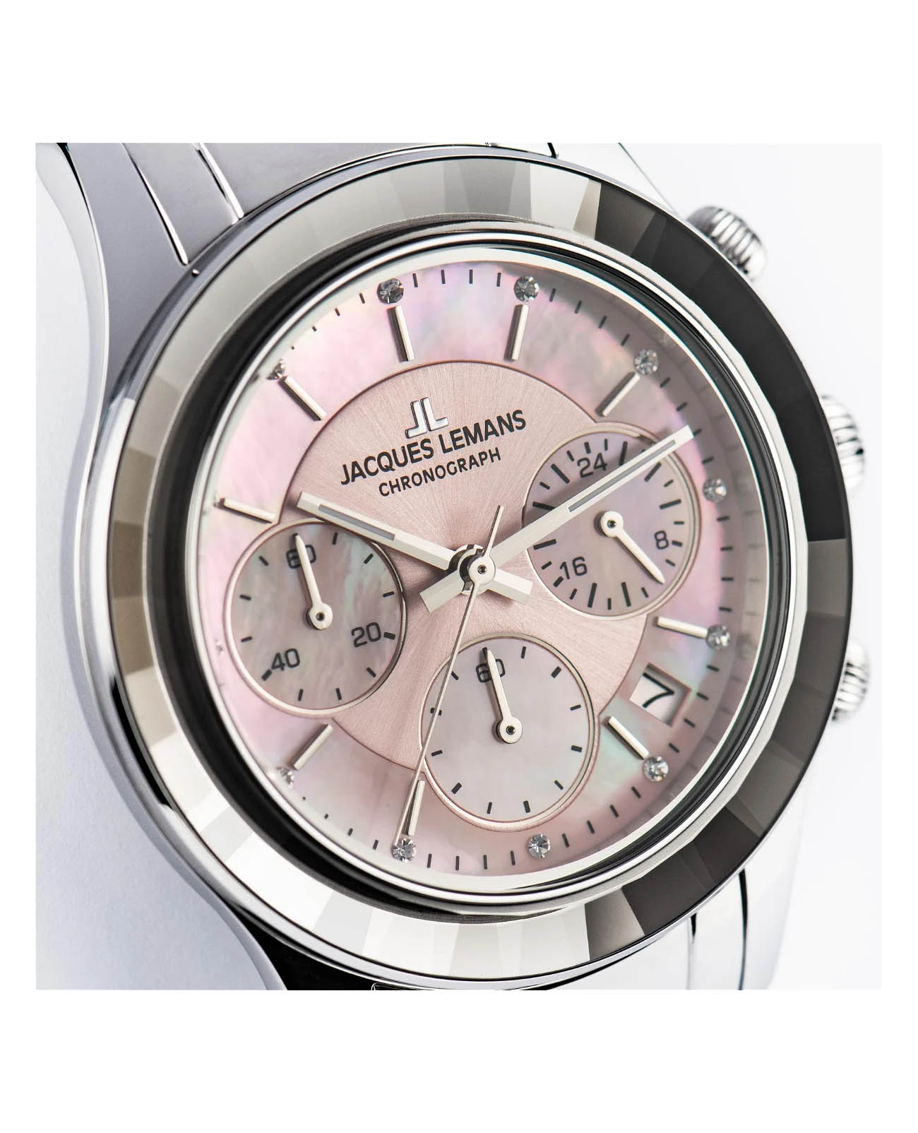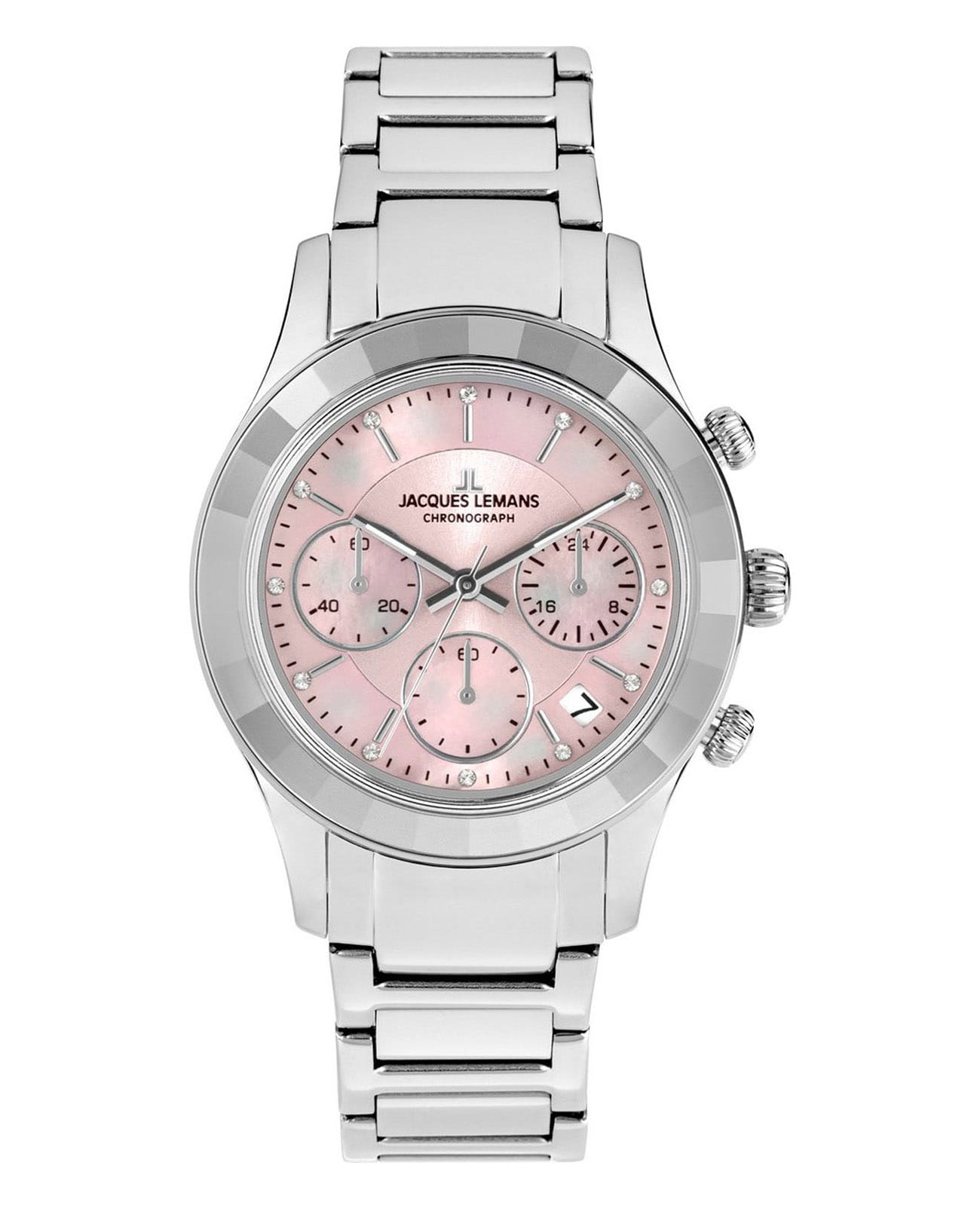 Женские часы-хронографХронографФункция позволяет измерять отрезки времени с особой точностью: часы, минуты, секунды. Верным признаком хронографа является наличие на циферблате 3 дополнительных окошек-счётчиков. c секундомеромСекундомерСекундоме́р — прибор, способный измерять интервалы времени с точностью до долей секунды. Jacques Lemans Venice 1-2151L, кварцевый механизм с высокой точностью. Минеральное стеклоМинеральное стеклоМинеральное стекло представляет собой искусственно выращенный минерал кварца. Такое стекло отличается особой устойчивостью к повреждениям и царапинам. Уступает по некоторым качествам сапфировому стеклу. устойчивое к мелким механическим повреждениям. Корпус из нержавеющей стали. Широкий безельБезельВнешний ободок, закрепляющий стекло. В спортивных часах так называется поворотное кольцо с делениями на циферблате, выполняет роль таймера – замеряет отрезки времени на шкале. Неподвижный безель – элемент декора. Однонаправленно вращающийся безель на дайверских часах позволяет фиксировать моменты погружения и выныривания на поверхность. с гранями. На циферблате расположены три дополнительных индикатора. Окошко даты находится в положении между 4 и 5 часов. Стрелки с люминесцентным покрытиемЛюминесцентное покрытиеПозволяет считывать показания времени в темноте. Производители наносят на стрелки, часовые индексы, безель или поверхность циферблата светонакопительный состав, дающий холодное свечение.. Каждая накладная риска украшена кристаллом Swarowski. Класс водозащиты: 50 метров, позволит защитить корпус от случайных брызг или капель дождя. Браслет из нержавеющей стали на раскладной застёжкеРаскладная застёжкаТакой тип застёжки используется только на браслетах из металла. Она никогда не раскрывается полностью, происходит разделение на 2 и более частей. Раскладывающая застёжка снизит вероятность потери часов к минимуму..