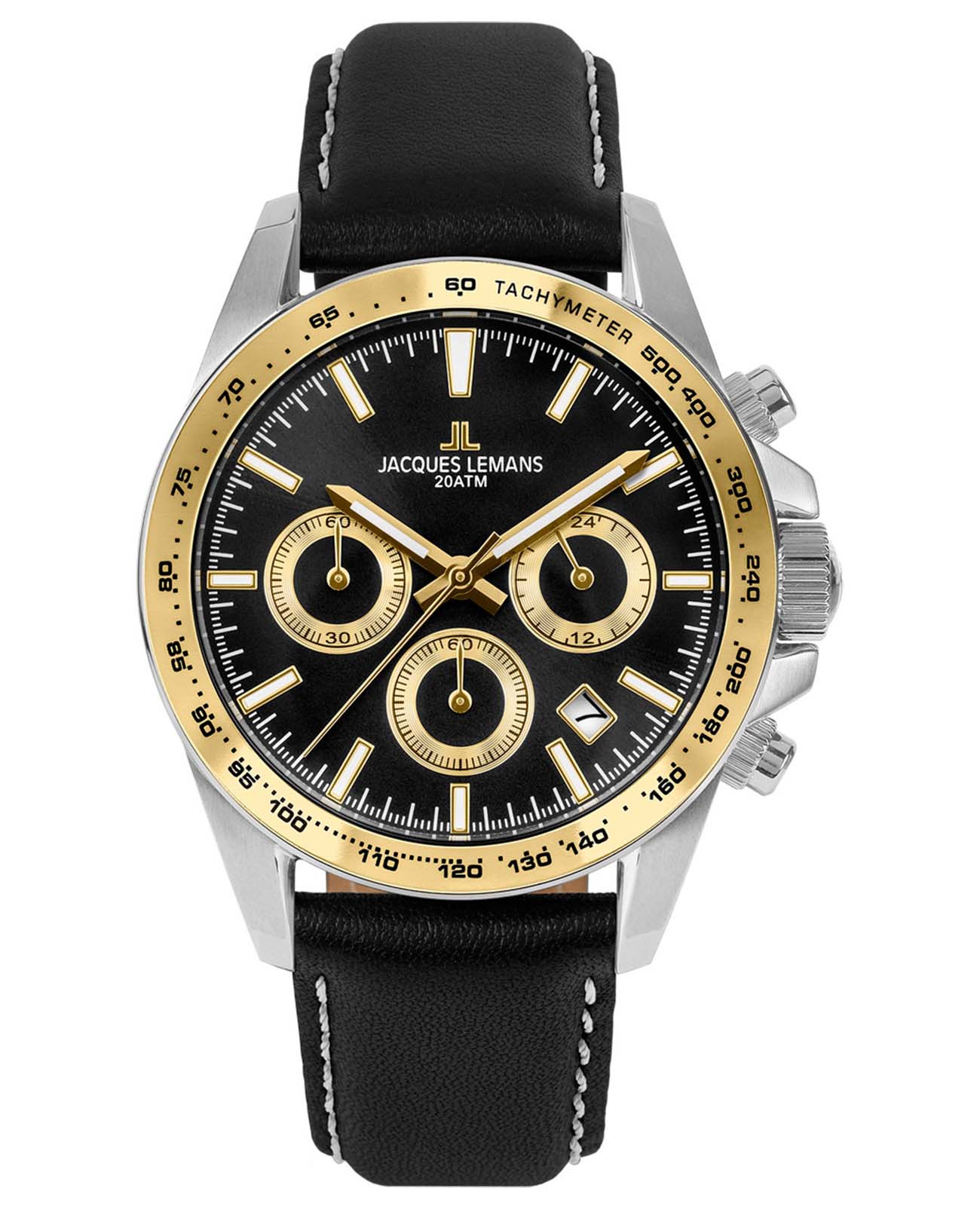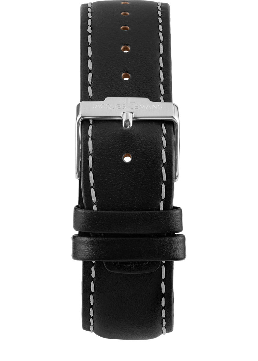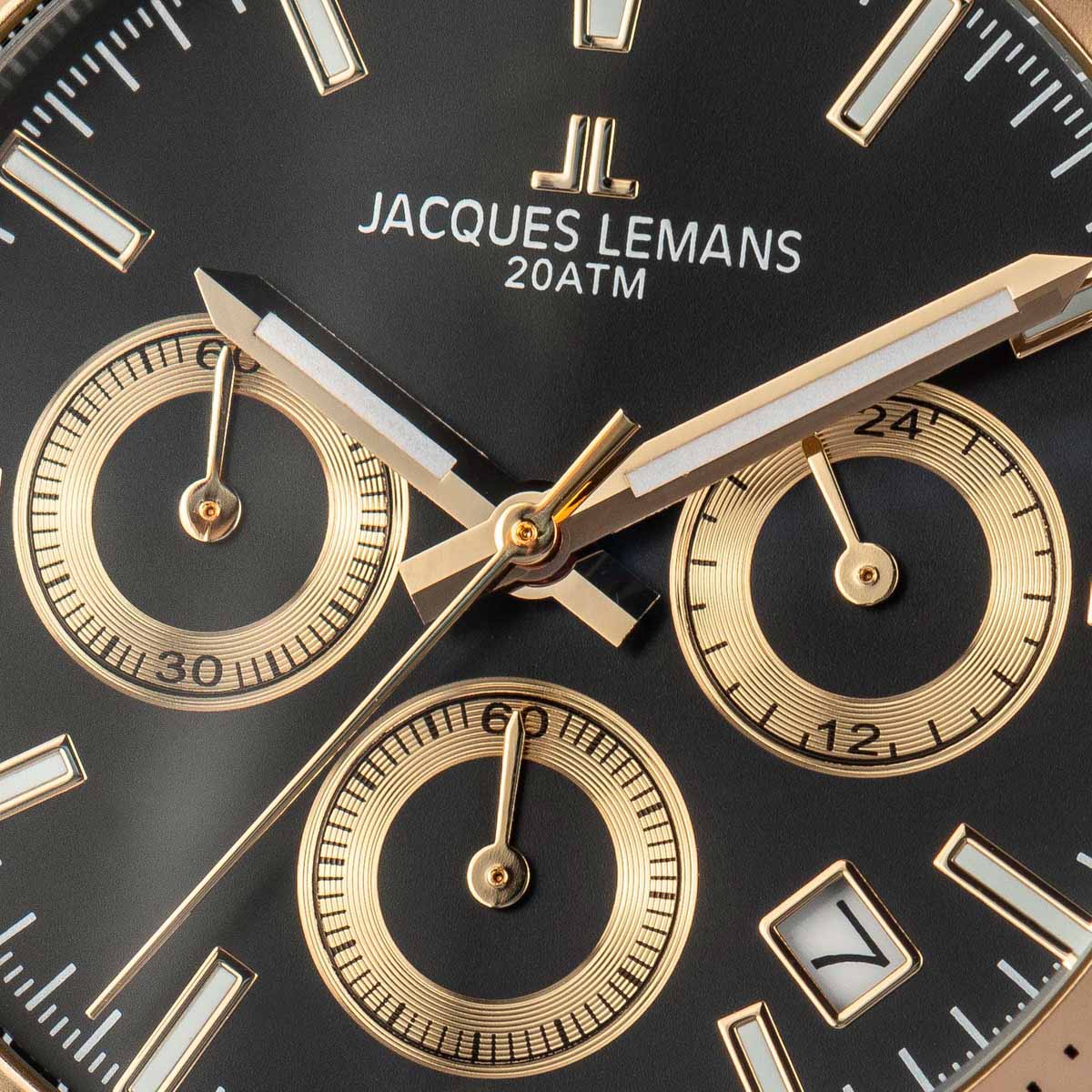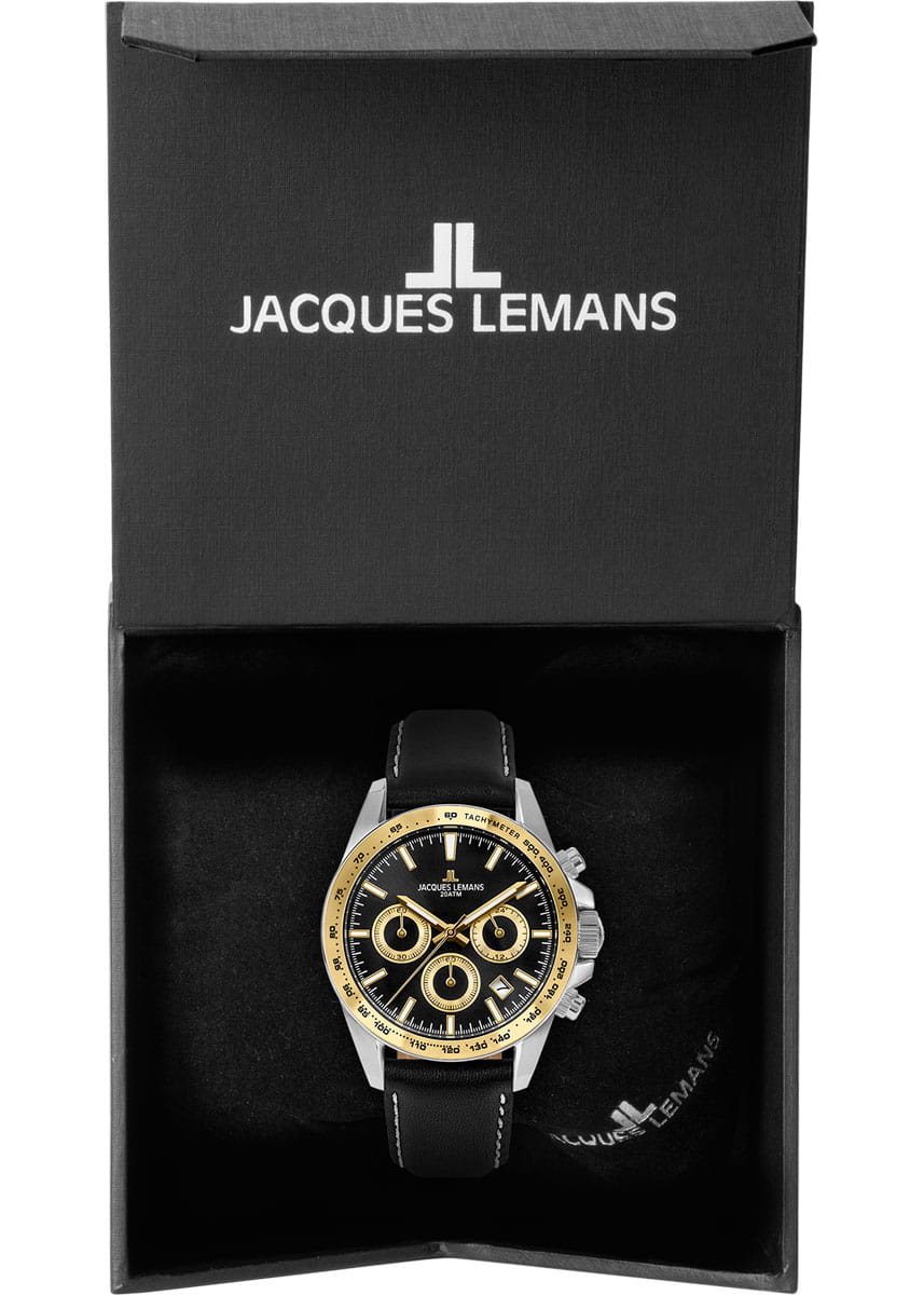 Мужские часы Jacques Lemans Liverpool 1-1877D с минеральным стекломМинеральное стеклоМинеральное стекло представляет собой искусственно выращенный минерал кварца. Такое стекло отличается особой устойчивостью к повреждениям и царапинам. Уступает по некоторым качествам сапфировому стеклу., кварцевый механизм с высокой точностью. Часы- хронографХронографФункция позволяет измерять отрезки времени с особой точностью: часы, минуты, секунды. Верным признаком хронографа является наличие на циферблате 3 дополнительных окошек-счётчиков. с секундомеромСекундомерСекундоме́р — прибор, способный измерять интервалы времени с точностью до долей секунды. представляют собой стильный аксессуар, отражающий идеальное сочетание современного дизайна, надёжности и функциональности.  Неподвижный безельБезельВнешний ободок, закрепляющий стекло. В спортивных часах так называется поворотное кольцо с делениями на циферблате, выполняет роль таймера – замеряет отрезки времени на шкале. Неподвижный безель – элемент декора. Однонаправленно вращающийся безель на дайверских часах позволяет фиксировать моменты погружения и выныривания на поверхность. из нержавеющей стали с PVDPVDУльтратонкое покрытие наносится в технике вакуумного напыления, сочетает в себе нитрид титана особой прочности со слоем золота или оксида хрома. Несёт в себе декоративную или защитную функцию. покрытием и с тахиметромТахиметрРазмеченная шкала, располагается на ободке или безеле часов. Тахиметр позволяет рассчитать скорость на определённом участке пути, расстояние измеряется в километрах или милях.. На циферблате расположены два дополнительных индикатора и окошко даты. Стрелки и метки с люминесцентным покрытиемЛюминесцентное покрытиеПозволяет считывать показания времени в темноте. Производители наносят на стрелки, часовые индексы, безель или поверхность циферблата светонакопительный состав, дающий холодное свечение.. Класс водозащиты: 200 метров, позволит плавать, нырять и заниматься другими водными видами спорта. Рифленая заводная головка с защитой. Ремешок из натуральной кожи на стандартной застежке.