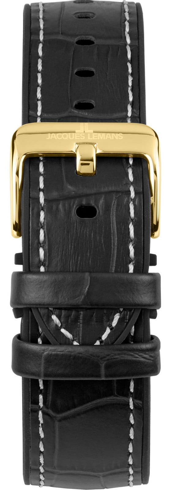 Кварцевый хронографХронографФункция позволяет измерять отрезки времени с особой точностью: часы, минуты, секунды. Верным признаком хронографа является наличие на циферблате 3 дополнительных окошек-счётчиков. в мощном корпусе диаметром 48 мм. Нержавеющая сталь с IP-покрытиемIP-покрытиеМетод ионного напыления. Демонстрирует повышенную устойчивость к истиранию, окислению и химическим веществам. Под воздействием высокого давления и температуры около 1500°C молекулы металла надёжно соединяются с частицами корпуса часов., из которой он сделан, отличается гипоаллергенными свойствами и стойкостью к коррозии. Широкий контрастный безельБезельВнешний ободок, закрепляющий стекло. В спортивных часах так называется поворотное кольцо с делениями на циферблате, выполняет роль таймера – замеряет отрезки времени на шкале. Неподвижный безель – элемент декора. Однонаправленно вращающийся безель на дайверских часах позволяет фиксировать моменты погружения и выныривания на поверхность. с тахиметрической шкалой обрамляет зеленый циферблат. На нем расположены три дополнительных индикатора и окошко даты. С помощью индикаторов можно засекать временные промежутки (секунды и минуты) и определять время в 24-часовом формате времяисчисления. В модели установлено минеральное стеклоМинеральное стеклоМинеральное стекло представляет собой искусственно выращенный минерал кварца. Такое стекло отличается особой устойчивостью к повреждениям и царапинам. Уступает по некоторым качествам сапфировому стеклу.. Повышенная водостойкость равна 10 атмосфер. Ремешок выполнен из натуральной кожи черного цвета с прошивкой, застежка украшена логотипом бренда. Часы Jacques Lemans, надежные и функциональные, хорошо дополнят образ в спортивном или повседневном стиле.