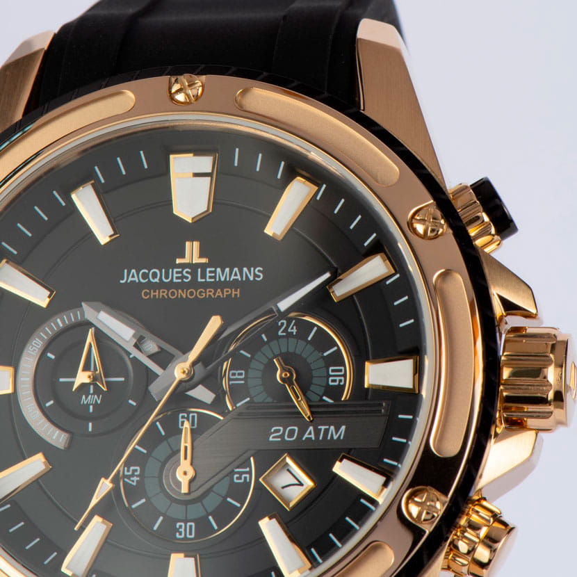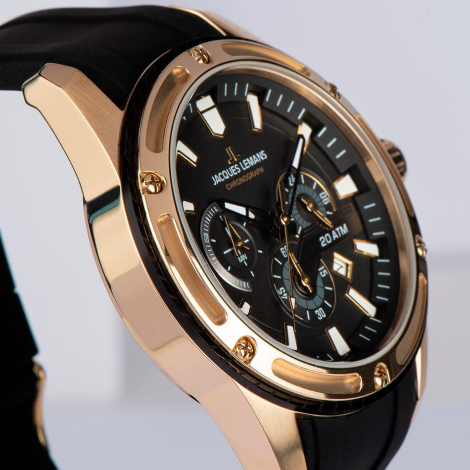 Мужские часы Jacques Lemans Liverpool 1-2141D с минеральным стекломМинеральное стеклоМинеральное стекло представляет собой искусственно выращенный минерал кварца. Такое стекло отличается особой устойчивостью к повреждениям и царапинам. Уступает по некоторым качествам сапфировому стеклу., кварцевый механизм с высокой точностью. Часы- хронографХронографФункция позволяет измерять отрезки времени с особой точностью: часы, минуты, секунды. Верным признаком хронографа является наличие на циферблате 3 дополнительных окошек-счётчиков. с секундомеромСекундомерСекундоме́р — прибор, способный измерять интервалы времени с точностью до долей секунды. представляют собой стильный аксессуар, отражающий идеальное сочетание современного дизайна, надёжности и функциональности. Корпус и безельБезельВнешний ободок, закрепляющий стекло. В спортивных часах так называется поворотное кольцо с делениями на циферблате, выполняет роль таймера – замеряет отрезки времени на шкале. Неподвижный безель – элемент декора. Однонаправленно вращающийся безель на дайверских часах позволяет фиксировать моменты погружения и выныривания на поверхность. из нержавеющей стали с PVDPVDУльтратонкое покрытие наносится в технике вакуумного напыления, сочетает в себе нитрид титана особой прочности со слоем золота или оксида хрома. Несёт в себе декоративную или защитную функцию. покрытием. БезельБезельВнешний ободок, закрепляющий стекло. В спортивных часах так называется поворотное кольцо с делениями на циферблате, выполняет роль таймера – замеряет отрезки времени на шкале. Неподвижный безель – элемент декора. Однонаправленно вращающийся безель на дайверских часах позволяет фиксировать моменты погружения и выныривания на поверхность. с декоративными прорезями крепится к корпусу шестью винтами. На циферблате расположены три дополнительных индикатора и окошко даты. Стрелки и метки с люминесцентным покрытиемЛюминесцентное покрытиеПозволяет считывать показания времени в темноте. Производители наносят на стрелки, часовые индексы, безель или поверхность циферблата светонакопительный состав, дающий холодное свечение.. Класс водозащиты: 200 метров, позволит плавать, нырять и заниматься другими водными видами спорта. Силиконовый ремешок на стандартной застёжке.
