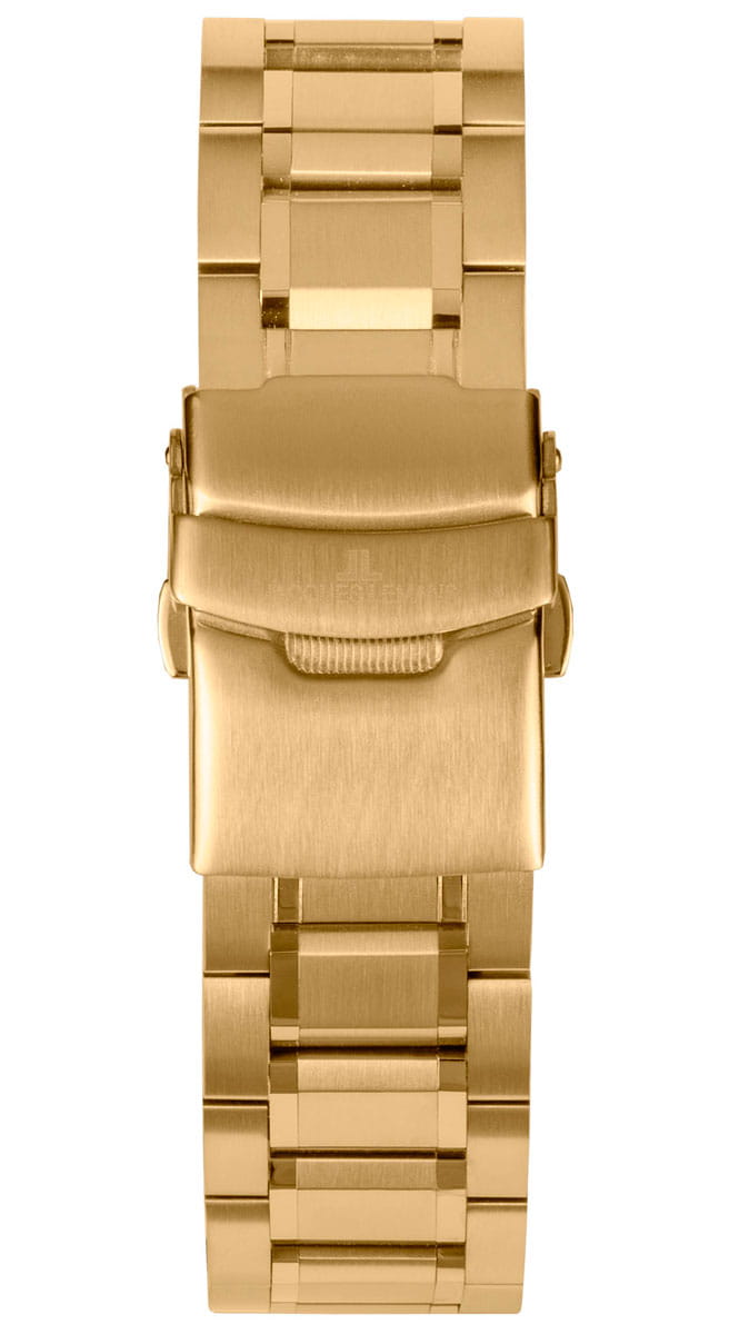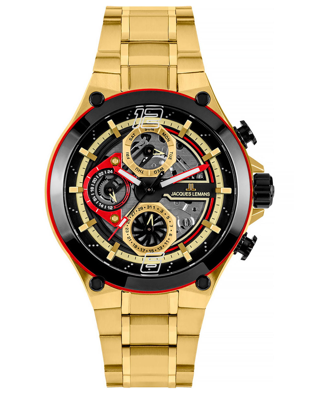 Часы-хронографХронографФункция позволяет измерять отрезки времени с особой точностью: часы, минуты, секунды. Верным признаком хронографа является наличие на циферблате 3 дополнительных окошек-счётчиков.. Повышенная водостойкость составляет 10 атмосфер. Для заводной головки предусмотрена дополнительная защита от внешних воздействий. 44-миллиметровый корпус из нержавеющей стали с PVD-покрытиемPVDУльтратонкое покрытие наносится в технике вакуумного напыления, сочетает в себе нитрид титана особой прочности со слоем золота или оксида хрома. Несёт в себе декоративную или защитную функцию. и с декоративными винтами.
