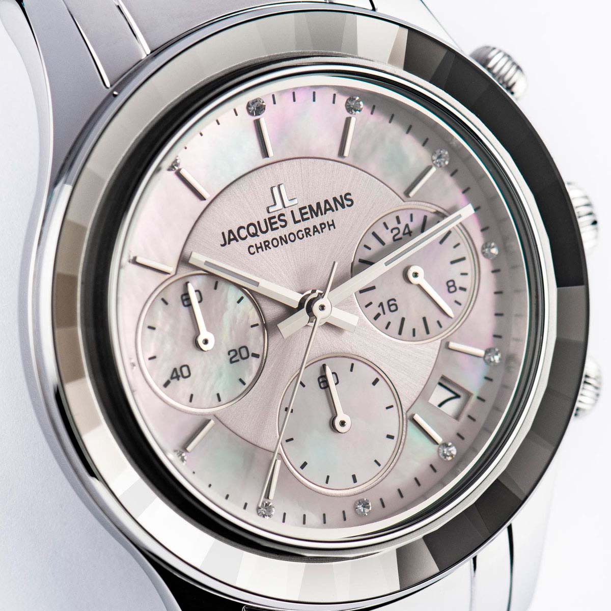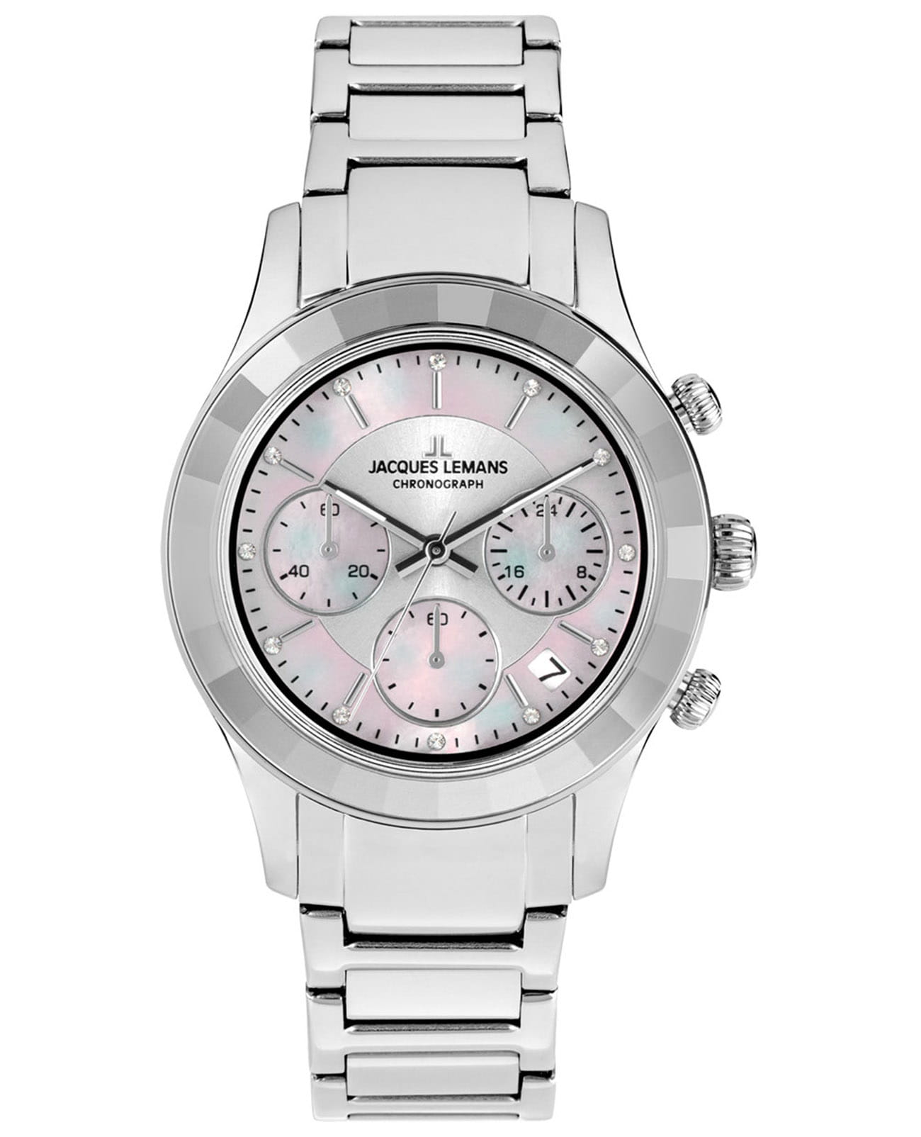 Женские часы Jacques Lemans Venice 1-2151F с минеральным стекломМинеральное стеклоМинеральное стекло представляет собой искусственно выращенный минерал кварца. Такое стекло отличается особой устойчивостью к повреждениям и царапинам. Уступает по некоторым качествам сапфировому стеклу., кварцевый механизм с высокой точностью. Часы- хронографХронографФункция позволяет измерять отрезки времени с особой точностью: часы, минуты, секунды. Верным признаком хронографа является наличие на циферблате 3 дополнительных окошек-счётчиков. с секундомеромСекундомерСекундоме́р — прибор, способный измерять интервалы времени с точностью до долей секунды.. Корпус из нержавеющей стали. На циферблате расположены три дополнительных индикатора и окошко даты. Стрелки с люминесцентным покрытиемЛюминесцентное покрытиеПозволяет считывать показания времени в темноте. Производители наносят на стрелки, часовые индексы, безель или поверхность циферблата светонакопительный состав, дающий холодное свечение.. Каждая накладная риска украшена кристаллом Swarowski. Класс водозащиты: 50 метров, позволит защитить корпус от случайных брызг или капель дождя. Браслет из нержавеющей стали с раскладной застёжкойРаскладная застёжкаТакой тип застёжки используется только на браслетах из металла. Она никогда не раскрывается полностью, происходит разделение на 2 и более частей. Раскладывающая застёжка снизит вероятность потери часов к минимуму..