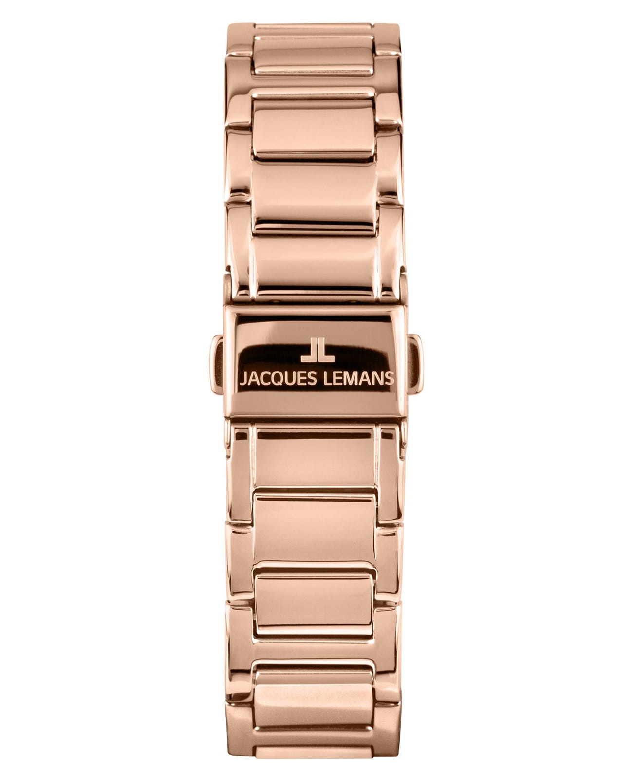 Женские часы-хронографХронографФункция позволяет измерять отрезки времени с особой точностью: часы, минуты, секунды. Верным признаком хронографа является наличие на циферблате 3 дополнительных окошек-счётчиков. c секундомеромСекундомерСекундоме́р — прибор, способный измерять интервалы времени с точностью до долей секунды. Jacques Lemans Venice 1-2151i, кварцевый механизм с высокой точностью. Минеральное стеклоМинеральное стеклоМинеральное стекло представляет собой искусственно выращенный минерал кварца. Такое стекло отличается особой устойчивостью к повреждениям и царапинам. Уступает по некоторым качествам сапфировому стеклу. устойчивое к мелким механическим повреждениям. Корпус из нержавеющей стали с PVDPVDУльтратонкое покрытие наносится в технике вакуумного напыления, сочетает в себе нитрид титана особой прочности со слоем золота или оксида хрома. Несёт в себе декоративную или защитную функцию. покрытием. Широкий безельБезельВнешний ободок, закрепляющий стекло. В спортивных часах так называется поворотное кольцо с делениями на циферблате, выполняет роль таймера – замеряет отрезки времени на шкале. Неподвижный безель – элемент декора. Однонаправленно вращающийся безель на дайверских часах позволяет фиксировать моменты погружения и выныривания на поверхность. с гранями. На циферблате расположены три дополнительных индикатора. Окошко даты находится в положении между 4 и 5 часов. Стрелки с люминесцентным покрытиемЛюминесцентное покрытиеПозволяет считывать показания времени в темноте. Производители наносят на стрелки, часовые индексы, безель или поверхность циферблата светонакопительный состав, дающий холодное свечение.. Каждая накладная риска украшена кристаллом Swarowski. Класс водозащиты: 50 метров, позволит защитить корпус от случайных брызг или капель дождя. Браслет из нержавеющей стали с PVDPVDУльтратонкое покрытие наносится в технике вакуумного напыления, сочетает в себе нитрид титана особой прочности со слоем золота или оксида хрома. Несёт в себе декоративную или защитную функцию. покрытием на раскладной застёжкеРаскладная застёжкаТакой тип застёжки используется только на браслетах из металла. Она никогда не раскрывается полностью, происходит разделение на 2 и более частей. Раскладывающая застёжка снизит вероятность потери часов к минимуму..
