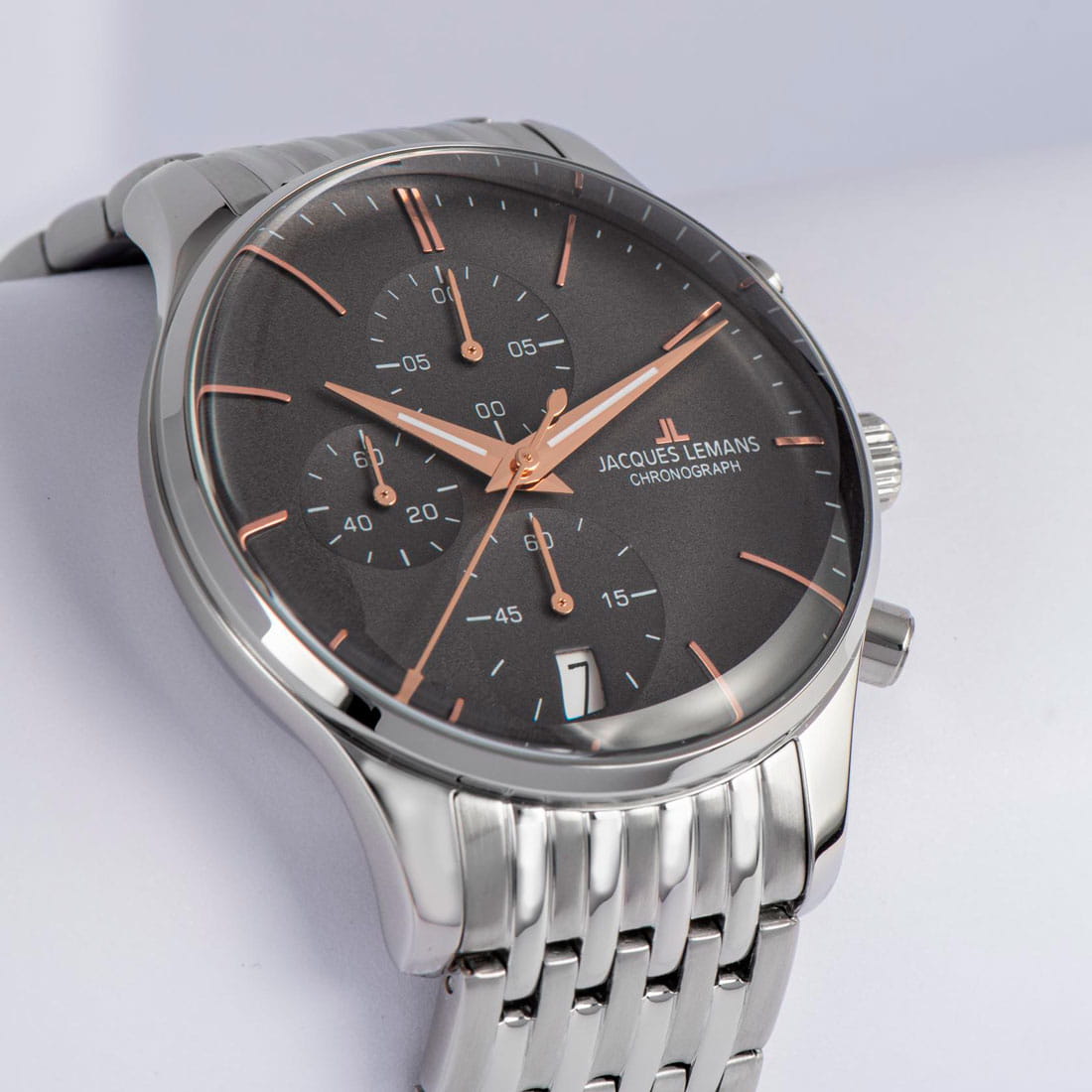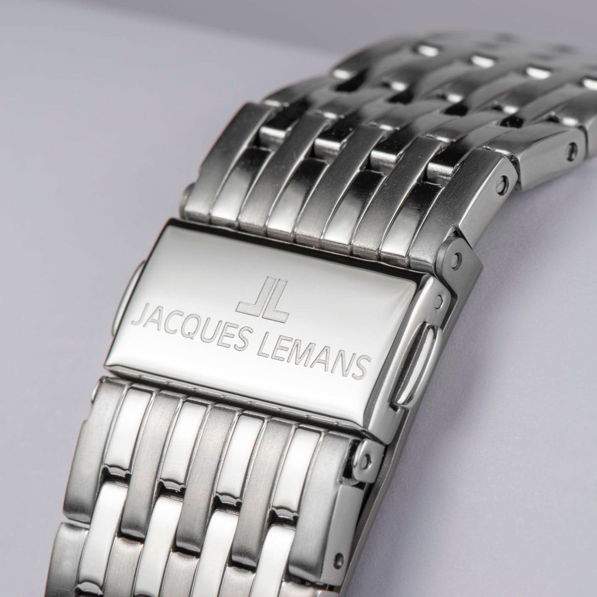 Мужские часы Jacques London 1-2163i с минеральным стекломМинеральное стеклоМинеральное стекло представляет собой искусственно выращенный минерал кварца. Такое стекло отличается особой устойчивостью к повреждениям и царапинам. Уступает по некоторым качествам сапфировому стеклу., кварцевый механизм с высокой точностью.СекундомерСекундомерСекундоме́р — прибор, способный измерять интервалы времени с точностью до долей секунды.. Часы- хронографХронографФункция позволяет измерять отрезки времени с особой точностью: часы, минуты, секунды. Верным признаком хронографа является наличие на циферблате 3 дополнительных окошек-счётчиков.. Корпус часов из нержавеющей стали. Класс водозащиты: 50 метров, позволит защитить корпус от случайных брызг или капель дождя. Стальной браслет на раскладной застёжкеРаскладная застёжкаТакой тип застёжки используется только на браслетах из металла. Она никогда не раскрывается полностью, происходит разделение на 2 и более частей. Раскладывающая застёжка снизит вероятность потери часов к минимуму.. Окошко даты в положении 6 часов. Метки в виде штрихов. Стрелки с люминесцентным покрытиемЛюминесцентное покрытиеПозволяет считывать показания времени в темноте. Производители наносят на стрелки, часовые индексы, безель или поверхность циферблата светонакопительный состав, дающий холодное свечение..