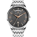 Мужские часы Jacques Lemans 1-2193I – лаконичная красота и изысканная элегантность. Корпус из нержавеющей стали диаметром 40 мм идеально сбалансирован и элегантен. Ударопрочное минеральное стеклоМинеральное стеклоМинеральное стекло представляет собой искусственно выращенный минерал кварца. Такое стекло отличается особой устойчивостью к повреждениям и царапинам. Уступает по некоторым качествам сапфировому стеклу. Crystex защищает циферблат от царапин. Стальной браслет на застёжке-бабочке с кнопкамиЗастёжка "бабочка"Такой вид застёжки дополняется предохранителями, помогающими избежать случайного раскрытия браслета. Обладают изящным исполнением. . Крупные накладные риски хорошо читаются благодаря PVD-покрытиюPVDУльтратонкое покрытие наносится в технике вакуумного напыления, сочетает в себе нитрид титана особой прочности со слоем золота или оксида хрома. Несёт в себе декоративную или защитную функцию. из розового золота. Водозащита 50 метров защищает часы от брызг и дождя, делая их подходящими для повседневного использования. Стрелки и метки с люминесцентным покрытиемЛюминесцентное покрытиеПозволяет считывать показания времени в темноте. Производители наносят на стрелки, часовые индексы, безель или поверхность циферблата светонакопительный состав, дающий холодное свечение. позволяющие легко определять время даже в темноте. Окошко даты находится в положении 6 часов. Широкое окошко дня недели в положении 12 часов позволяет показывать название дня недели полностью, без сокращений.