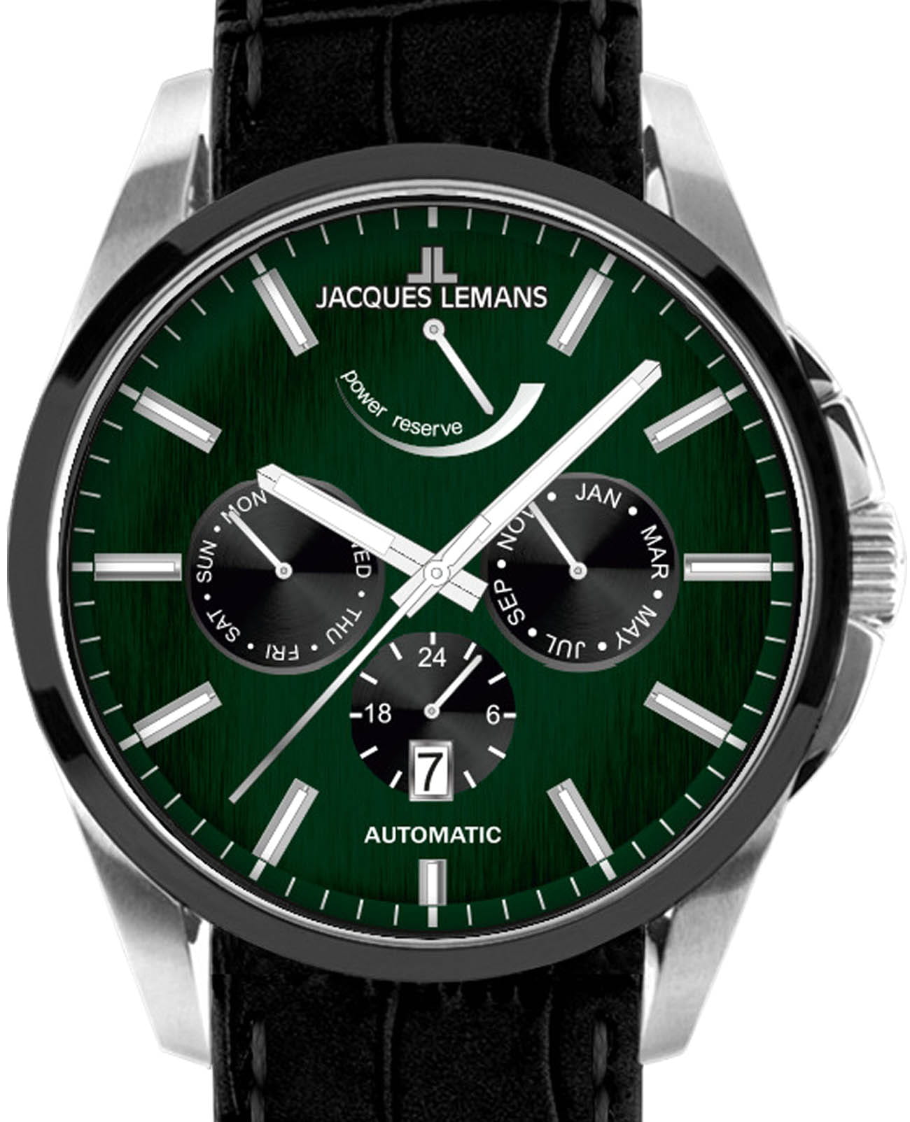 Мужские механические часы с автоподзаводом Jacques Lemans 1-2204N – лаконичная красота и изысканная элегантность. Оригинальная модель с классическим оформлением станет превосходным завершением образа, наделив его индивидуальным характером. Корпус выполнен из нержавеющей стали серебристого цвета, диаметром 44 мм, что обеспечивает долговечность и утончённый внешний вид. Минеральное стеклоМинеральное стеклоМинеральное стекло представляет собой искусственно выращенный минерал кварца. Такое стекло отличается особой устойчивостью к повреждениям и царапинам. Уступает по некоторым качествам сапфировому стеклу. с сапфировым напылением защищает циферблат от царапин. Неподвижный безельБезельВнешний ободок, закрепляющий стекло. В спортивных часах так называется поворотное кольцо с делениями на циферблате, выполняет роль таймера – замеряет отрезки времени на шкале. Неподвижный безель – элемент декора. Однонаправленно вращающийся безель на дайверских часах позволяет фиксировать моменты погружения и выныривания на поверхность. с PVD-покрытиемPVDУльтратонкое покрытие наносится в технике вакуумного напыления, сочетает в себе нитрид титана особой прочности со слоем золота или оксида хрома. Несёт в себе декоративную или защитную функцию. черного цвета. Кожаный ремешок на стандартной застёжке обеспечивает комфортное ношение. Водозащита 100 метров позволит плавать, нырять и заниматься другими водными видами спорта. Стрелки и метки с люминесцентным покрытиемЛюминесцентное покрытиеПозволяет считывать показания времени в темноте. Производители наносят на стрелки, часовые индексы, безель или поверхность циферблата светонакопительный состав, дающий холодное свечение. позволяющие легко определять время даже в темноте. 12-ти и 24-х часовой формат времени. День недели и месяц вынесены на отдельные циферблаты. Окошко даты находится в положении 6 часов. Рифленая заводная головка с защитой. Это аксессуар для мужчины, который ценит классический стиль и функциональность.