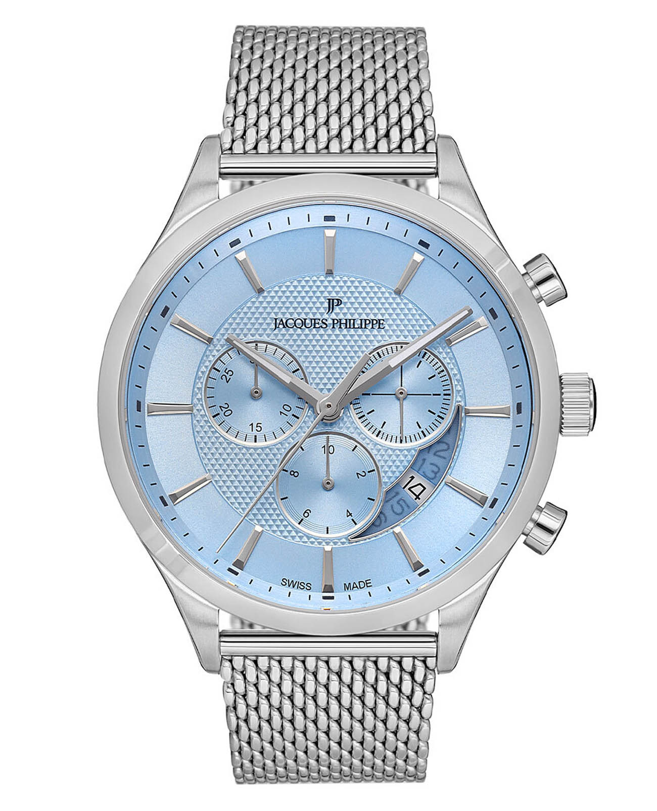 Швейцарские мужские часы-хронографХронографФункция позволяет измерять отрезки времени с особой точностью: часы, минуты, секунды. Верным признаком хронографа является наличие на циферблате 3 дополнительных окошек-счётчиков. Jacques Philippe Gallant JPQGC0312X6LB, кварцевый механизм с высокой точностью. Сапфировое стеклоСапфировое стеклоПрочный и надёжный материал из кристалла сапфира синтетического происхождения, характеризующийся особой твёрдостью и устойчивостью к царапинам и повреждениям. устойчивое к появлению царапин, обладающее высокой прозрачностью. Корпус часов изготовлен из нержавеющей стали. На циферблате три дополнительных индикатора. Стрелки с люминесцентным покрытиемЛюминесцентное покрытиеПозволяет считывать показания времени в темноте. Производители наносят на стрелки, часовые индексы, безель или поверхность циферблата светонакопительный состав, дающий холодное свечение.. Окошко даты находится между 4 и 5 часами. Класс водозащиты: 50 метров, позволит защитить корпус от случайных брызг или капель дождя. Стальной браслет миланского плетения на раскладном замкеРаскладной замокДанный вариант застежки используется только на часах с металлическим браслетом. Отличительная особенность такого крепления в том, что длина браслета становится универсальной и вы можете самостоятельно отрегулировать нужный вам размер – застежка просто двигается по браслету часов..