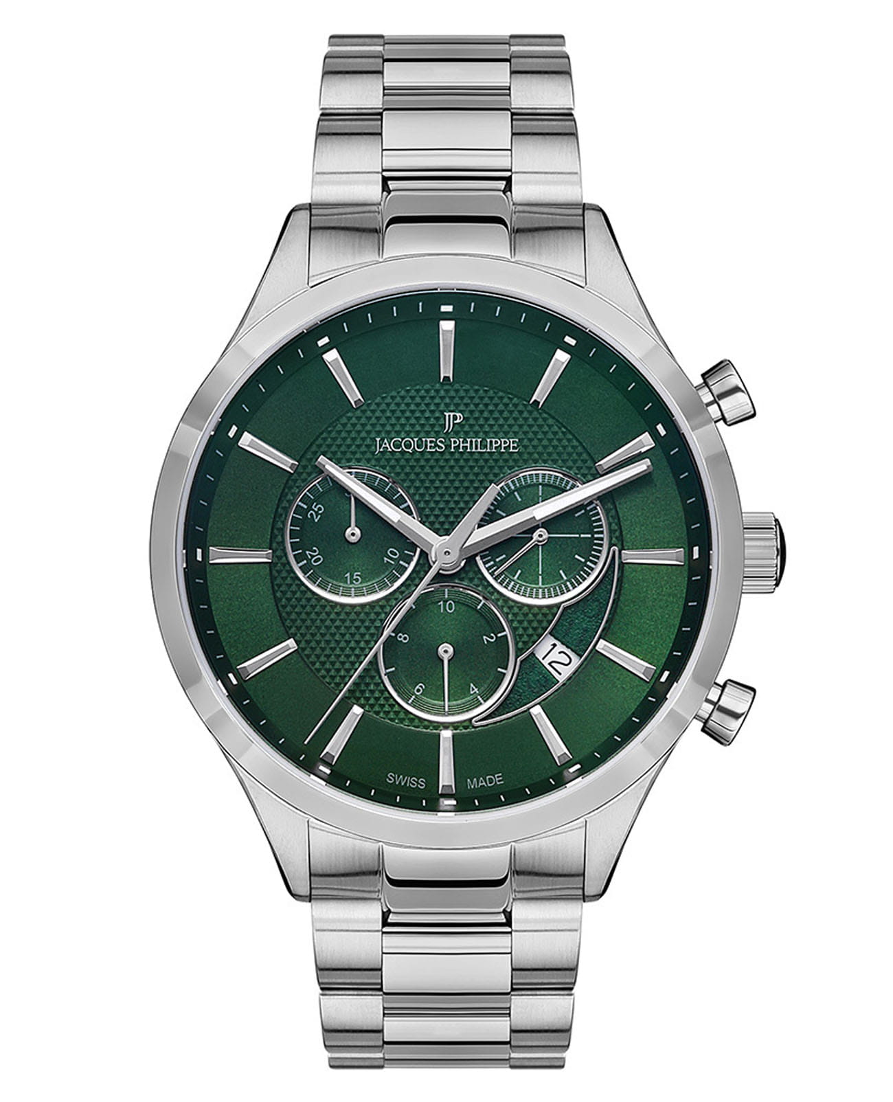Швейцарские мужские часы-хронографХронографФункция позволяет измерять отрезки времени с особой точностью: часы, минуты, секунды. Верным признаком хронографа является наличие на циферблате 3 дополнительных окошек-счётчиков. Jacques Philippe Gallant JPQGC0313X6, кварцевый механизм с высокой точностью. Сапфировое стеклоСапфировое стеклоПрочный и надёжный материал из кристалла сапфира синтетического происхождения, характеризующийся особой твёрдостью и устойчивостью к царапинам и повреждениям. устойчивое к появлению царапин, обладающее высокой прозрачностью. Корпус часов изготовлен из нержавеющей стали. На циферблате три дополнительных индикатора. Стрелки с люминесцентным покрытиемЛюминесцентное покрытиеПозволяет считывать показания времени в темноте. Производители наносят на стрелки, часовые индексы, безель или поверхность циферблата светонакопительный состав, дающий холодное свечение.. Окошко даты находится между 4 и 5 часами. Класс водозащиты: 50 метров, позволит защитить корпус от случайных брызг или капель дождя. Стальной браслет на застёжке «бабочка» с кнопкамиЗастёжка "бабочка"Такой вид застёжки дополняется предохранителями, помогающими избежать случайного раскрытия браслета. Обладают изящным исполнением. .