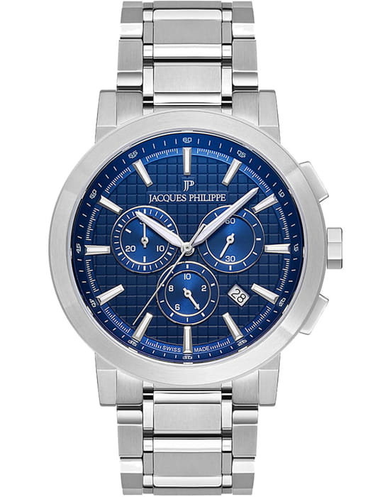Швейцарские мужские часы-хронографХронографФункция позволяет измерять отрезки времени с особой точностью: часы, минуты, секунды. Верным признаком хронографа является наличие на циферблате 3 дополнительных окошек-счётчиков. с секундомеромСекундомерСекундоме́р — прибор, способный измерять интервалы времени с точностью до долей секунды. Jacques Philippe Round JPQGC171336, кварцевый механизм с высокой точностью. Сапфировое стеклоСапфировое стеклоПрочный и надёжный материал из кристалла сапфира синтетического происхождения, характеризующийся особой твёрдостью и устойчивостью к царапинам и повреждениям. устойчивое к появлению царапин, обладающее высокой прозрачностью. Корпус часов изготовлен из нержавеющей стали. На циферблате три дополнительных индикатора. Стрелки с люминесцентным покрытиемЛюминесцентное покрытиеПозволяет считывать показания времени в темноте. Производители наносят на стрелки, часовые индексы, безель или поверхность циферблата светонакопительный состав, дающий холодное свечение.. Окошко даты находится между 4 и 5 часами. Класс водозащиты: 50 метров, позволит защитить корпус от случайных брызг или капель дождя. Стальной браслет на застёжке «бабочка» с кнопкамиЗастёжка "бабочка"Такой вид застёжки дополняется предохранителями, помогающими избежать случайного раскрытия браслета. Обладают изящным исполнением. .