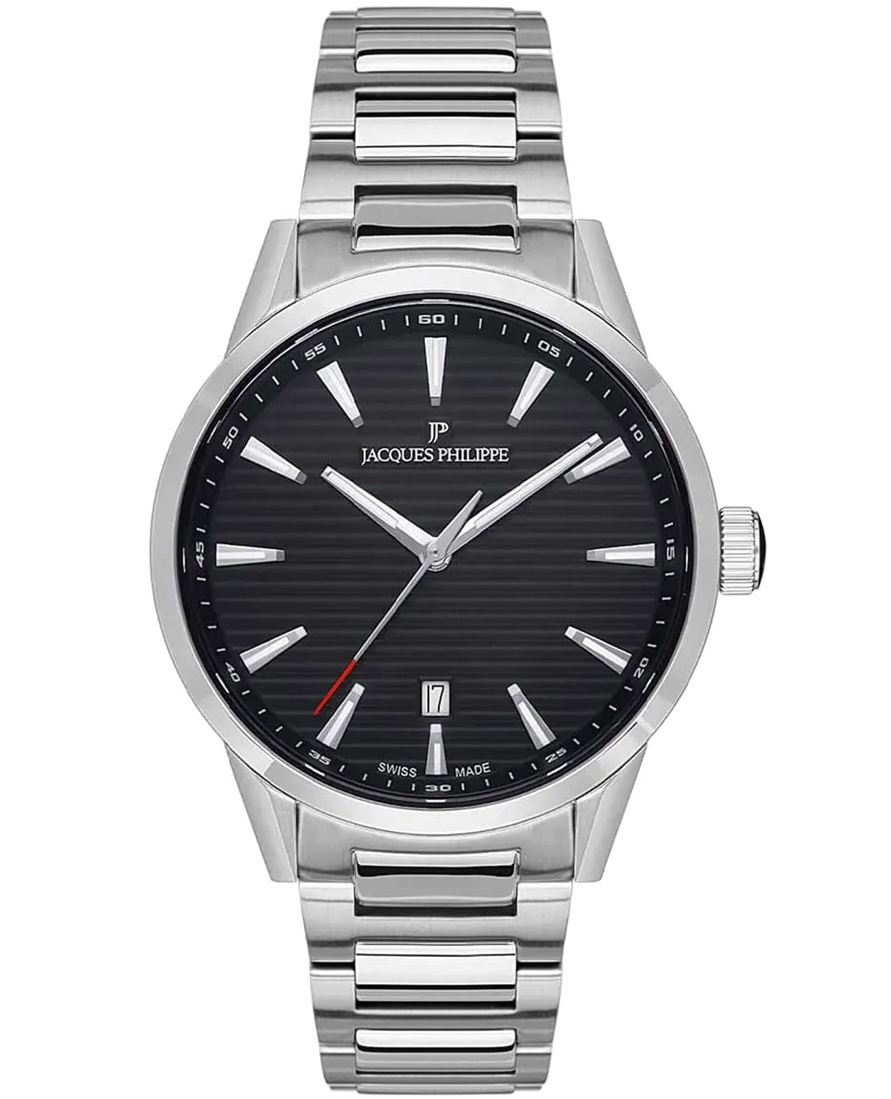 Швейцарские мужские часы Jacques Philippe Aspect JPQGS091316N кварцевый механизм с высокой точностью. Прочное сапфировое стеклоСапфировое стеклоПрочный и надёжный материал из кристалла сапфира синтетического происхождения, характеризующийся особой твёрдостью и устойчивостью к царапинам и повреждениям. устойчивое к появлению царапин, обладающее высокой прозрачностью. Циферблат черного цвета украшен классическими стрелками и метками с люминесцентным покрытиемЛюминесцентное покрытиеПозволяет считывать показания времени в темноте. Производители наносят на стрелки, часовые индексы, безель или поверхность циферблата светонакопительный состав, дающий холодное свечение., гармонично дополняющим общий дизайн модели. Элегантный корпус изготовлен из нержавеющей стали, диаметром 41 мм, что делает их устойчивыми к внешним воздействиям и придает благородный вид. Стальной браслет на раскладной застёжке м фиксаторомРаскладная застёжкаТакой тип застёжки используется только на браслетах из металла. Она никогда не раскрывается полностью, происходит разделение на 2 и более частей. Раскладывающая застёжка снизит вероятность потери часов к минимуму. обеспечивает комфортное и безопасное ношение. Окошко даты находится в положении 6 часов. Класс водозащиты: 50 метров позволит защитить корпус от случайных брызг или капель дождя. Эти часы станут идеальным выбором для мужчин, ценящих стиль, качество и функциональность.