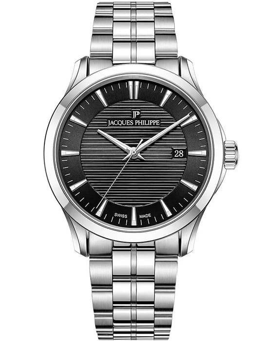 Jacques Philippe JPQGS791316 — стильные мужские часы в классическом формате с акцентом на надёжность и элегантность. Корпус круглой формы диаметром 40 мм из нержавеющей стали отличается утонченным силуэтом, обеспечивая комфорт при длительном ношении . Циферблат оформлен лаконично: тонкие стрелки и минималистичные часовые метки с люминесцентным покрытиемЛюминесцентное покрытиеПозволяет считывать показания времени в темноте. Производители наносят на стрелки, часовые индексы, безель или поверхность циферблата светонакопительный состав, дающий холодное свечение. подчёркивают строгий характер модели. Встроенная функция отображения даты придаёт часам практичность без лишнего визуального нагромождения. Поверхность защищает сапфировое стеклоСапфировое стеклоПрочный и надёжный материал из кристалла сапфира синтетического происхождения, характеризующийся особой твёрдостью и устойчивостью к царапинам и повреждениям. — устойчивое к царапинам и бликам. Внутри используется точный швейцарский кварцевый механизм, не требующий подзавода и сохраняющий стабильную работу без сложного обслуживания. Модель оснащена металлическим браслетом из нержавеющей стали в оттенке металлик на застёжке-бабочке с кнопкамиЗастёжка "бабочка"Такой вид застёжки дополняется предохранителями, помогающими избежать случайного раскрытия браслета. Обладают изящным исполнением. , что обеспечивает надёжную посадку и солидный внешний вид . Водозащита составляет до 5 ATM, — часы без проблем выдерживают случайный контакт с водой в повседневной эксплуатации . Jacques Philippe — гармоничное сочетание классического стиля, точного швейцарского кварца и практичности в одном надёжном аксессуаре.