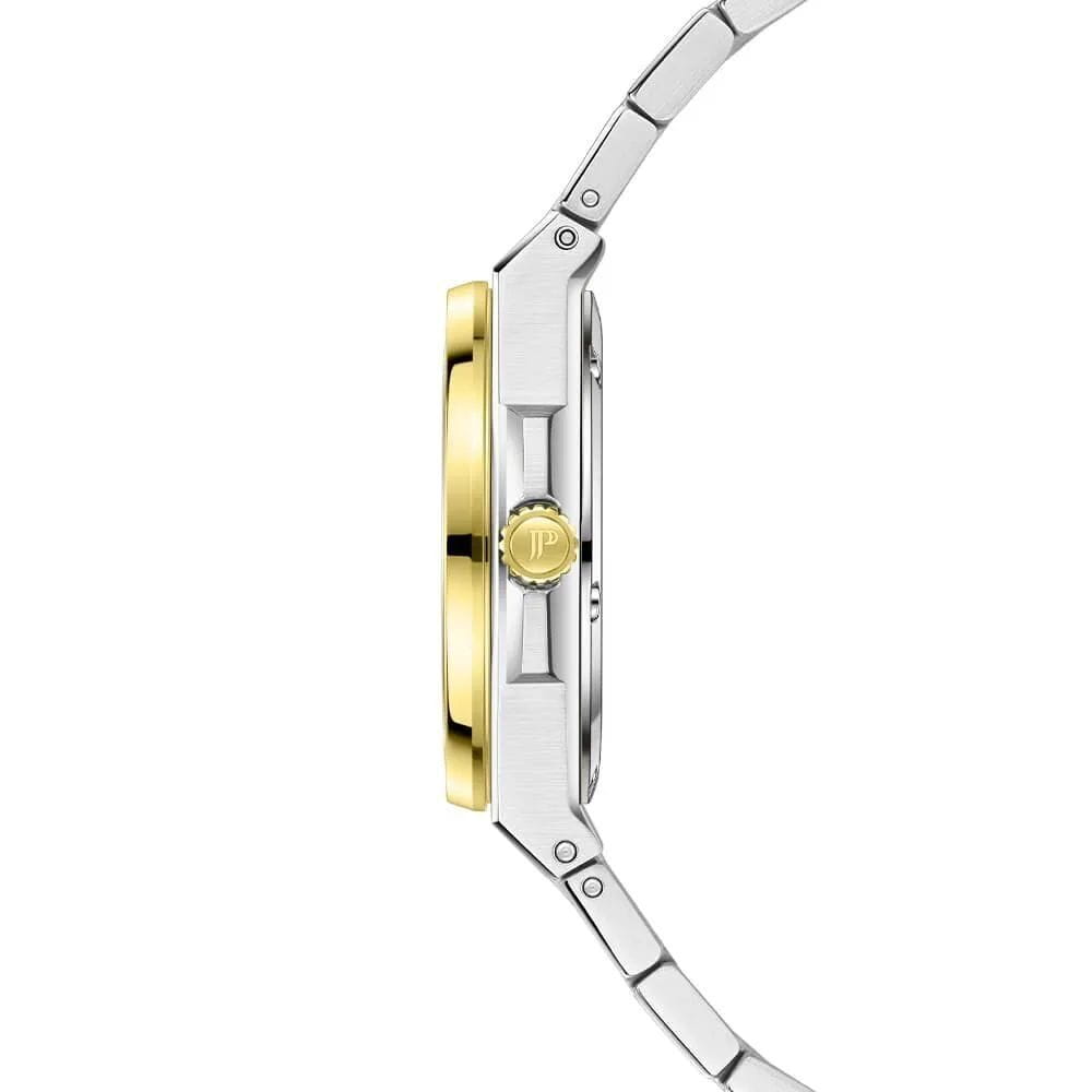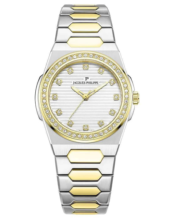 Jacques Philippe Bellus JPQLS727328YG — изящная женская модель коллекции Bellus с точным кварцевым механизмом Swiss Made, где корпус диаметром 33 мм и толщиной 5 мм выполнен из нержавеющей стали, а безельБезельВнешний ободок, закрепляющий стекло. В спортивных часах так называется поворотное кольцо с делениями на циферблате, выполняет роль таймера – замеряет отрезки времени на шкале. Неподвижный безель – элемент декора. Однонаправленно вращающийся безель на дайверских часах позволяет фиксировать моменты погружения и выныривания на поверхность. с PVDPVDУльтратонкое покрытие наносится в технике вакуумного напыления, сочетает в себе нитрид титана особой прочности со слоем золота или оксида хрома. Несёт в себе декоративную или защитную функцию.-покрытием инкрустирован кристаллами, придающими модели утончённый блеск. Выпуклое сапфировое стеклоСапфировое стеклоПрочный и надёжный материал из кристалла сапфира синтетического происхождения, характеризующийся особой твёрдостью и устойчивостью к царапинам и повреждениям. обеспечивает высокую стойкость к царапинам и сохраняет прозрачность. Водозащита составляет 5 ATM (50 м). Браслет из нержавеющей стали с PVDPVDУльтратонкое покрытие наносится в технике вакуумного напыления, сочетает в себе нитрид титана особой прочности со слоем золота или оксида хрома. Несёт в себе декоративную или защитную функцию.-покрытием гармонично завершает дизайн, подчёркивая элегантность и целостность образа.