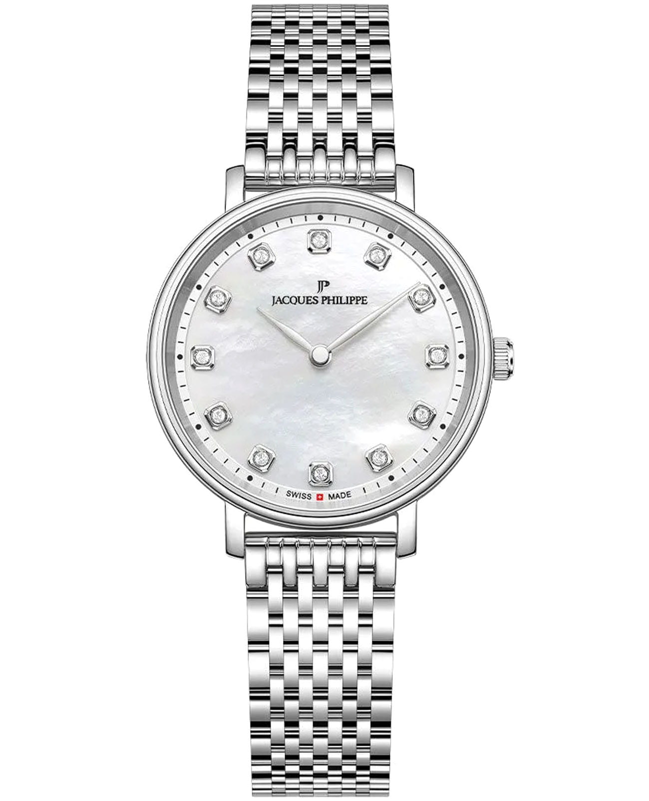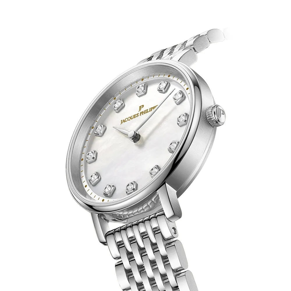 Швейцарские женские часы Jacques Philippe Vitalicus JPQLS751386 кварцевый механизм с высокой точностью. Прочное сапфировое стеклоСапфировое стеклоПрочный и надёжный материал из кристалла сапфира синтетического происхождения, характеризующийся особой твёрдостью и устойчивостью к царапинам и повреждениям. устойчивое к царапинам и механическим повреждениям. Циферблат серебристого цвета украшен кристаллами в виде меток и классическими стрелками, что гармонично дополняет общий дизайн модели. Элегантный корпус изготовлен из нержавеющей стали, диаметром 31 мм, что делает их устойчивыми к внешним воздействиям и придает благородный вид. Стальной браслет на застёжке-бабочке с кнопкамиЗастёжка "бабочка"Такой вид застёжки дополняется предохранителями, помогающими избежать случайного раскрытия браслета. Обладают изящным исполнением. обеспечивает комфортное и безопасное ношение. Класс водозащиты: 50 метров позволит защитить корпус от случайных брызг или капель дождя. Эти часы станут идеальным выбором для женщин, ценящих стиль, качество и функциональность и элегантность.
