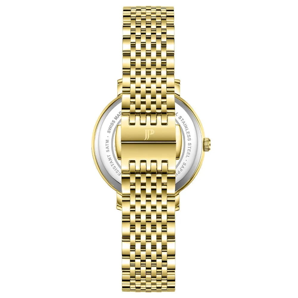 Швейцарские женские часы Jacques Philippe Vitalicus JPQLS752384 кварцевый механизм с высокой точностью. Прочное сапфировое стеклоСапфировое стеклоПрочный и надёжный материал из кристалла сапфира синтетического происхождения, характеризующийся особой твёрдостью и устойчивостью к царапинам и повреждениям. устойчивое к царапинам и механическим повреждениям. Циферблат серебристого цвета украшен кристаллами в виде меток и классическими стрелками, что гармонично дополняет общий дизайн модели. Элегантный корпус изготовлен из нержавеющей стали с IP-покрытиемIP-покрытиеМетод ионного напыления. Демонстрирует повышенную устойчивость к истиранию, окислению и химическим веществам. Под воздействием высокого давления и температуры около 1500°C молекулы металла надёжно соединяются с частицами корпуса часов. золотистого цвета, диаметром 31 мм, что делает их устойчивыми к внешним воздействиям и придает благородный вид. Стальной браслет с IP-покрытиемIP-покрытиеМетод ионного напыления. Демонстрирует повышенную устойчивость к истиранию, окислению и химическим веществам. Под воздействием высокого давления и температуры около 1500°C молекулы металла надёжно соединяются с частицами корпуса часов. на застёжке-бабочке с кнопкамиЗастёжка "бабочка"Такой вид застёжки дополняется предохранителями, помогающими избежать случайного раскрытия браслета. Обладают изящным исполнением. обеспечивает комфортное и безопасное ношение. Класс водозащиты: 50 метров позволит защитить корпус от случайных брызг или капель дождя. Эти часы станут идеальным выбором для женщин, ценящих стиль, качество и функциональность и элегантность.