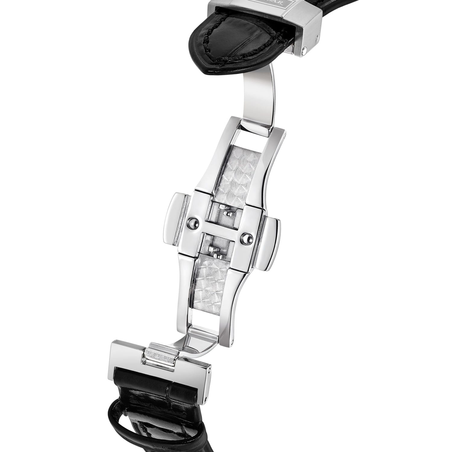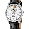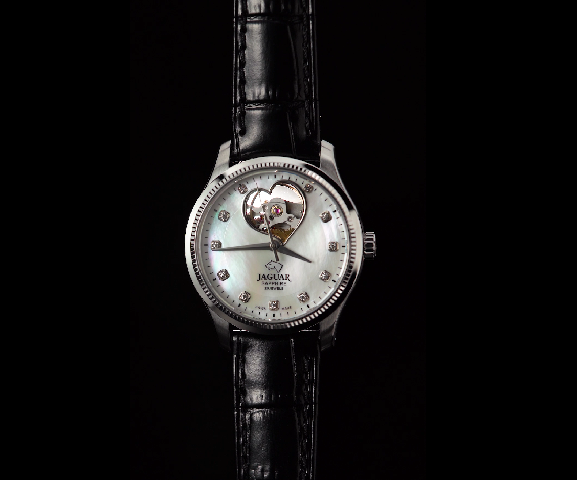 Женские швейцарские часы JAGUAR Automatic Open Heart J994/A, механизм — автоподзавод. В часах с автоподзаводом заводная головка практически не используется, что исключает истирание ее материала и материала корпуса. Сапфировое стеклоСапфировое стеклоПрочный и надёжный материал из кристалла сапфира синтетического происхождения, характеризующийся особой твёрдостью и устойчивостью к царапинам и повреждениям. устойчивое к мелким механическим повреждениям. Корпус и браслет часов изготовлены из нержавеющей стали. Класс водозащиты: 50 метров, позволит защитить корпус от случайных брызг или капель дождя. Циферблат украшен кристаллами в роли часовых индексов, крупная апертура в виде сердца, открывающая обзор на балансовое колесо механизма. Кожаный ремешок на застёжке «бабочке» с кнопкамиЗастёжка "бабочка"Такой вид застёжки дополняется предохранителями, помогающими избежать случайного раскрытия браслета. Обладают изящным исполнением. .